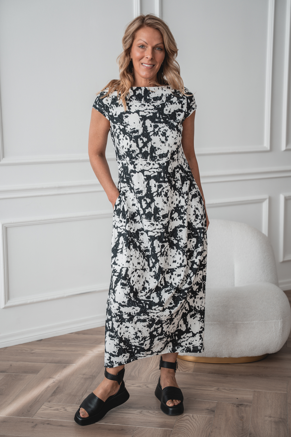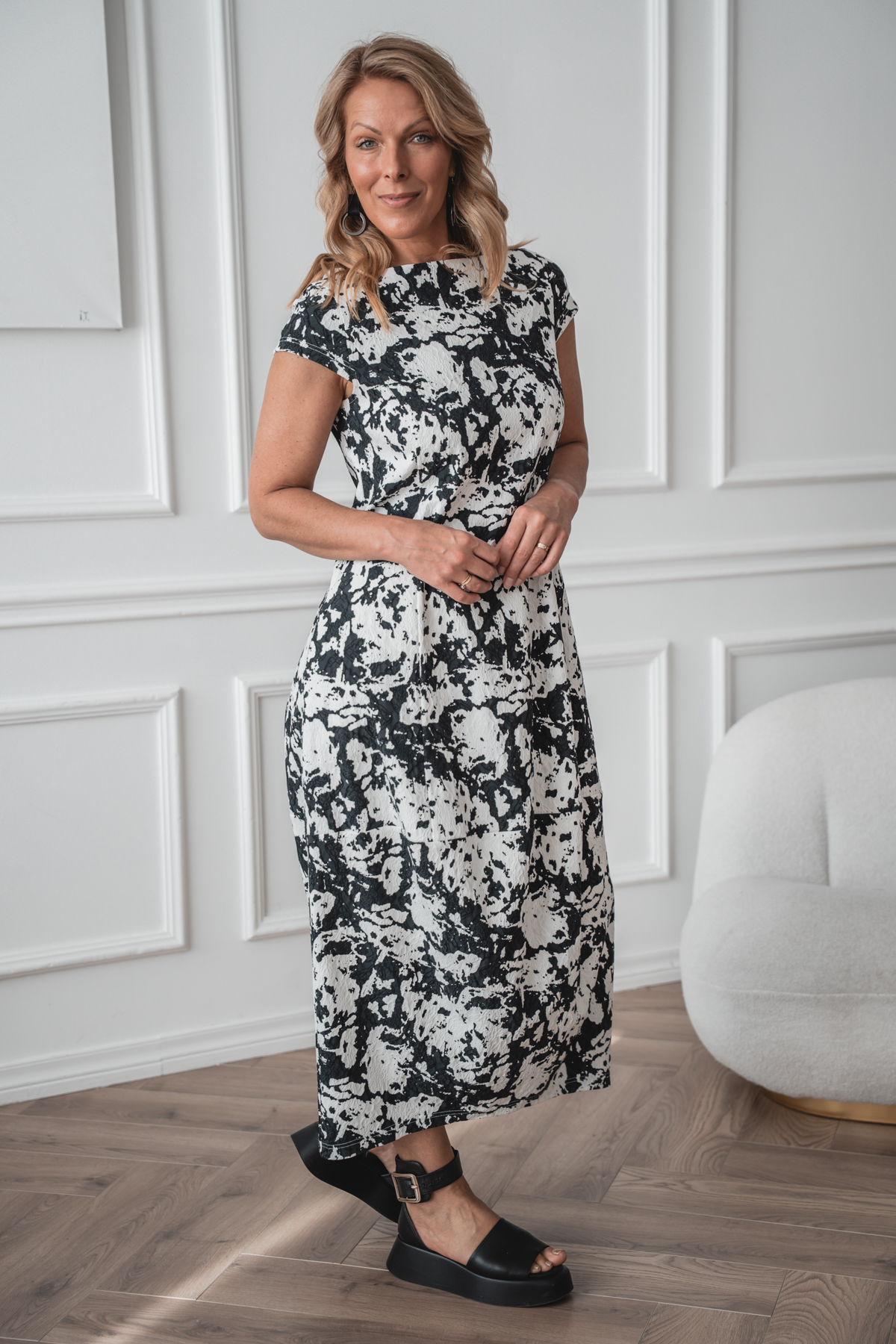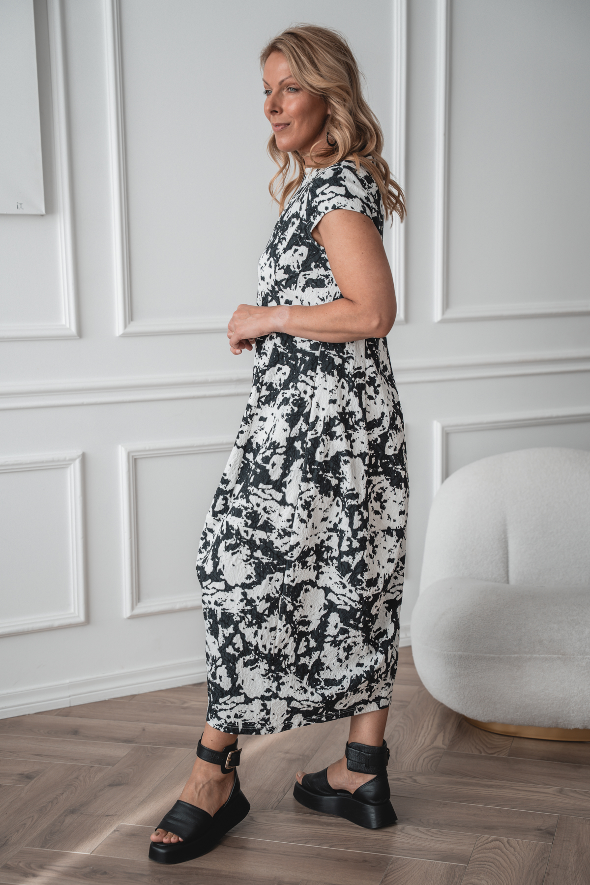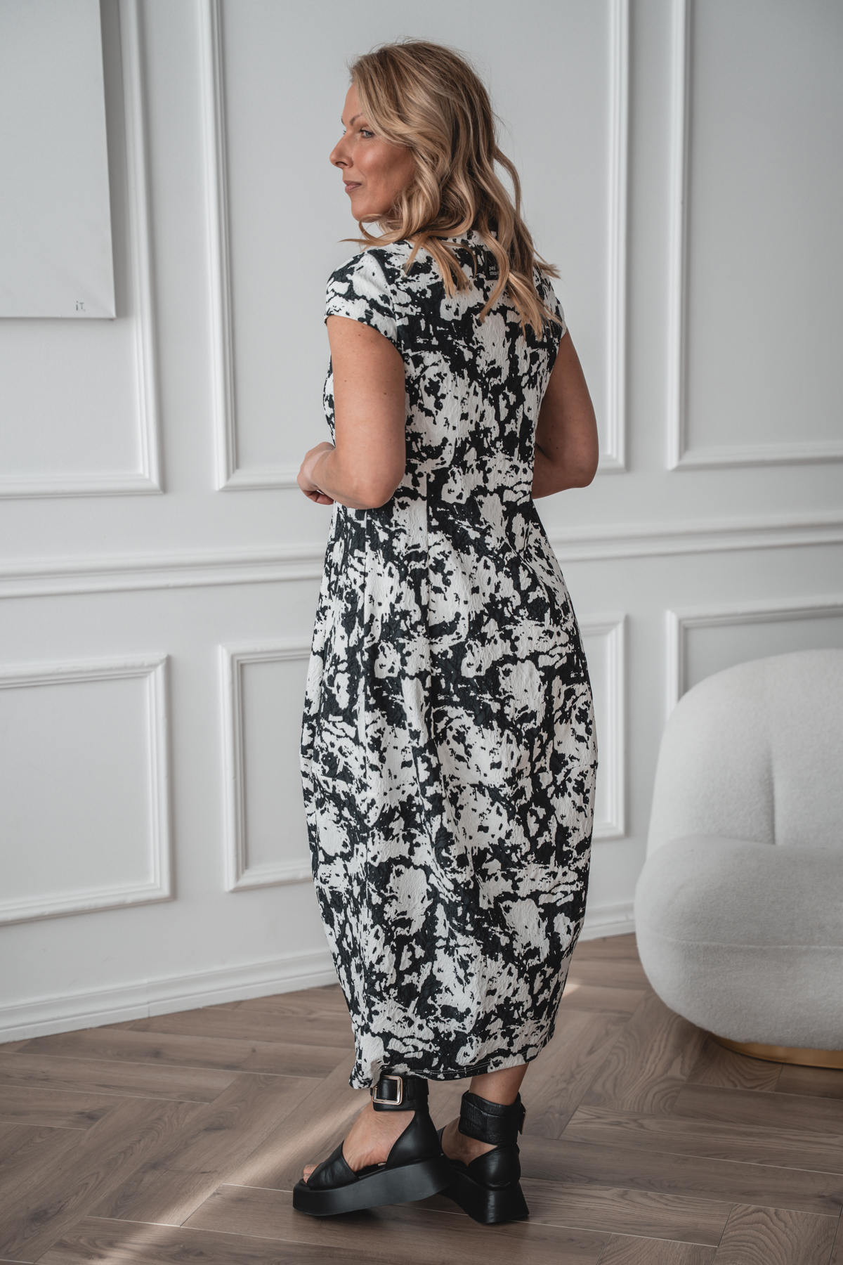 Akarui, midi balloon dress, black and white
