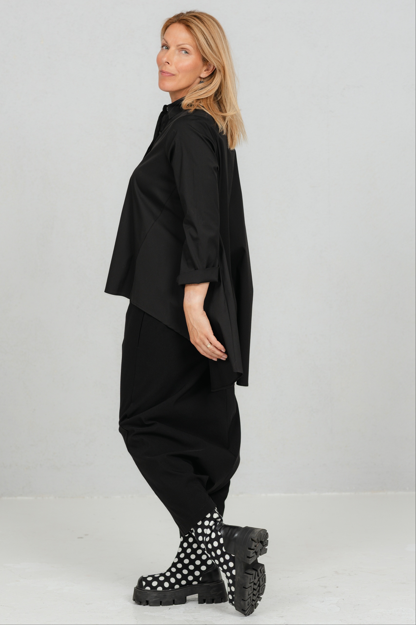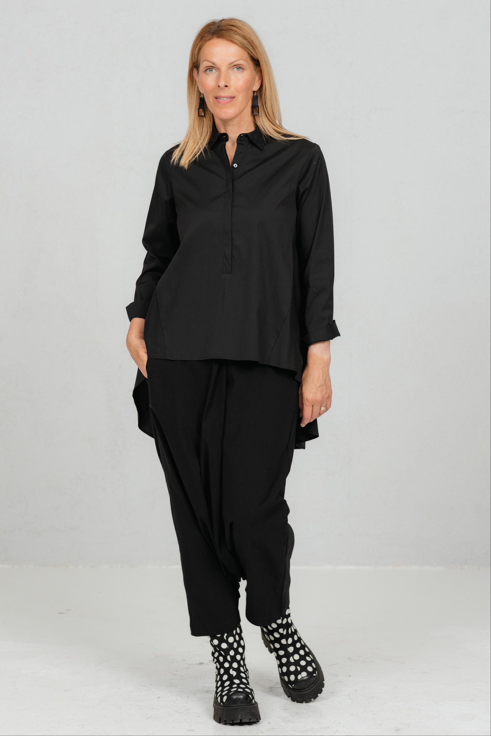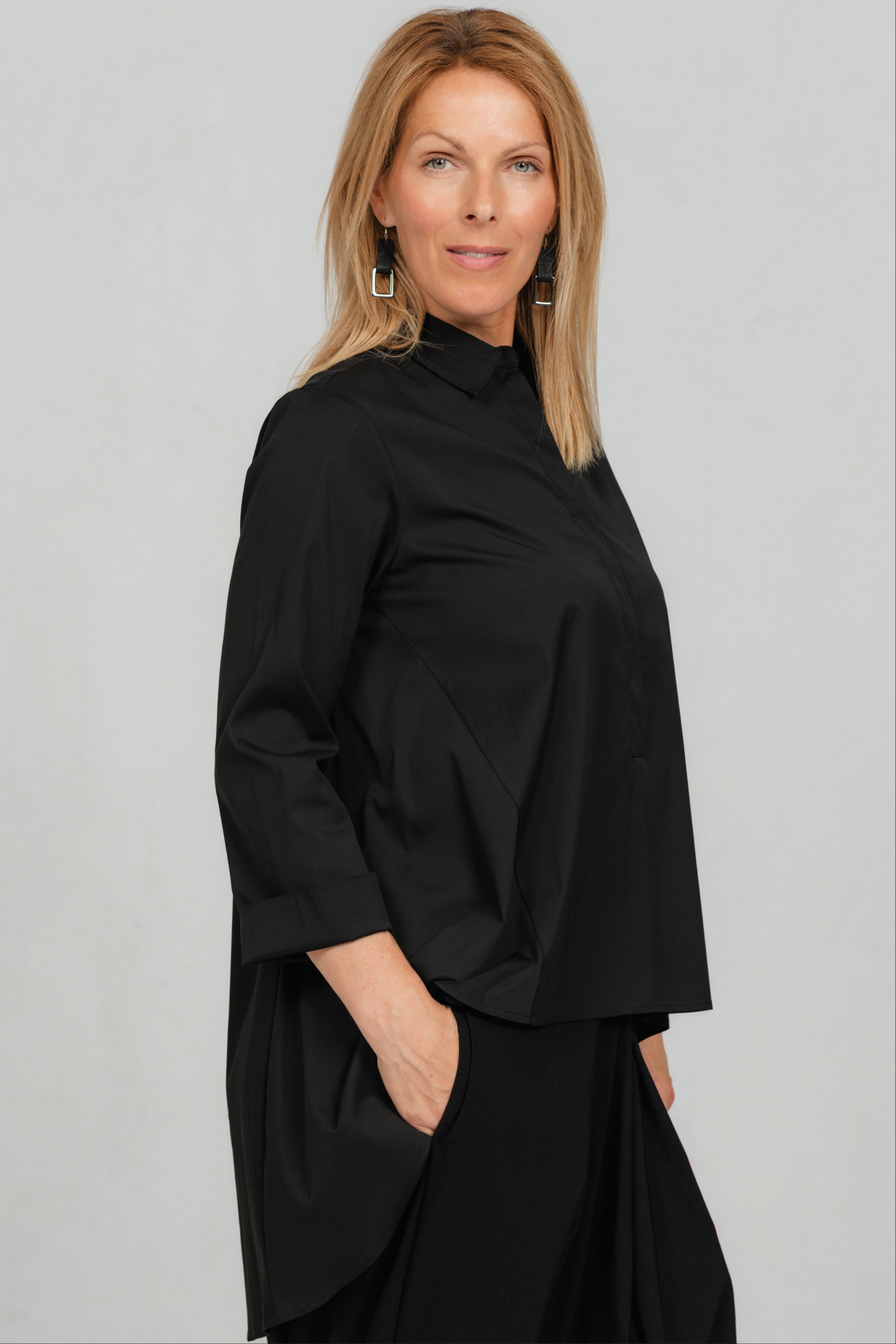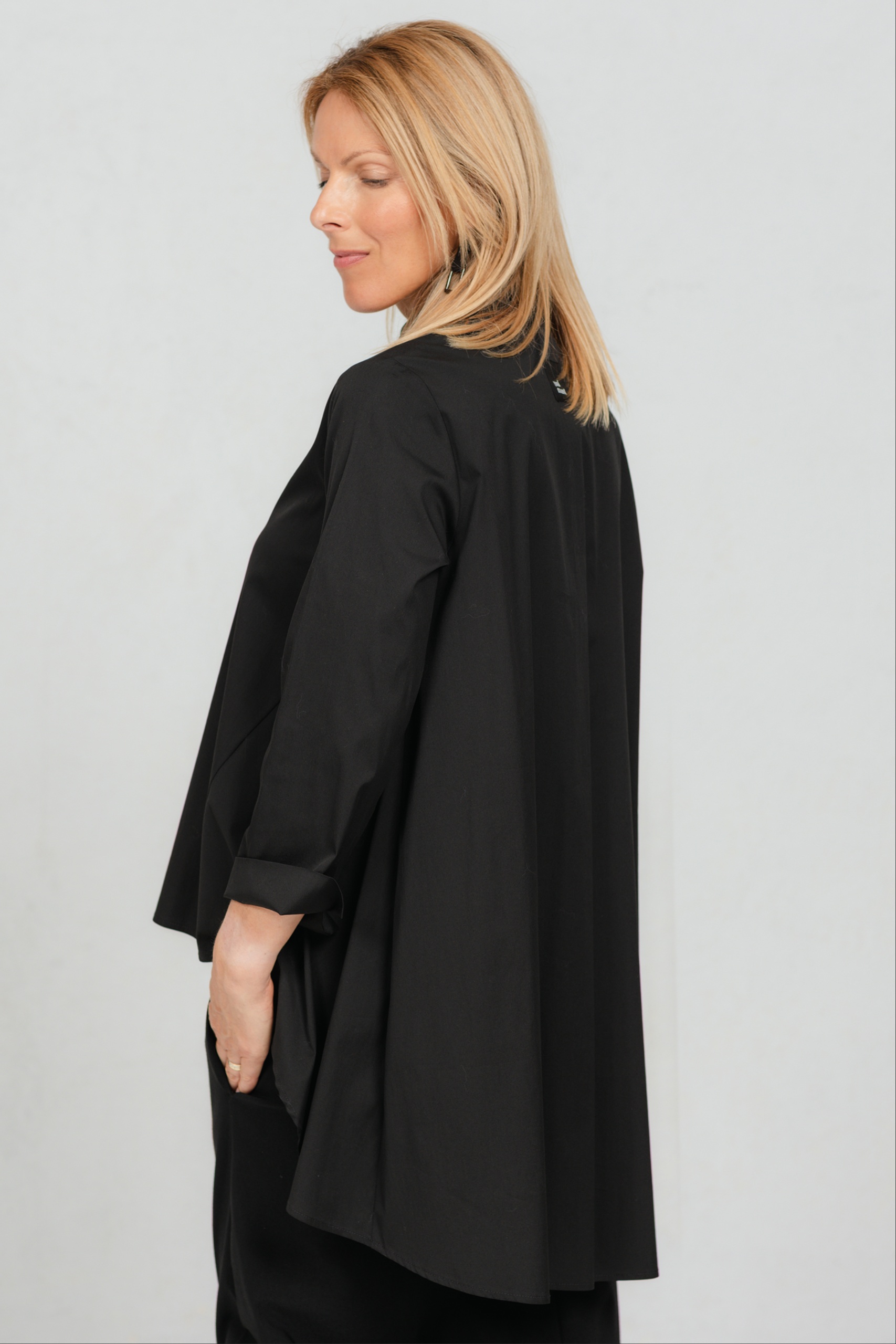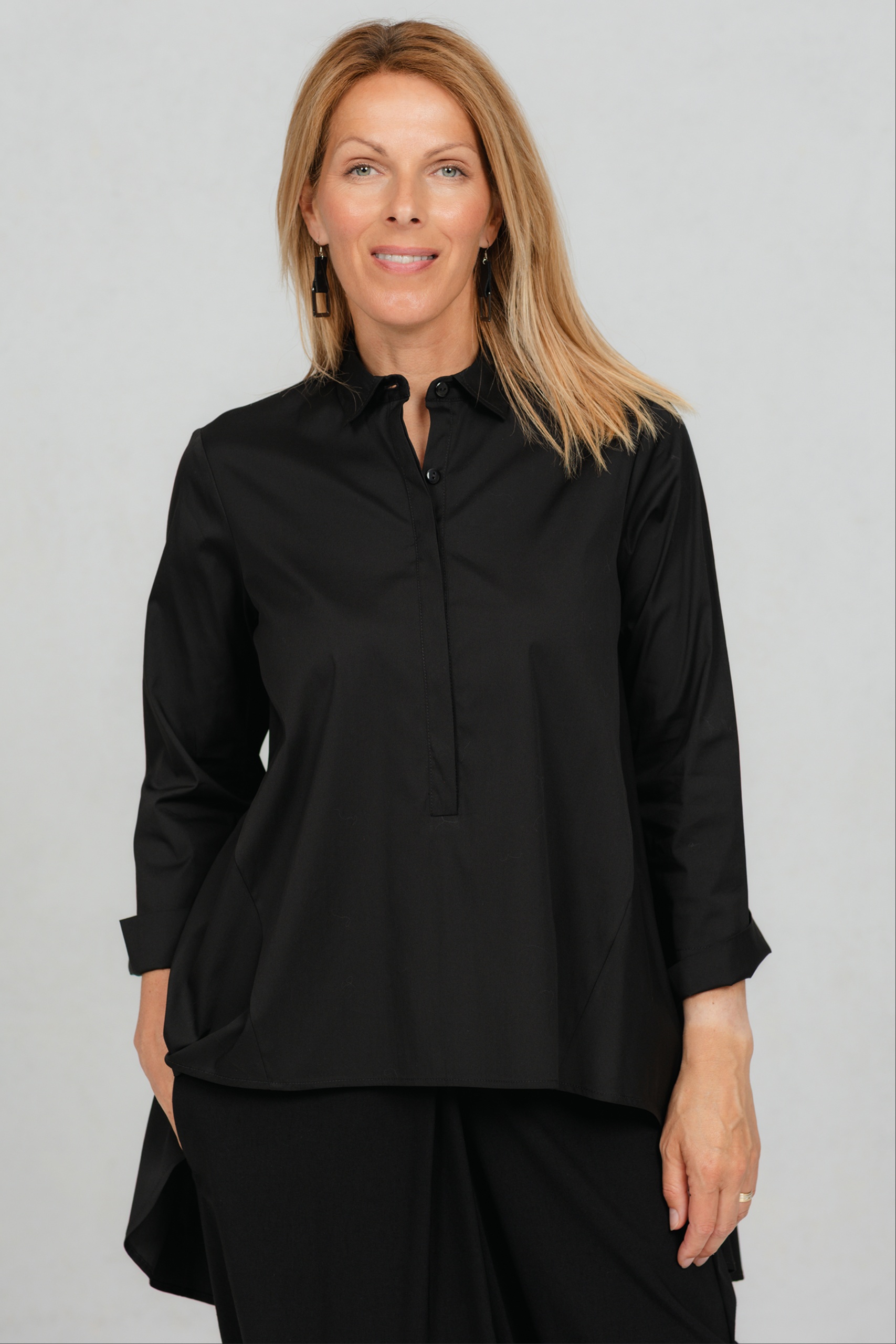 Yanagi, loose shirt blouse with a long back, black