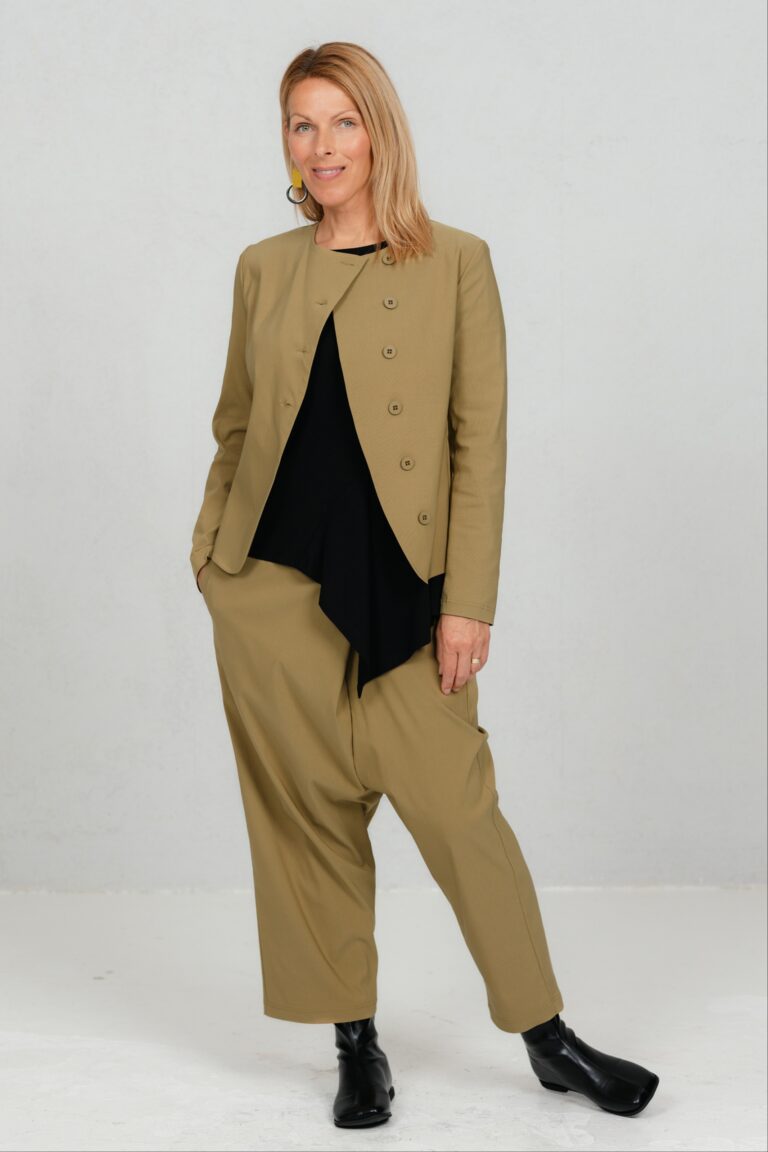 It’s cost combining comfort, durability and flexibility. Cotton makes the fabric breathable and skin-friendly, ensuring a pleasant wearing experience. Polyester adds durability and helps the material to keep its shape and reduce wrinkling. Elastane provides a slightly stretchy feel that enhances ease of movement and contouring. The result is a well-balanced fabric that is both practical and stylish for everyday wear.
