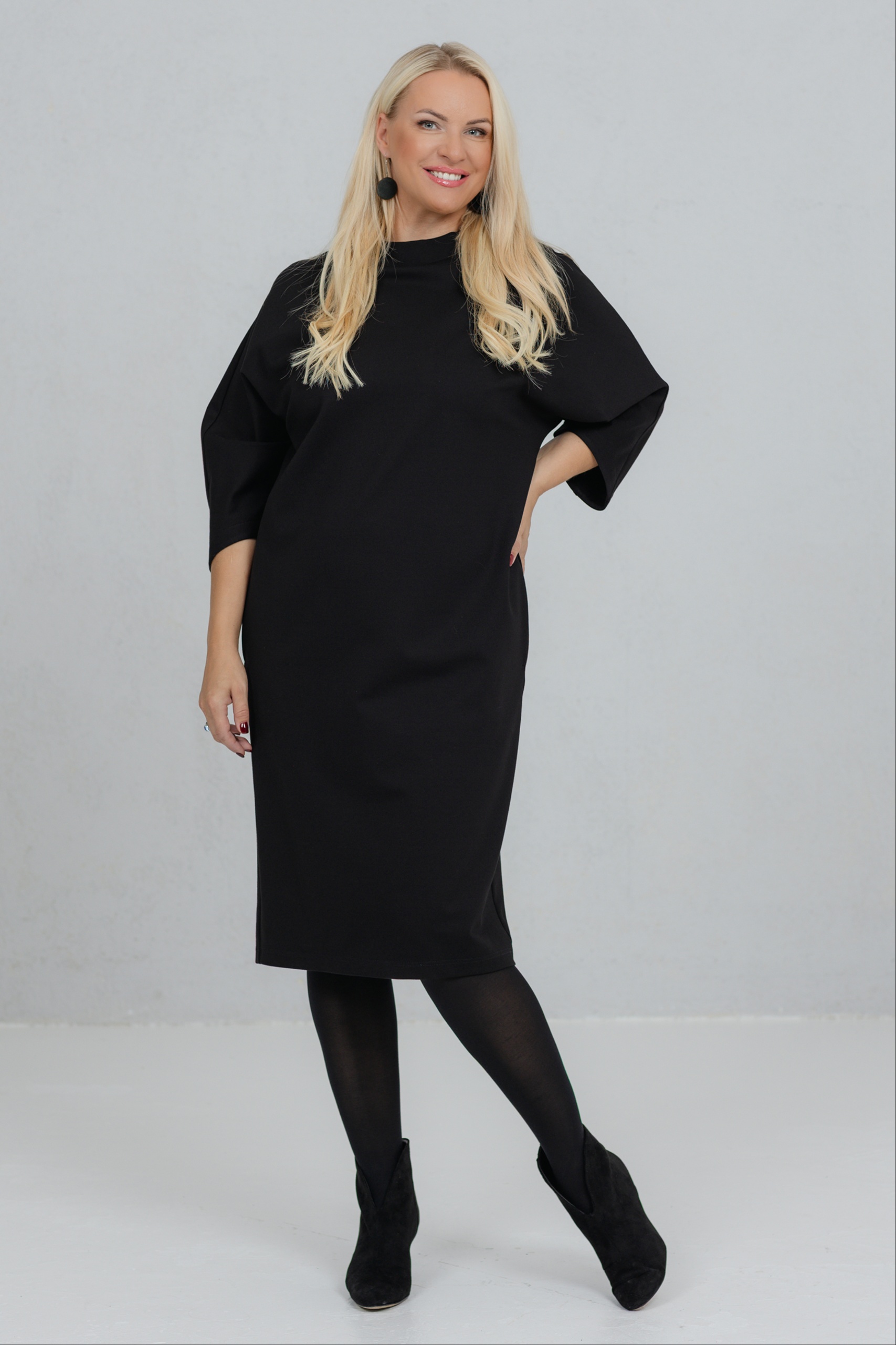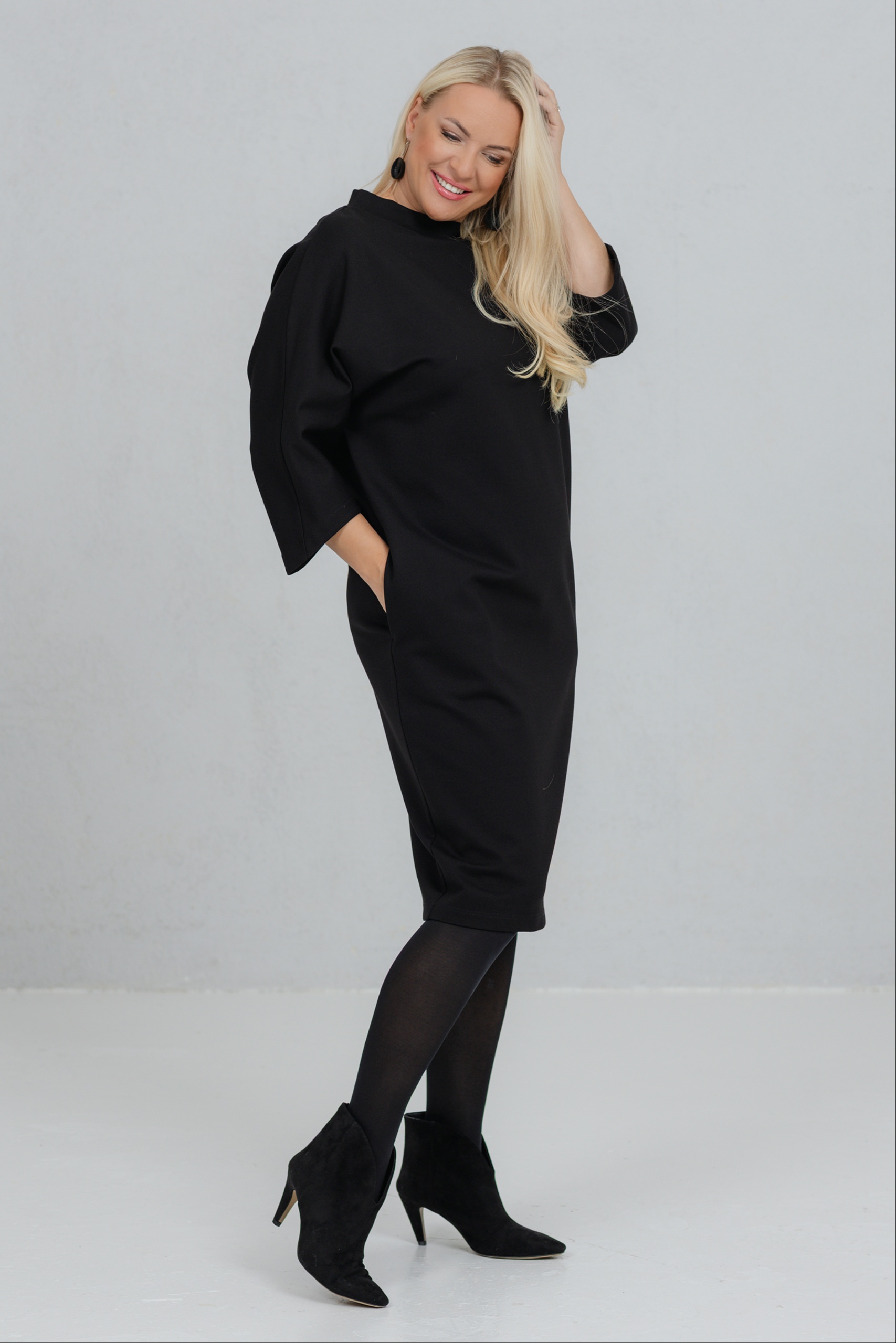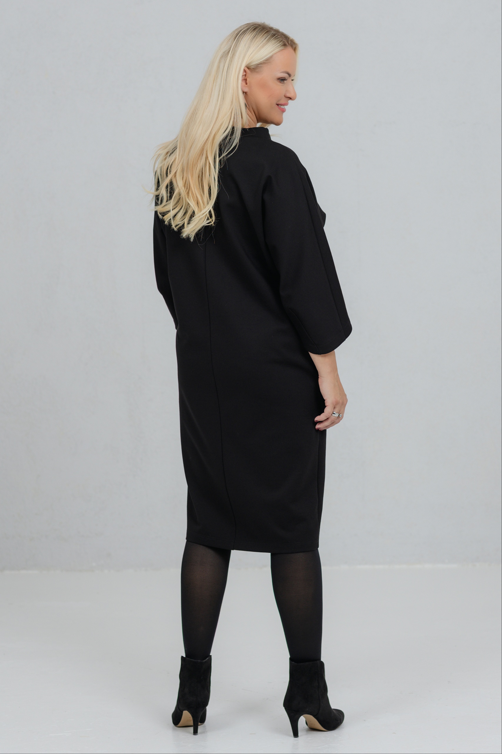 Opereta is a clean-lined black dress that combines minimalist form with feminine strength. The V-neck silhouette of this dress is perfect for a variety of figures. The wide, slightly dropped sleeves add freedom of movement and character. The thicker viscose fabric holds its shape well. Opereta is the choice for the woman who appreciates quiet elegance and a conscious presence.