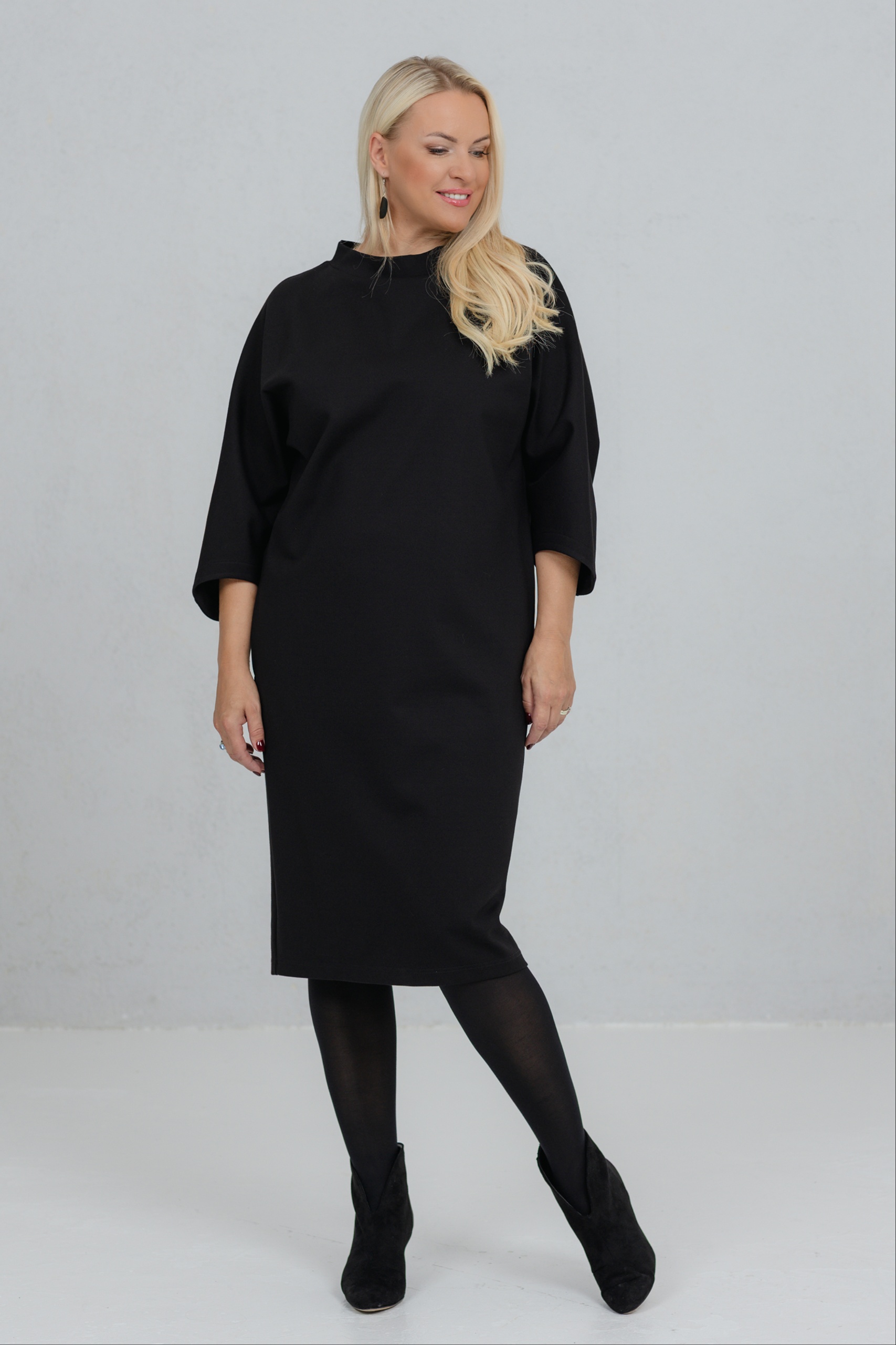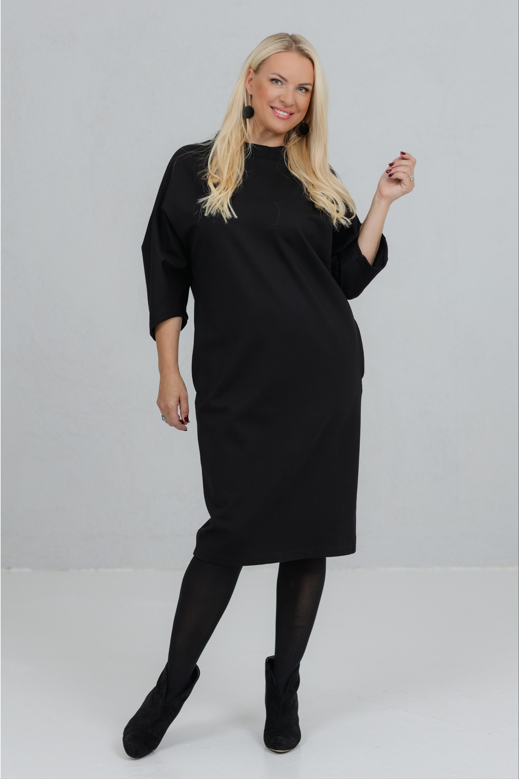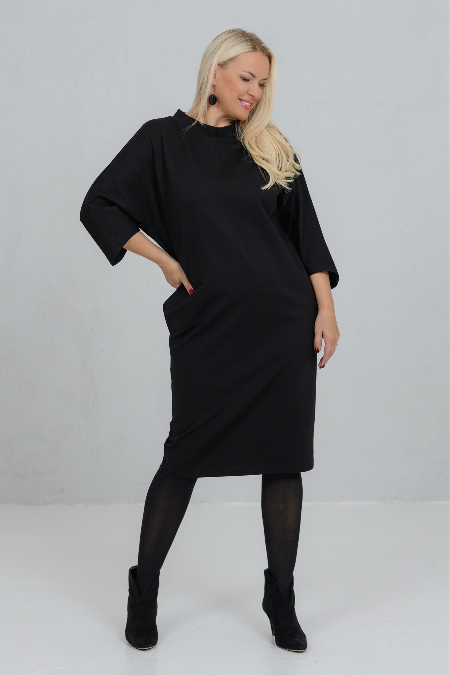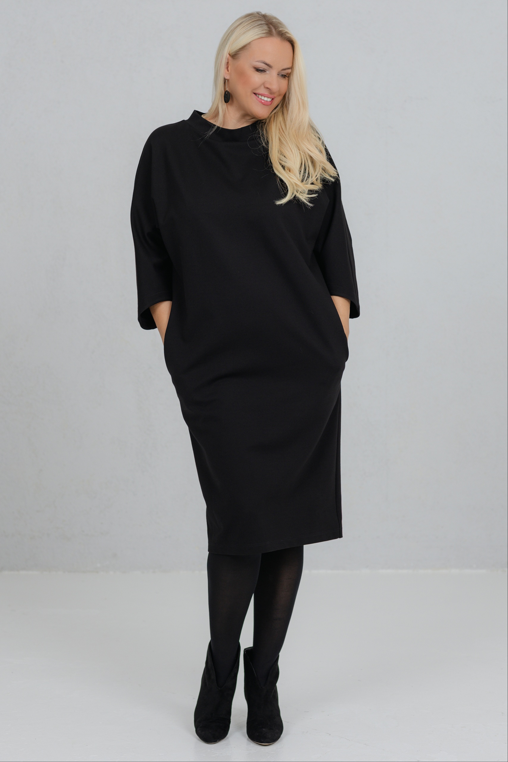 Opereta is a clean-lined black dress that combines minimalist form with feminine strength. The V-neck silhouette of this dress is perfect for a variety of figures. The wide, slightly dropped sleeves add freedom of movement and character. The thicker viscose fabric holds its shape well. Opereta is the choice for the woman who appreciates quiet elegance and a conscious presence.
