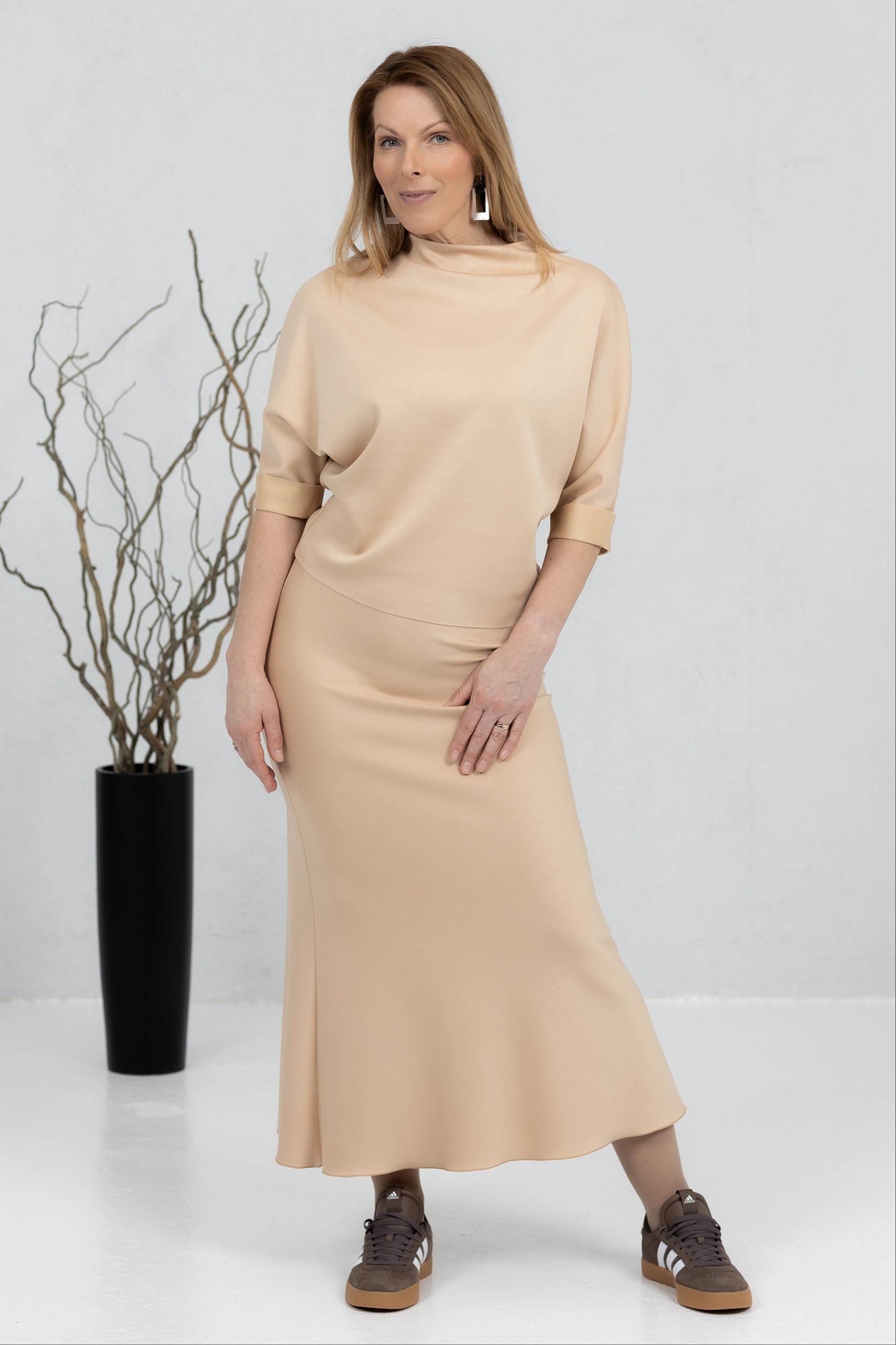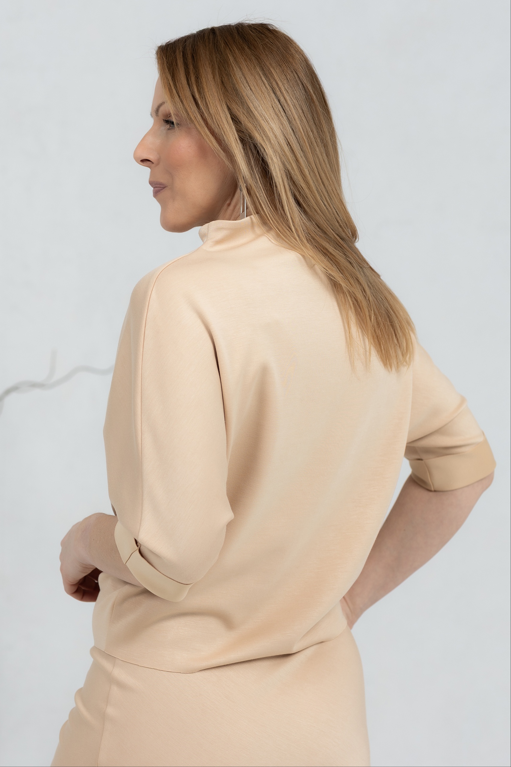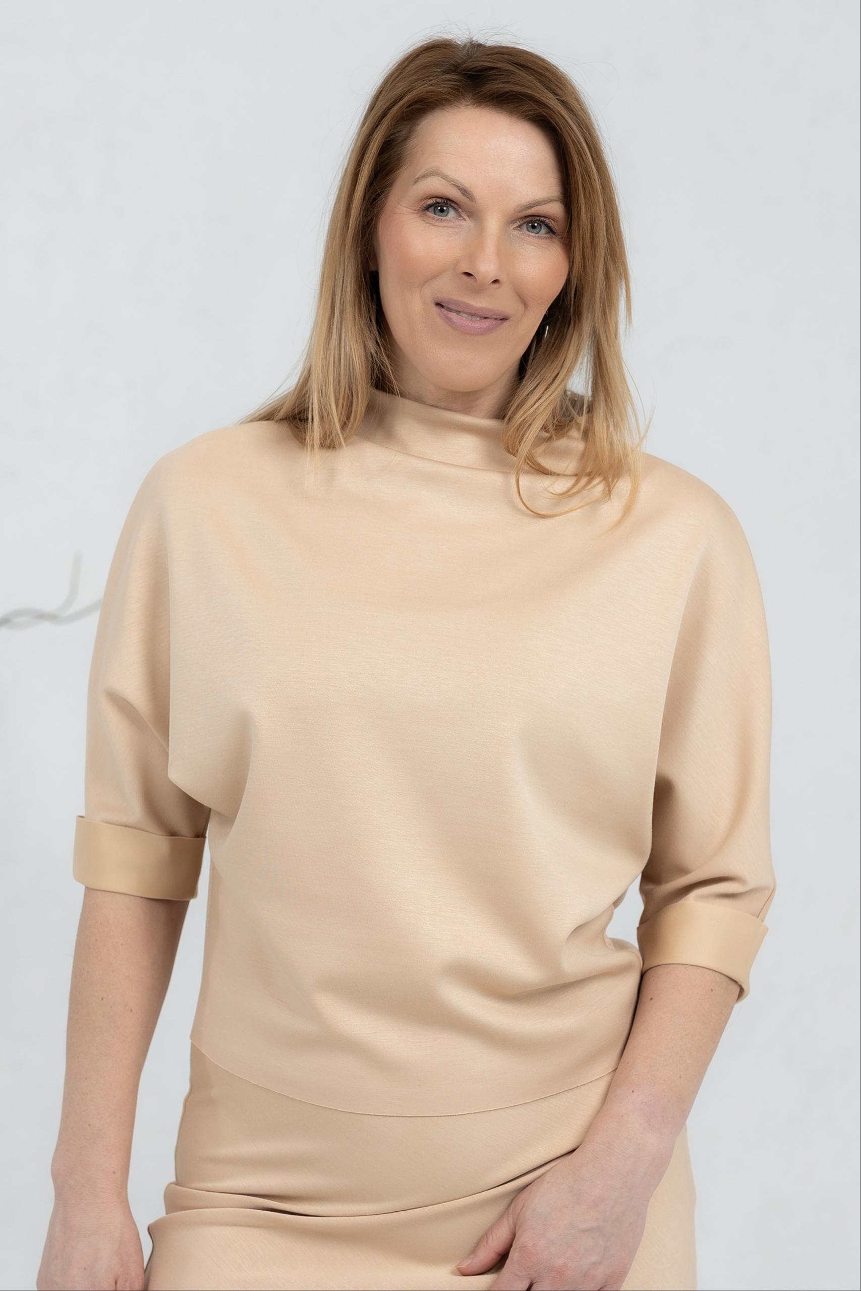 Kaori is a blouse with a modern and clean silhouette, made from ultra-soft scuba viscose fabric, offering a beautiful shape and exceptional comfort. The slightly V-cut design and minimalist high neckline create an elegant and timeless silhouette. The half-length sleeves add balance and make the blouse suitable for both workdays and more formal occasions. The stretchy and form-fitting material follows the figure and stays beautiful and finished all day long. The bottom and sleeve ends of the blouse are untreated, creating a fashionably simple and stylish look.