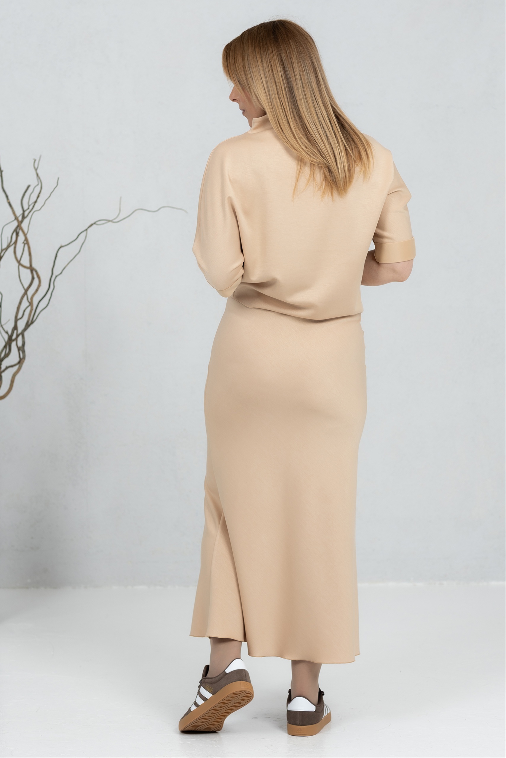 This dress is made from a soft and cosy scuba fabric that is thicker, smooth and beautifully form-fitting. It is a stretchy jersey fabric that feels surprisingly soft and warm against the skin. The viscose adds breathability and silky softness, the polyester helps to maintain shape and the elastane provides comfortable freedom of movement. The fabric does not wrinkle easily and keeps its beautiful shape even after prolonged wear. The result is a luxuriously soft yet confidently form-fitting material that keeps you feeling good all day long.