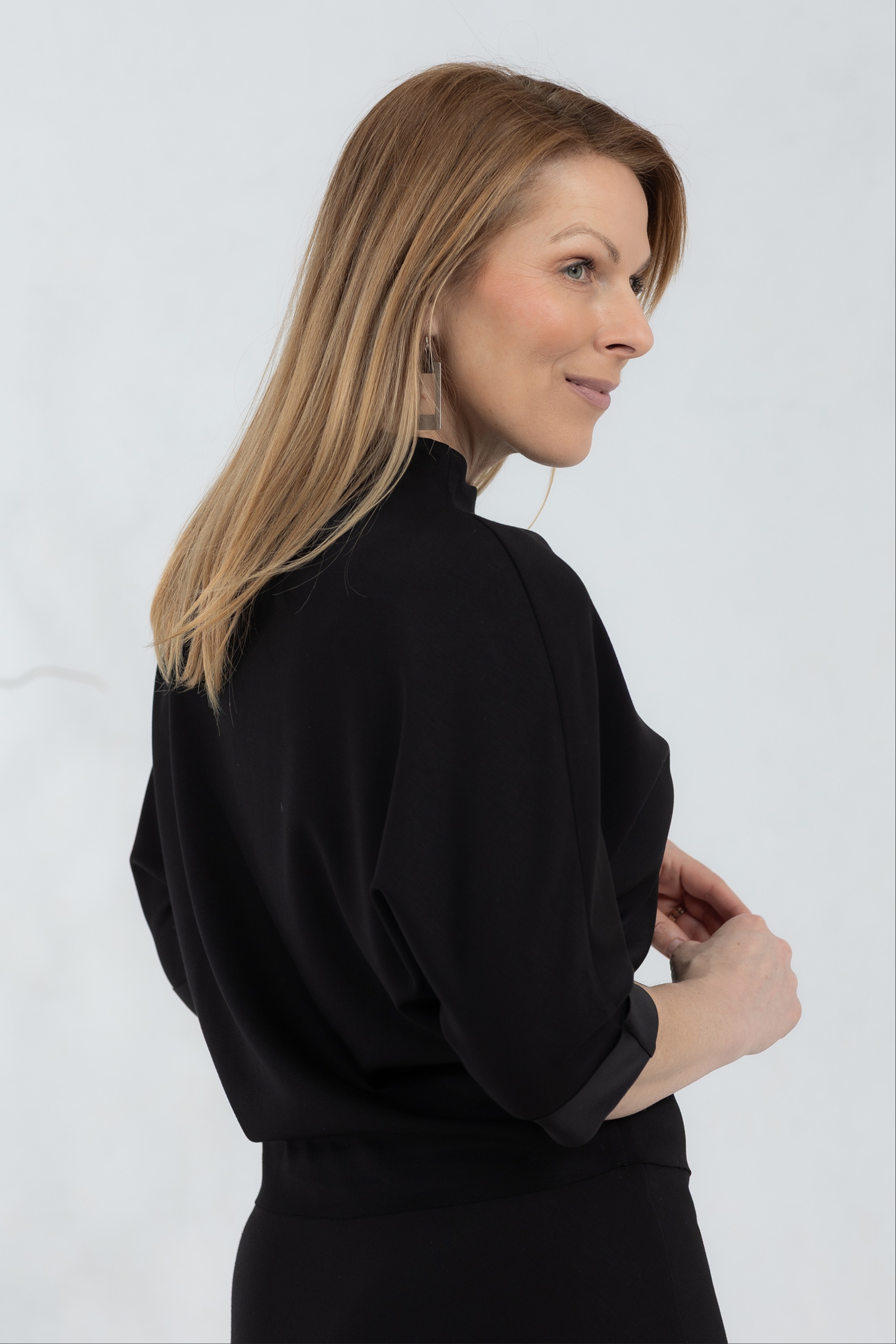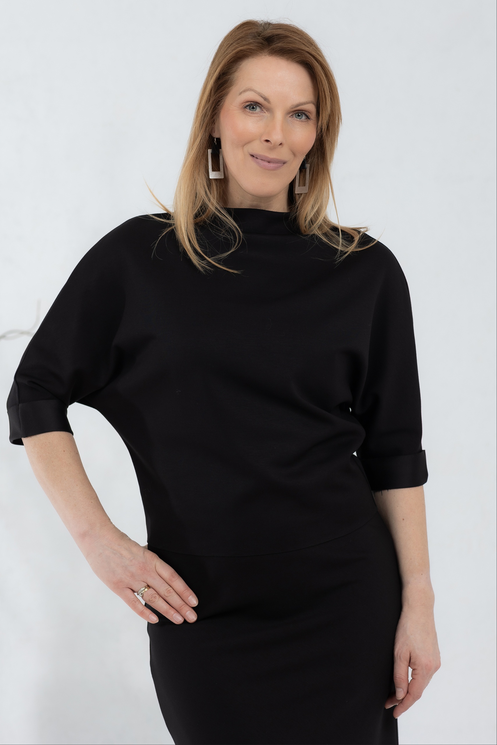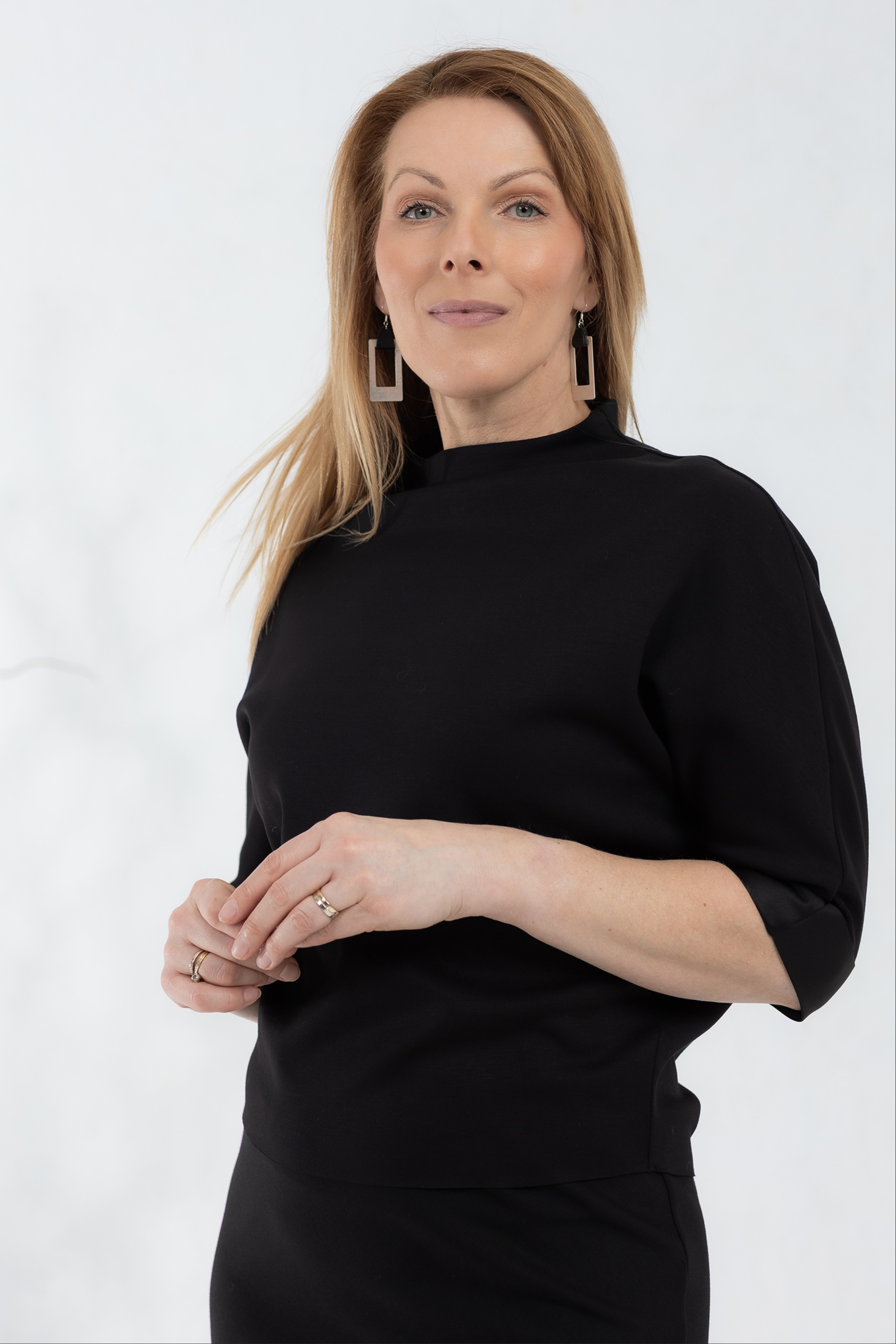 Kaori is a blouse with a modern and clean silhouette, made from ultra-soft scuba viscose fabric, offering a beautiful shape and exceptional comfort. The slight V-neckline and minimalist high neckline create an elegant and timeless silhouette. The half-length sleeves add balance and make the blouse suitable for both the workday and more formal moments. The stretchy and form-fitting material follows the figure and stays beautiful and finished all day long. The bottom and sleeve ends of the blouse are untreated, creating a fashionably simple and stylish look.