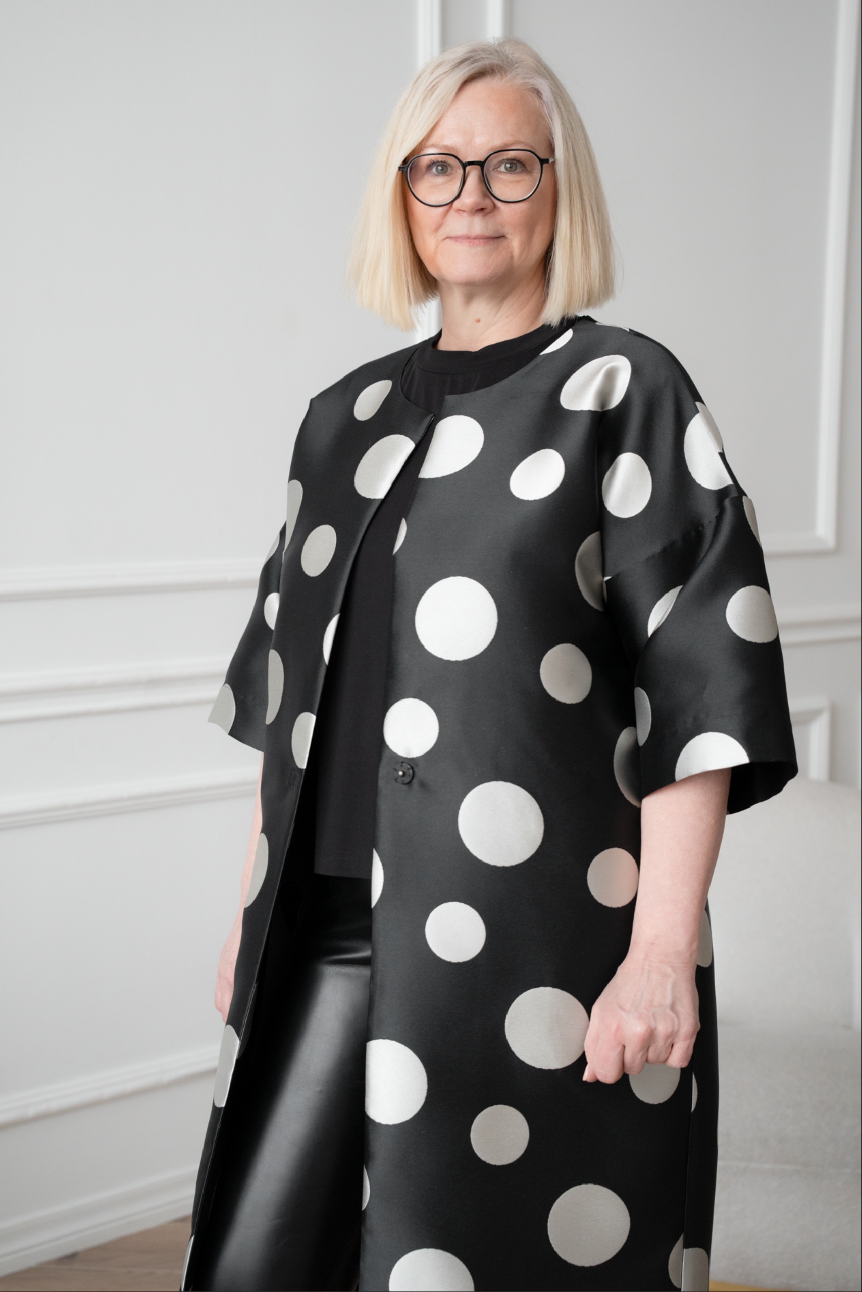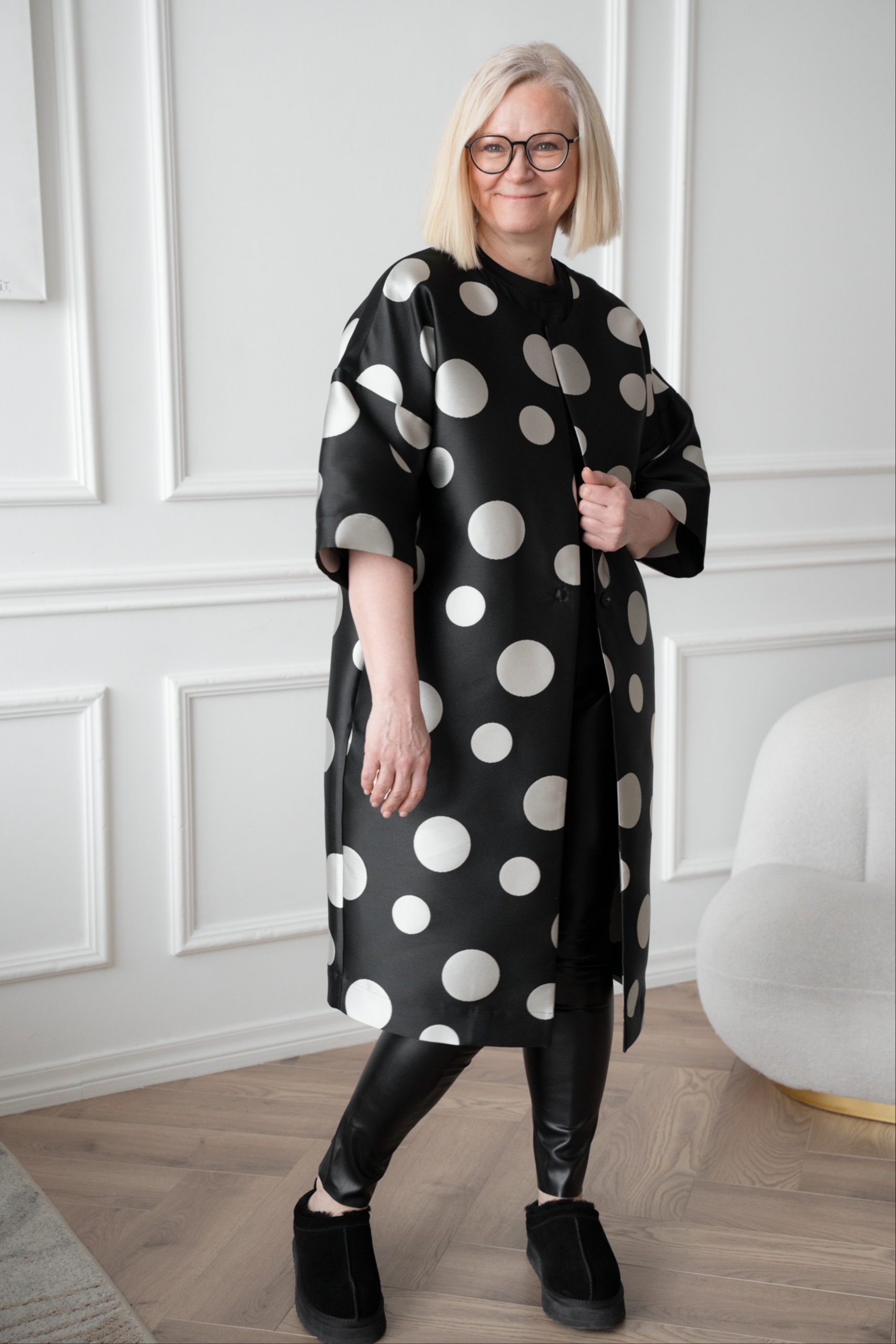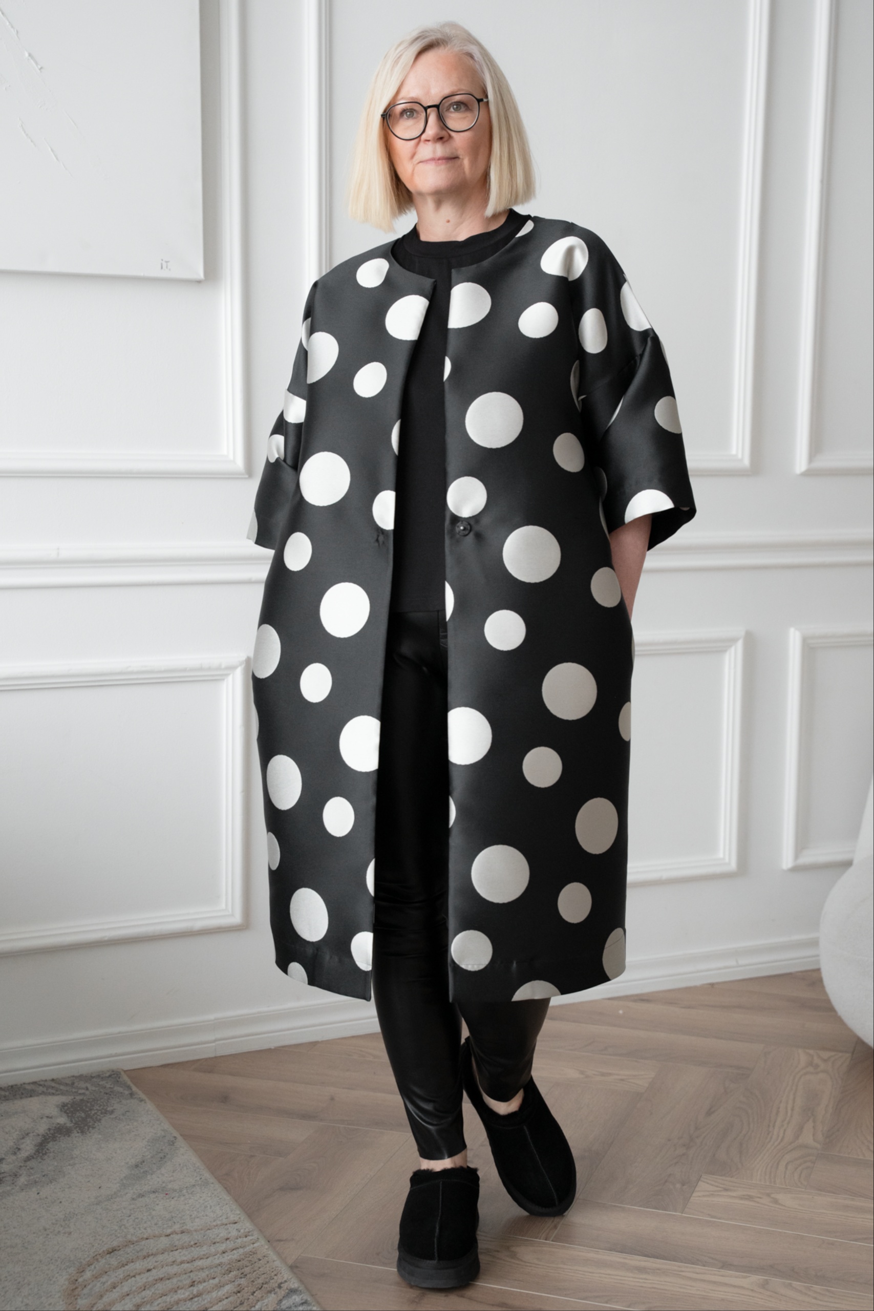 This kimono jacket is a real eye-catcher, with a large mum pattern playing in a modern way. The shape-holding jaquard weave fabric gives the kimono a luxurious look. With its open cut and flounce, the jacket is perfect for pairing with a simple dress or leather trousers. The timeless black and silver grey combination adds luxury and lightness together.
