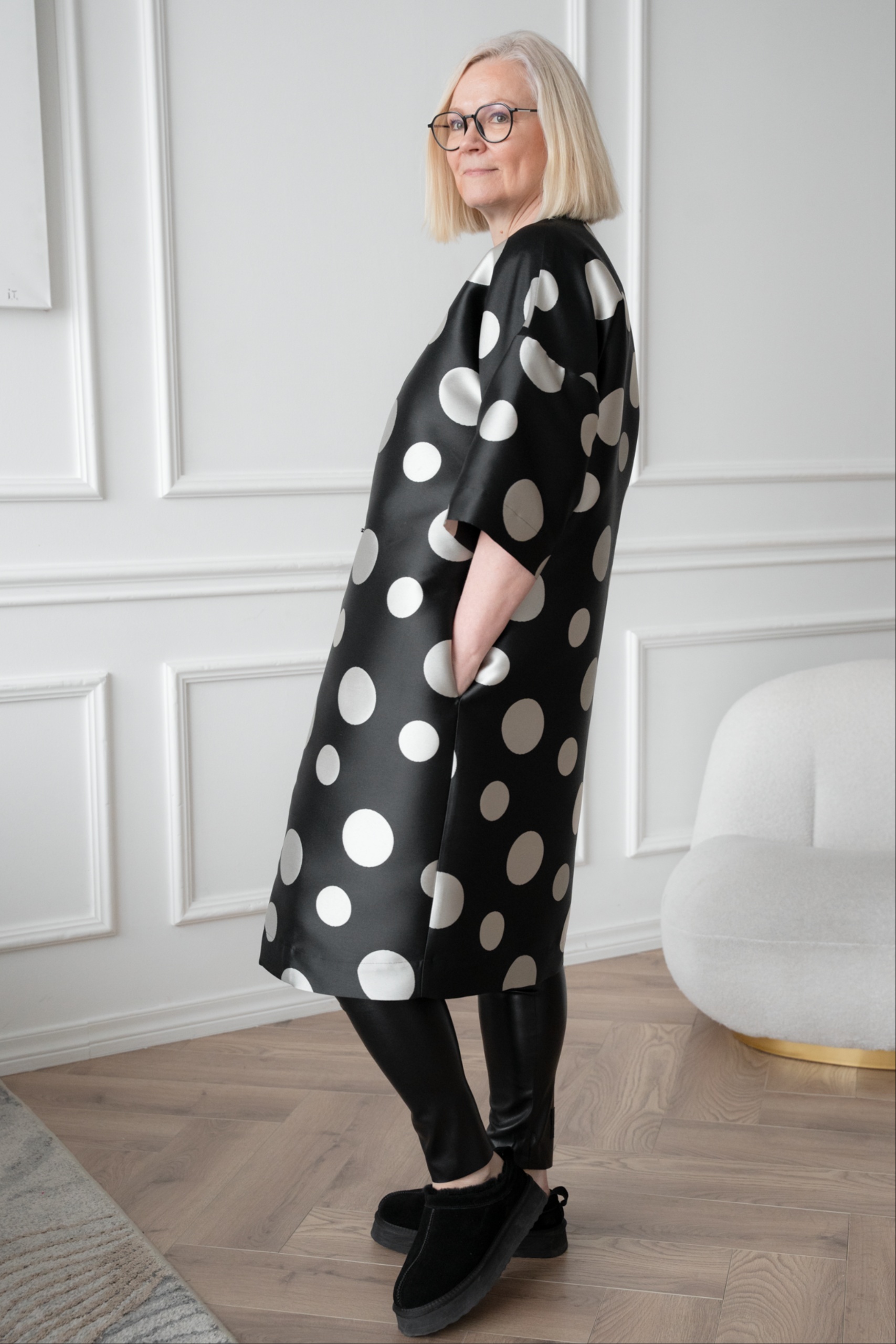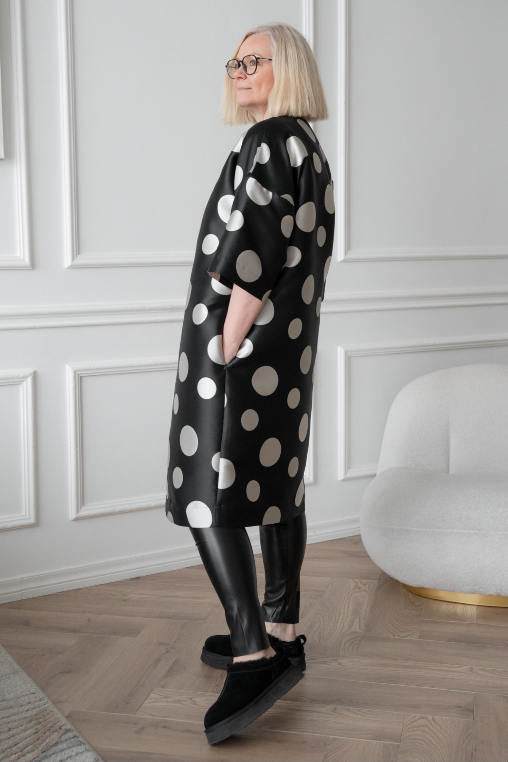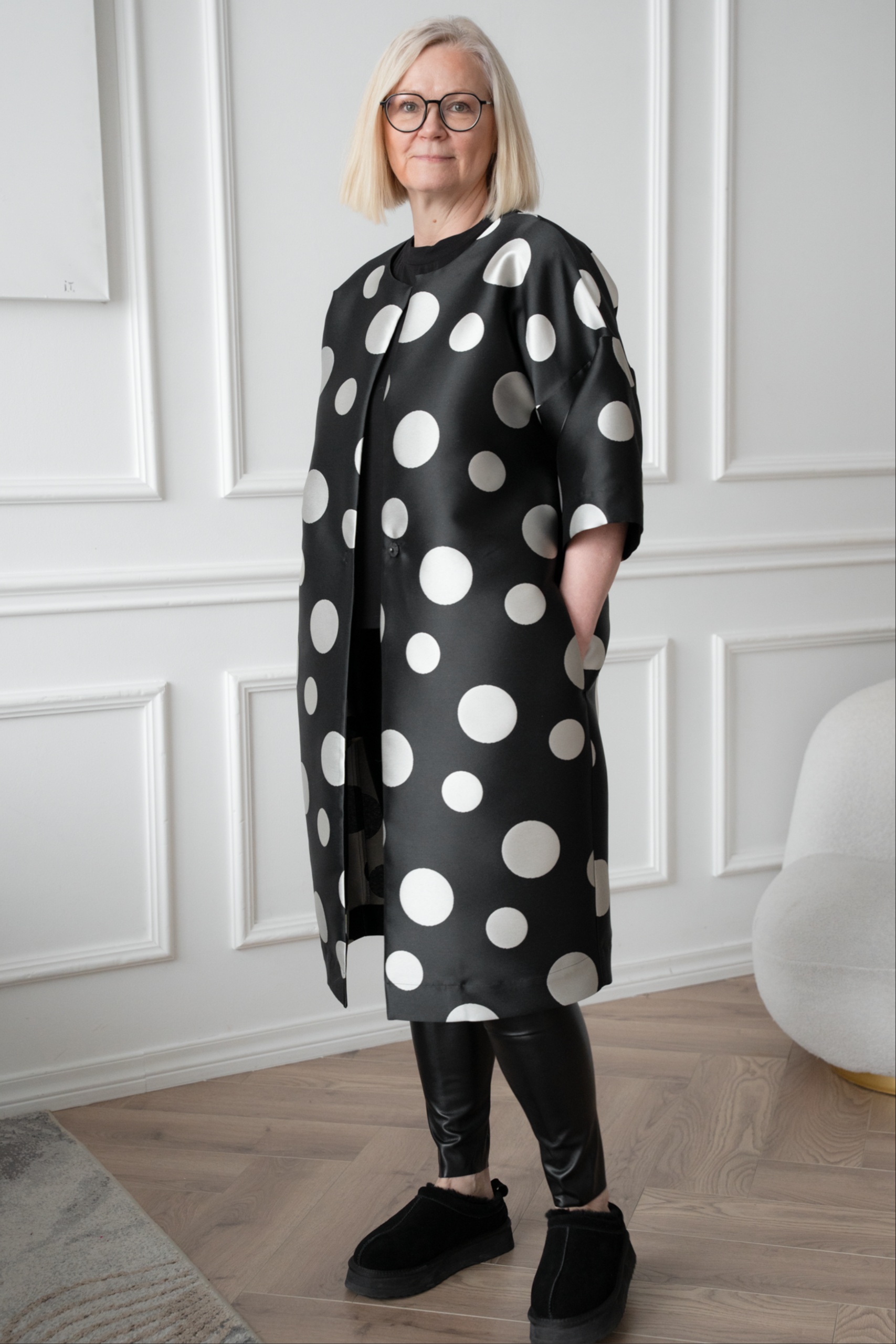 This kimono jacket is a real eye-catcher, with a large mum pattern playing in a modern way. The shape-holding jaquard weave fabric gives the kimono a luxurious look. With its open cut and flounce, the jacket is perfect for pairing with a simple dress or leather trousers. The timeless black and silver grey combination adds luxury and lightness together.
