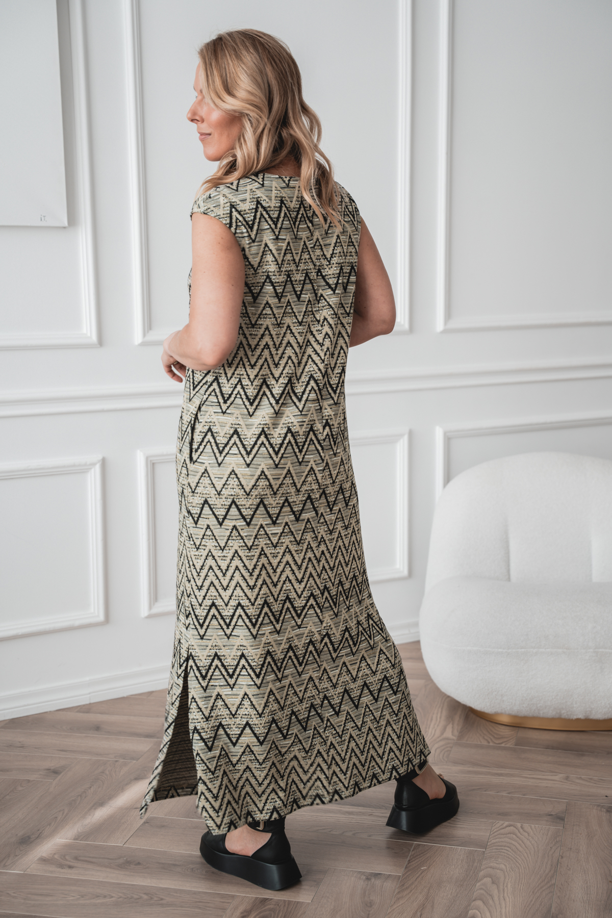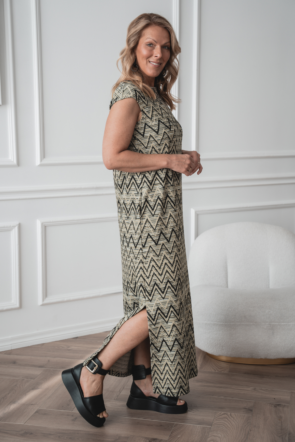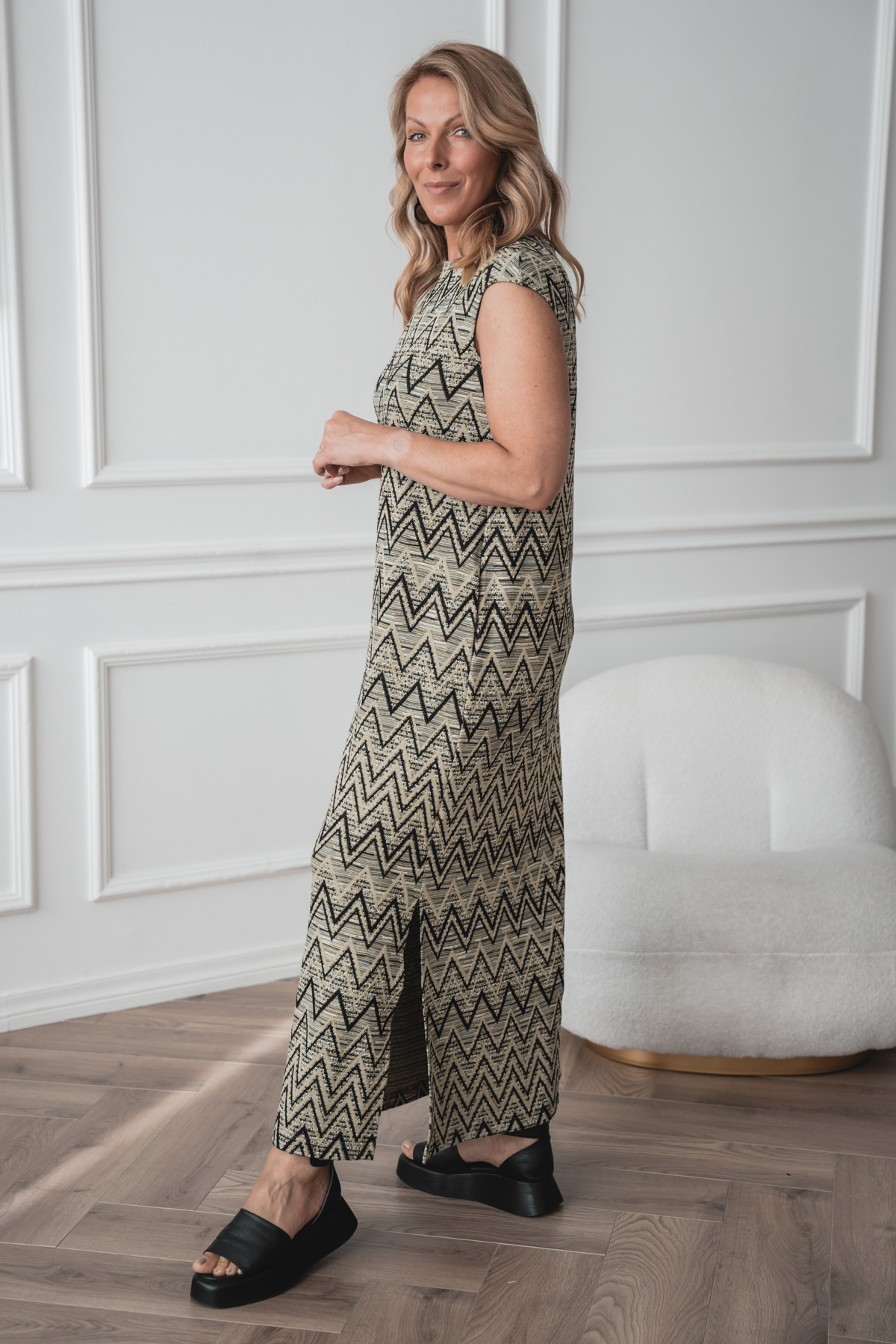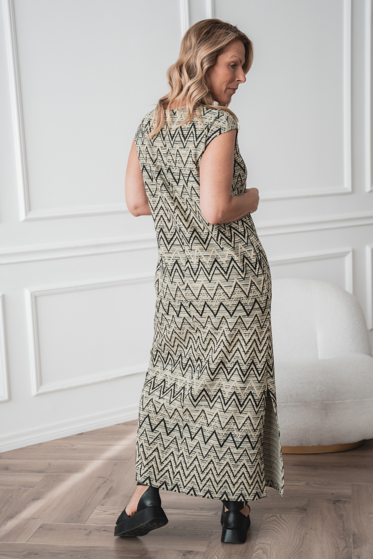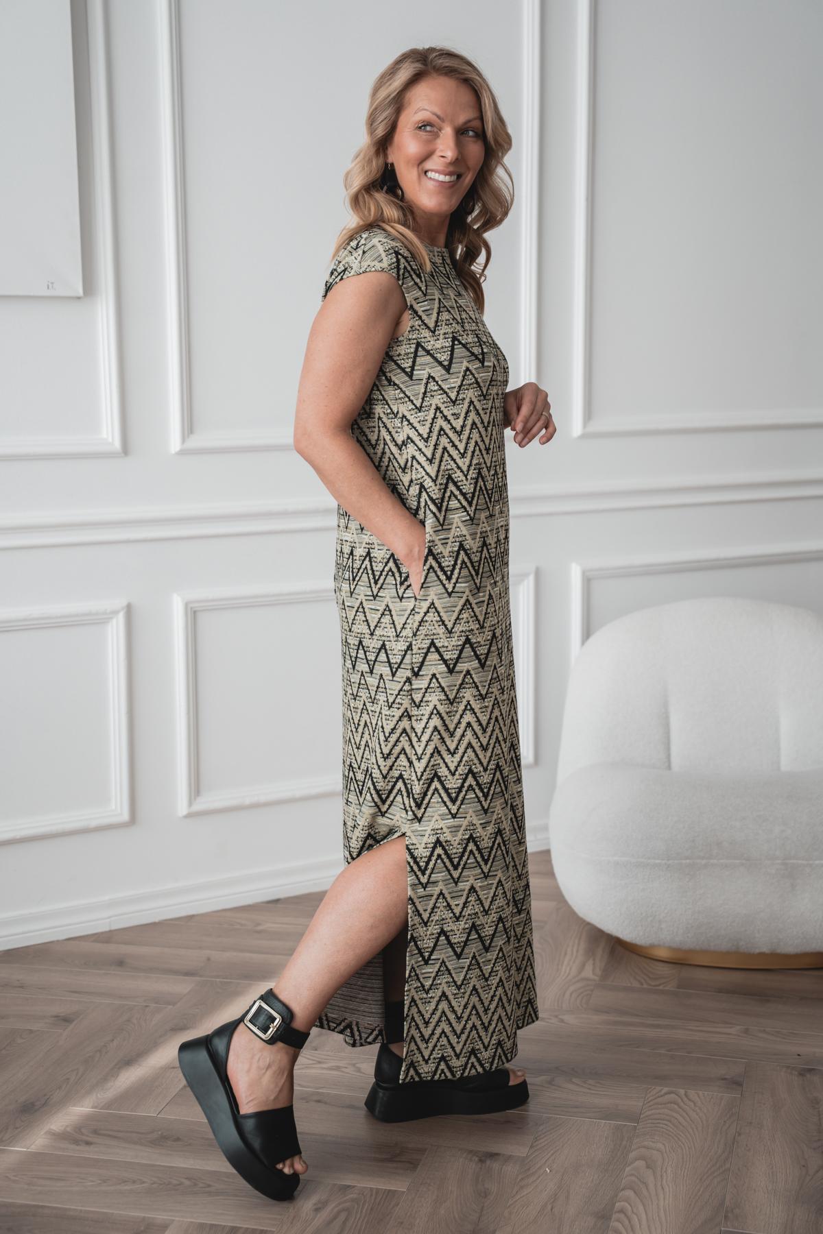 This dress is made from a soft and comfortable knit fabric that feels great on and moves with you. The straight cut and side pockets make it easy and practical for everyday wear. The material is perfect for the warming spring and summer months. The geometric pattern adds character while remaining easy to combine. The perfect choice if you value comfort and simple style.