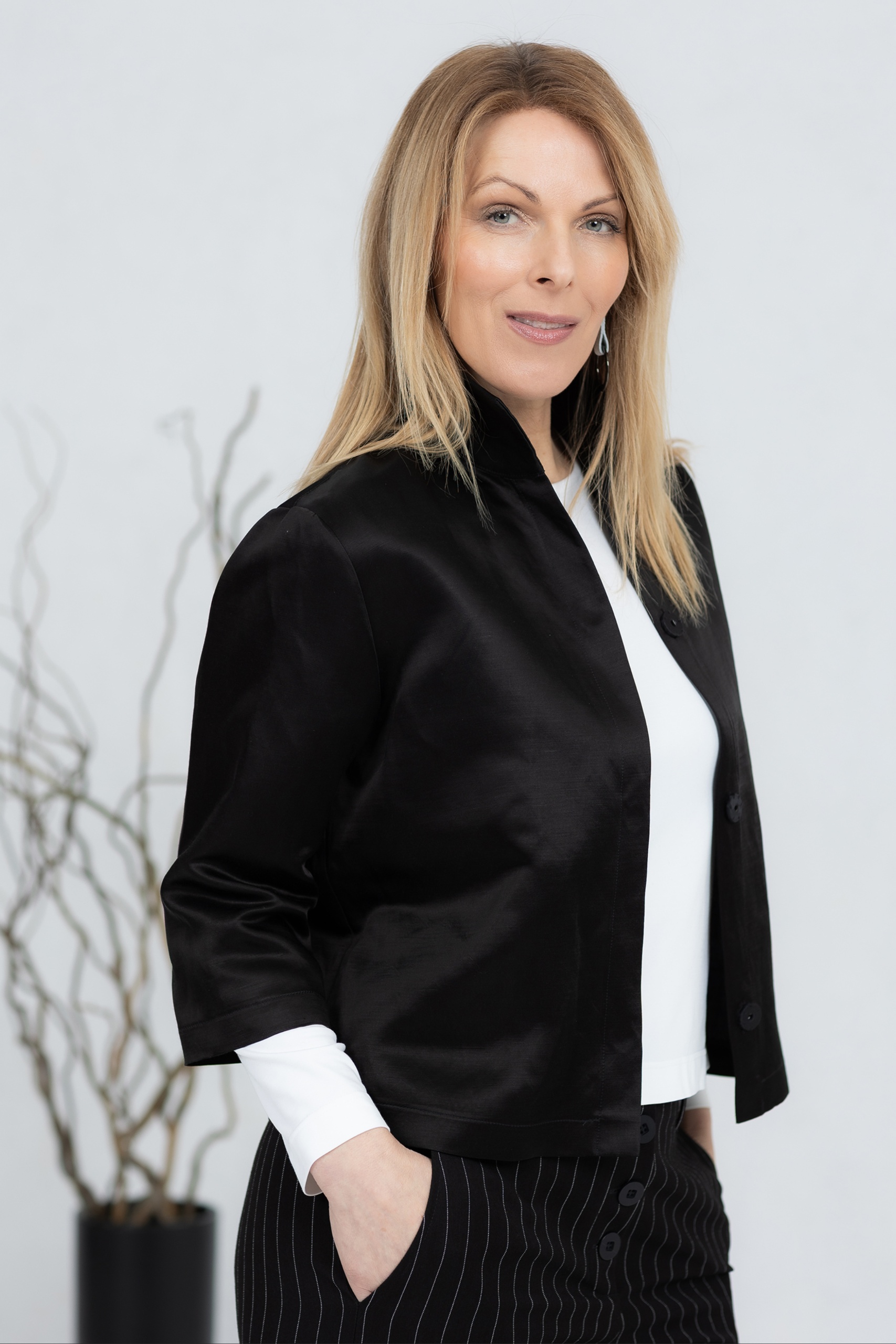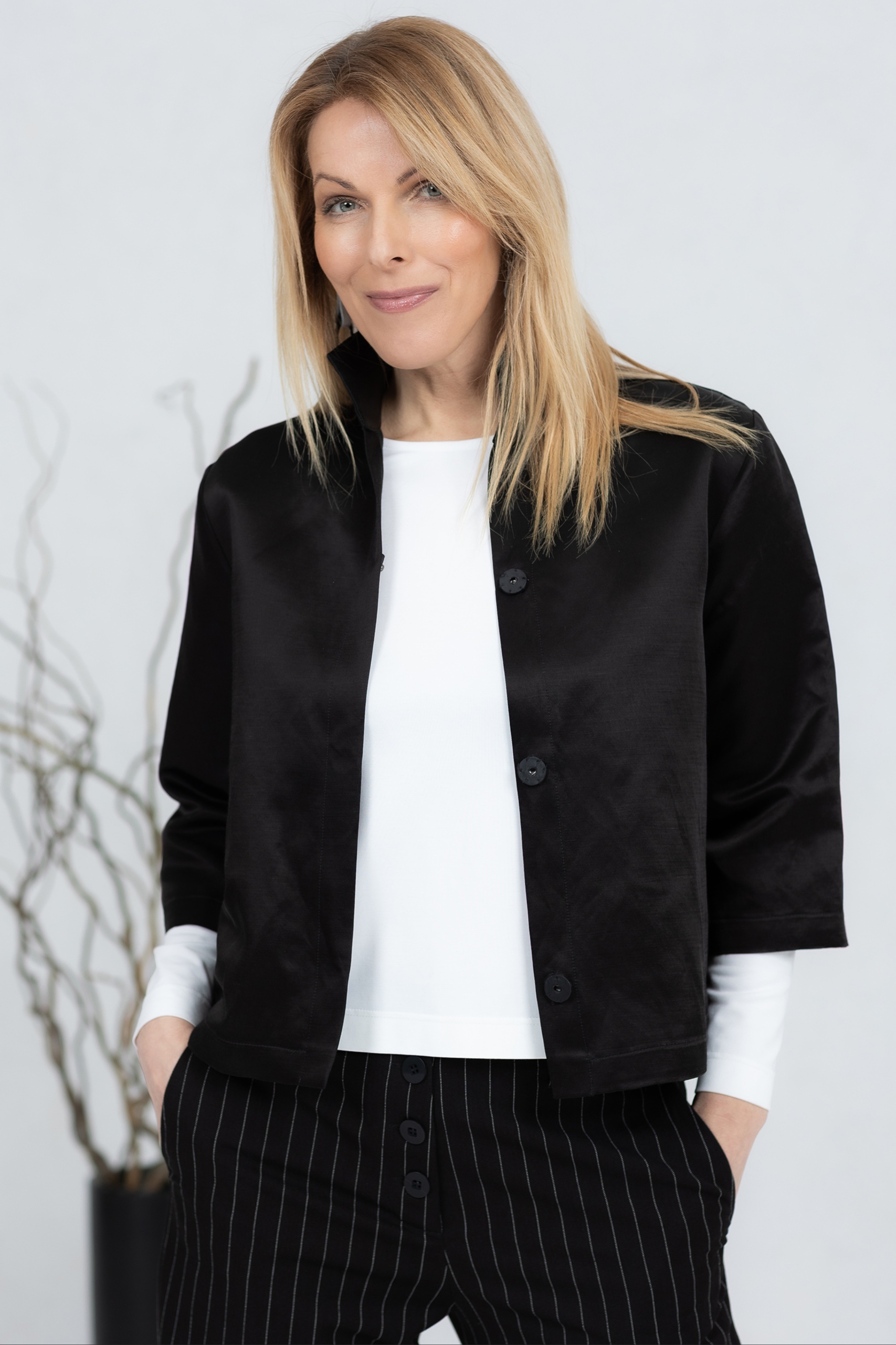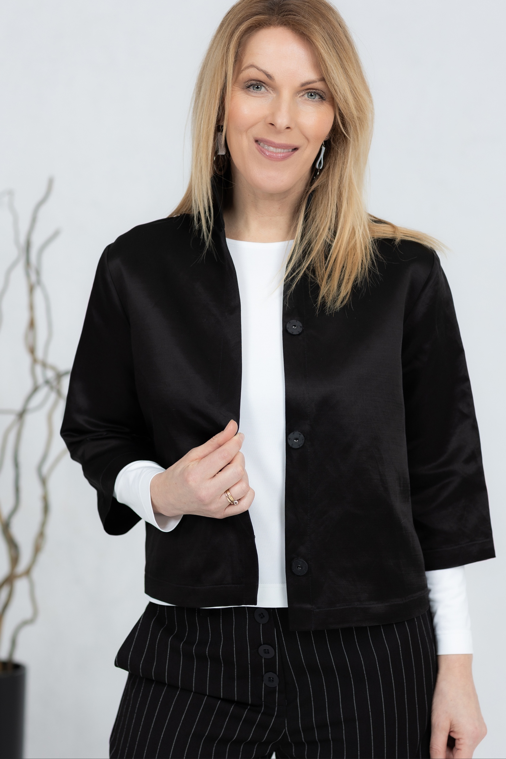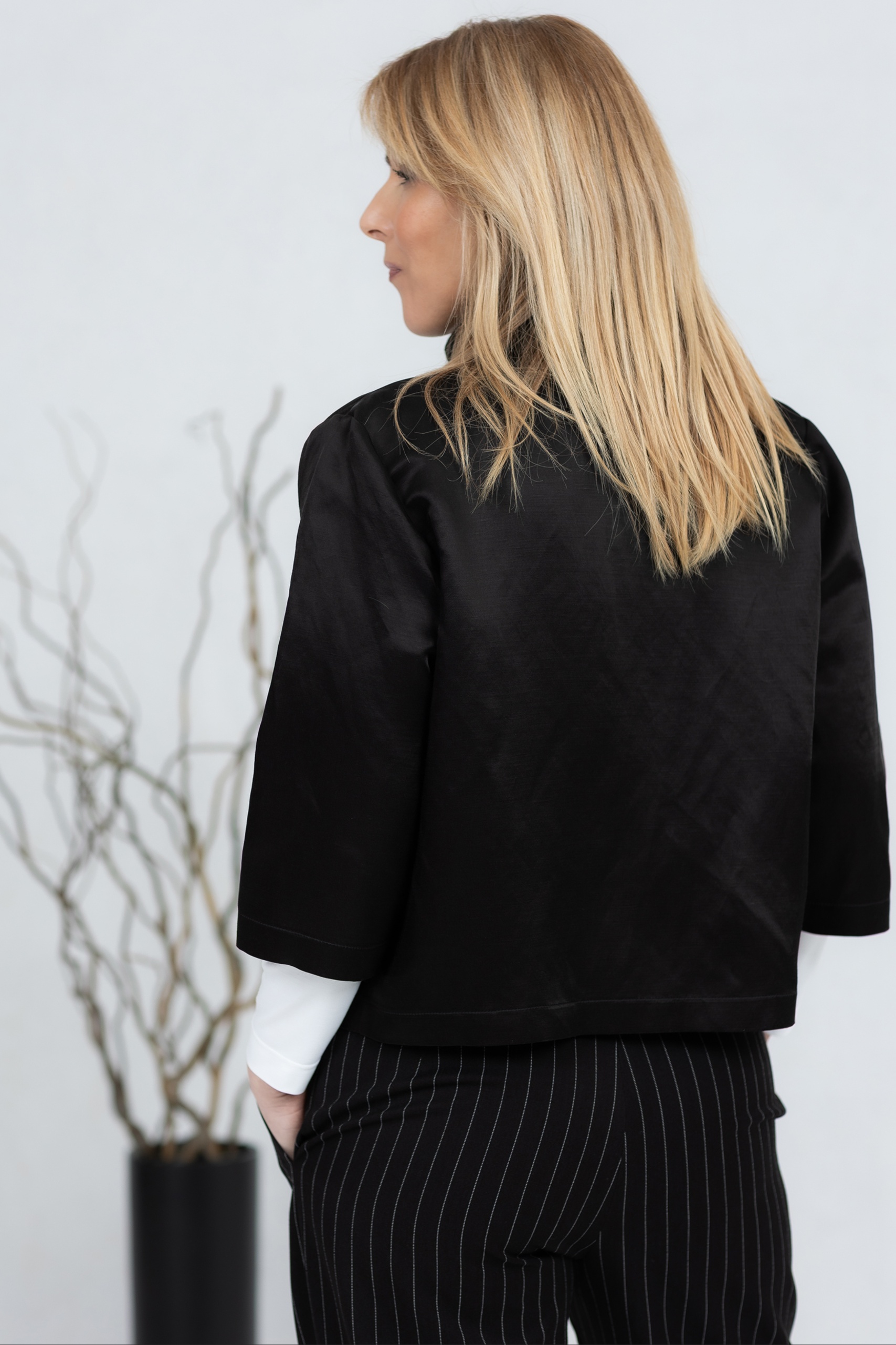 A simple little black jacket for your festive moments. The light sheen of the black fabric makes this simple jacket an indispensable addition to your wardrobe. It has 3/4 sleeves and a front zip fastening to make it as easy as possible to match with different outfits.