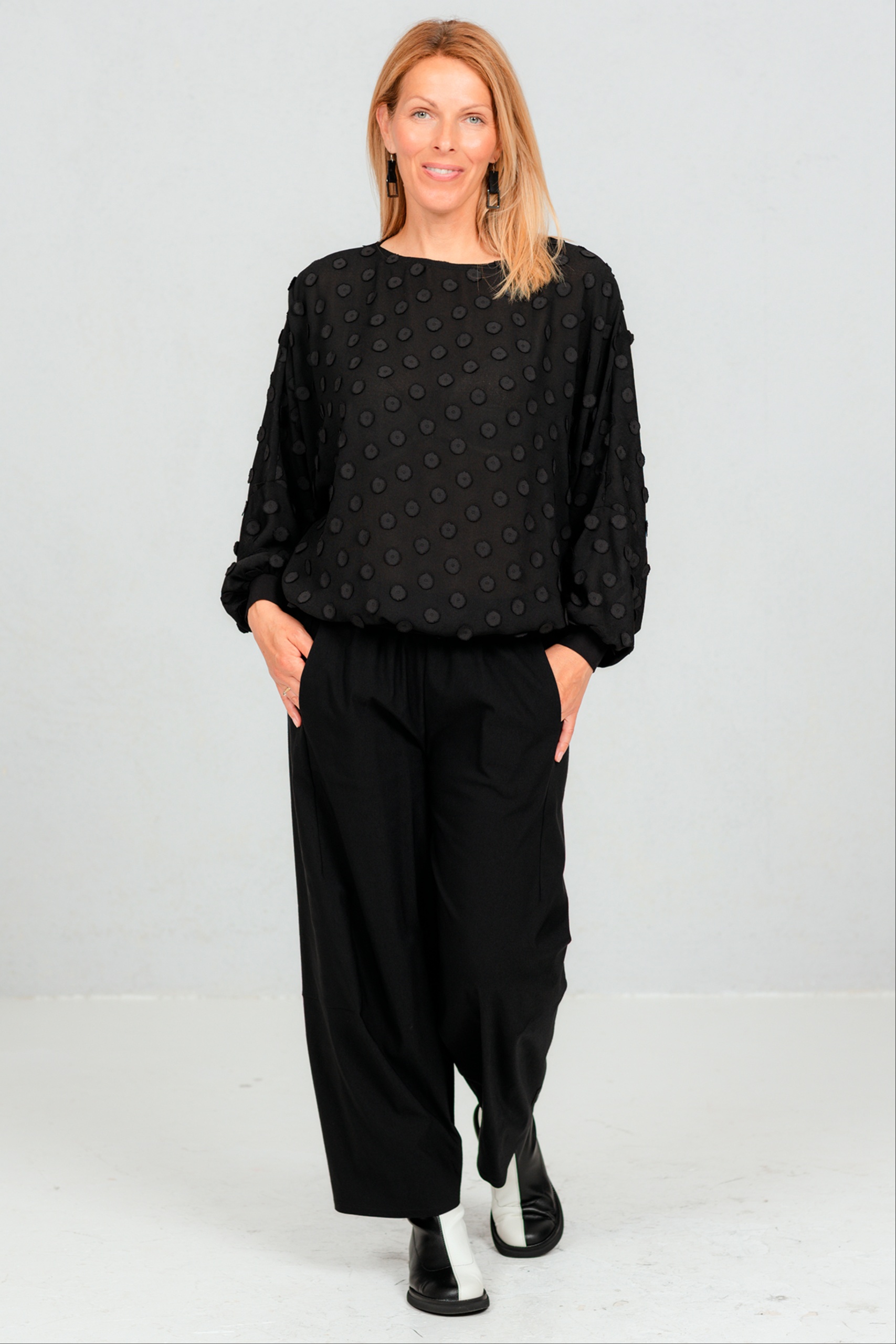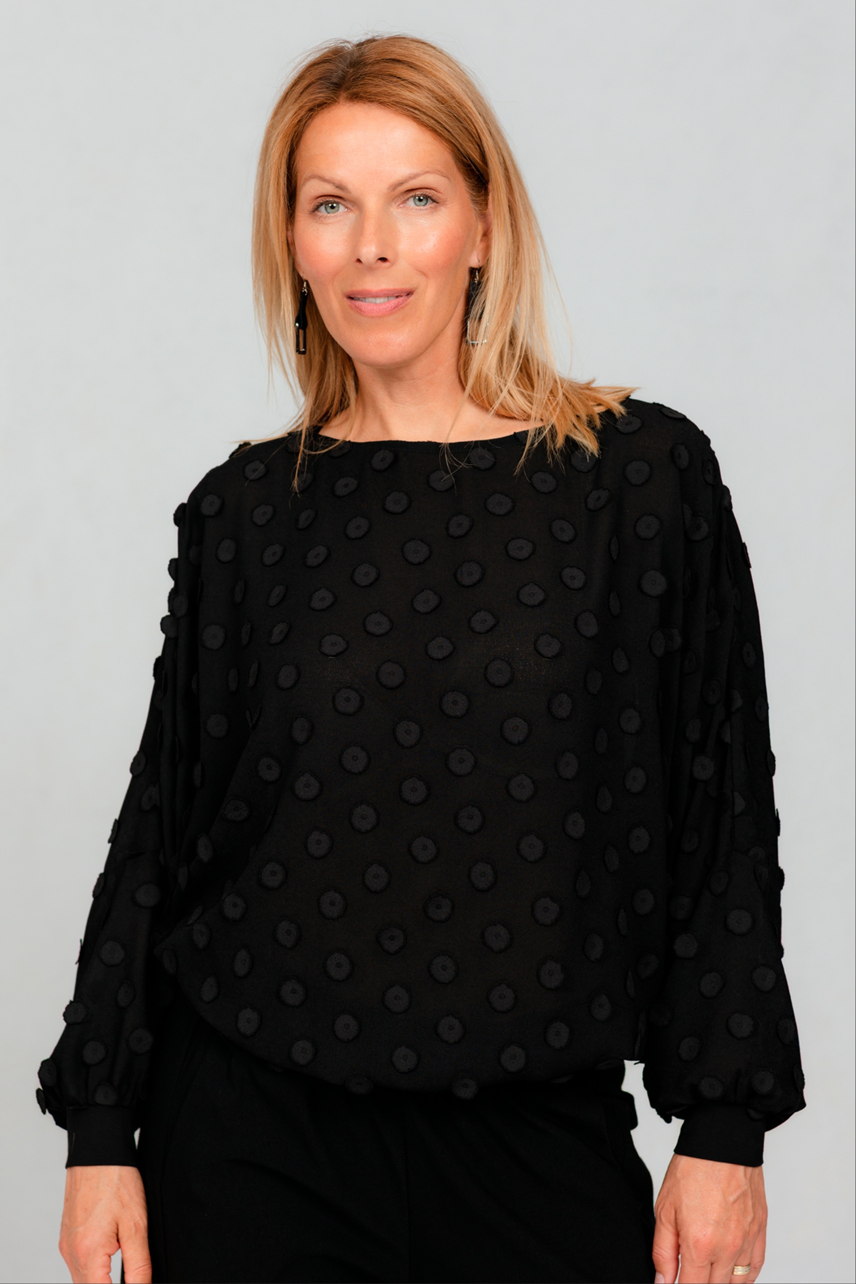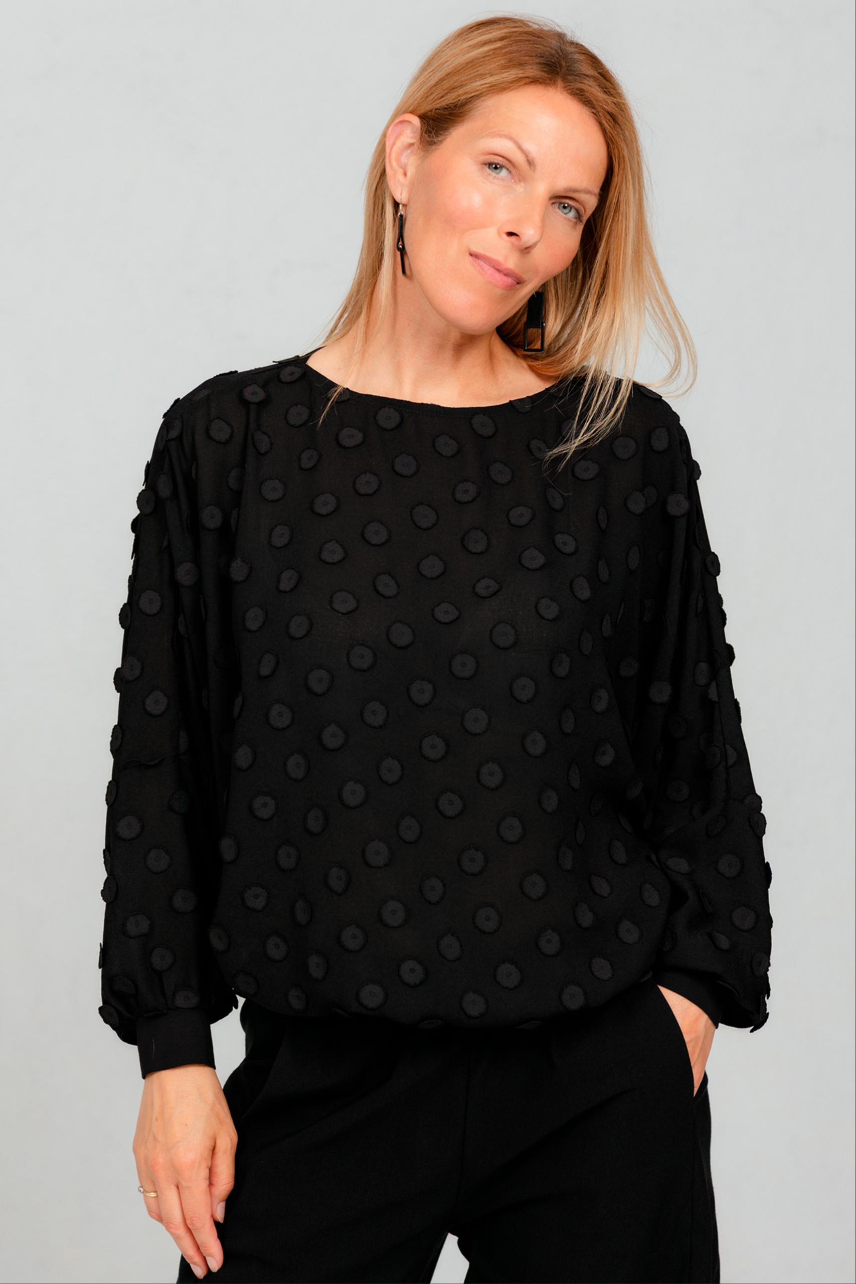 A spacious blouse with an enchanting pattern that combines comfort and style. The blouse’s mottled texture creates an exciting and eye-catching look, while the roomy cut ensures freedom and comfort all day long. The elasticated cuffs and round neckline add practicality and elegance. Perfect for everyday wear as well as festive occasions. Pair with your favourite trousers or skirt for a stylish and timeless look.
