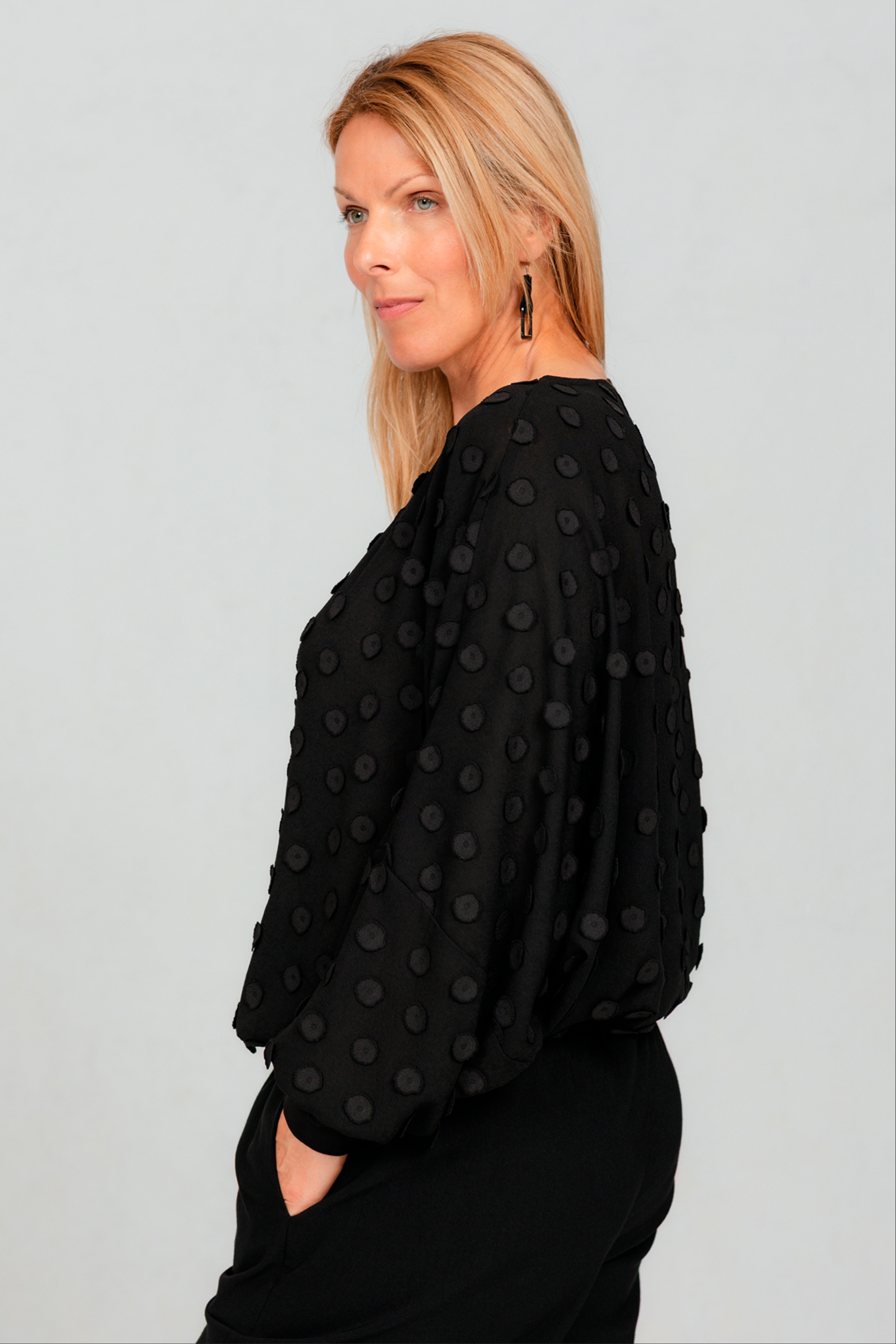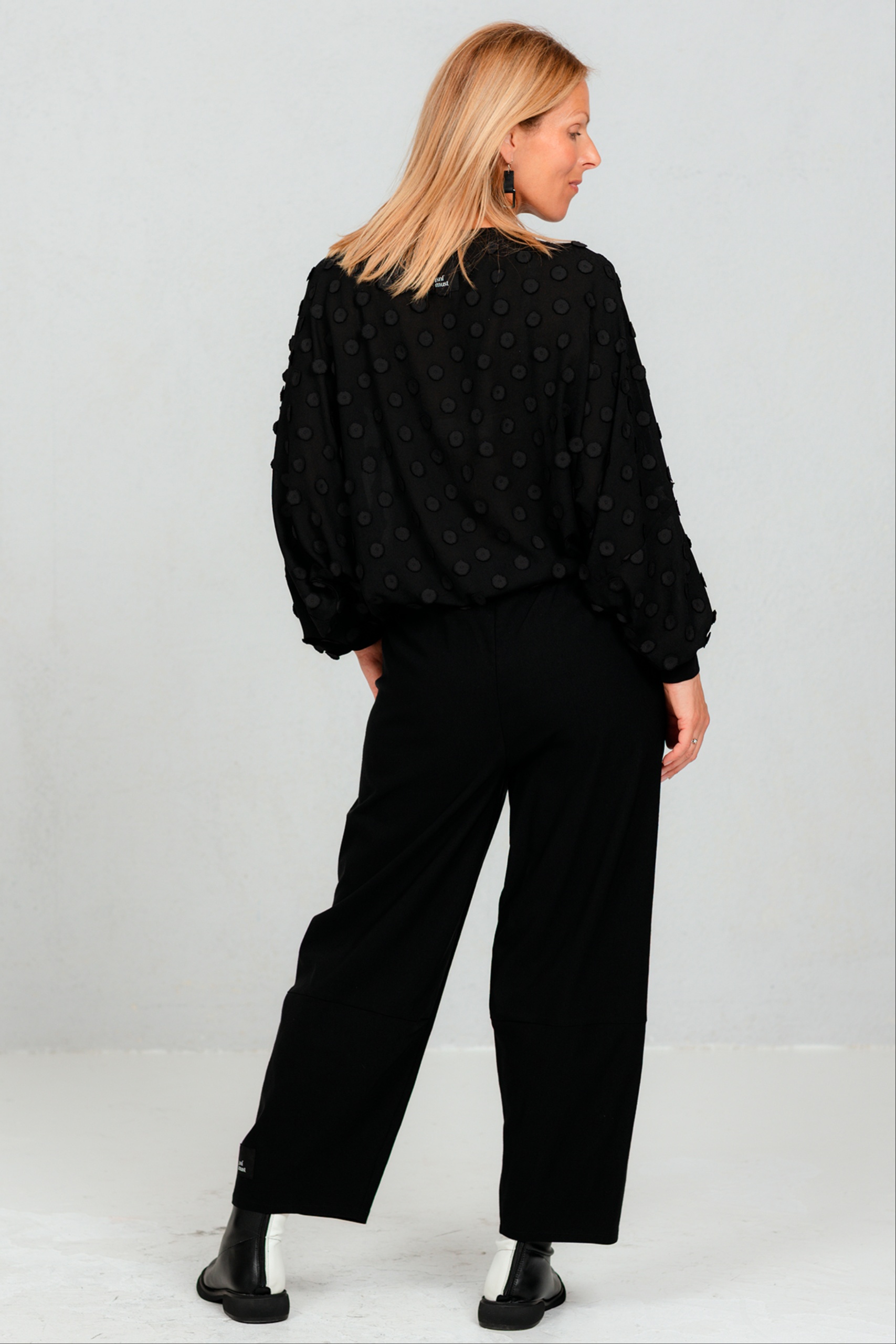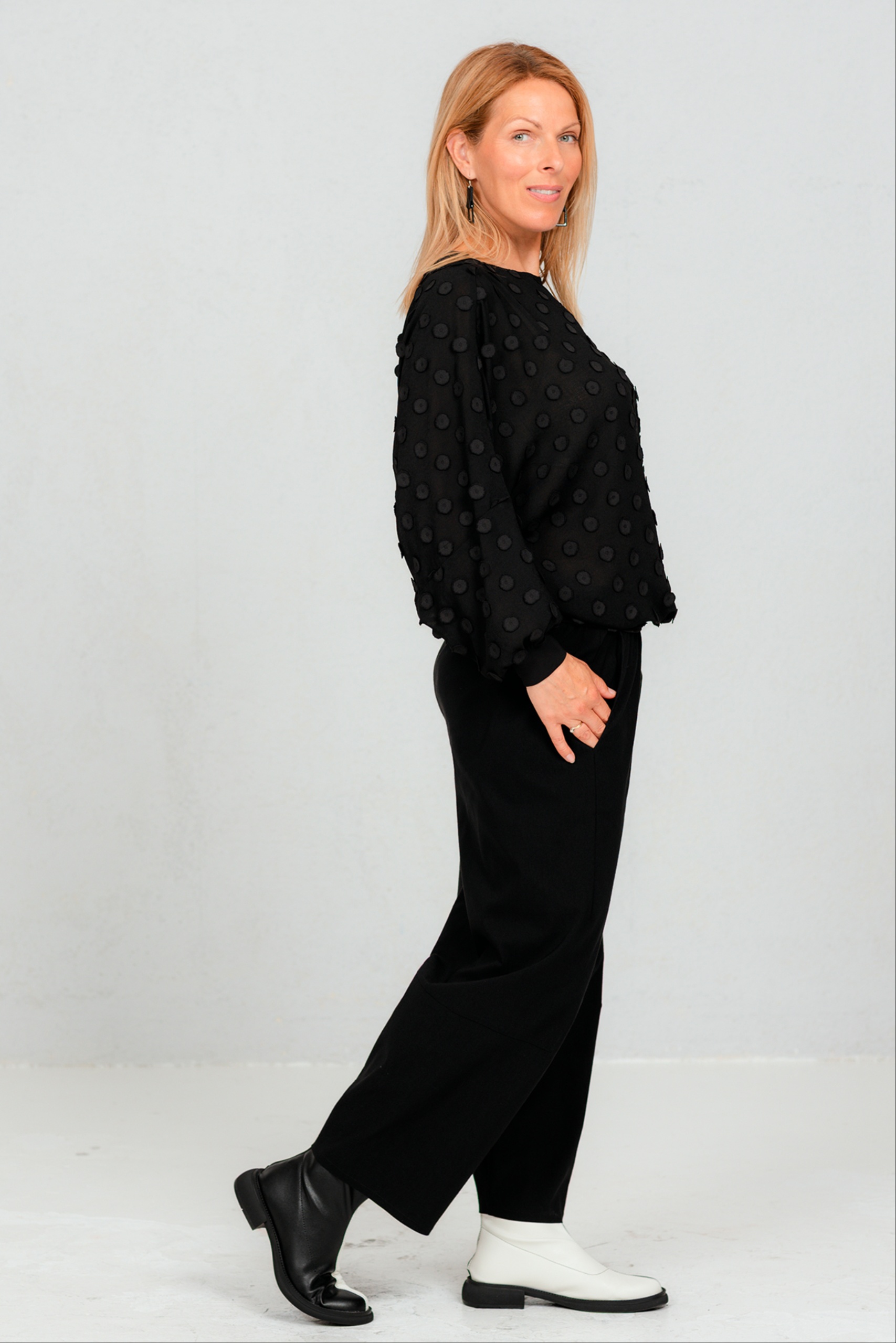 A spacious blouse with an enchanting pattern that combines comfort and style. The blouse’s mottled texture creates an exciting and eye-catching look, while the roomy cut ensures freedom and comfort all day long. The elasticated cuffs and round neckline add practicality and elegance. Perfect for everyday wear as well as festive occasions. Pair with your favourite trousers or skirt for a stylish and timeless look.