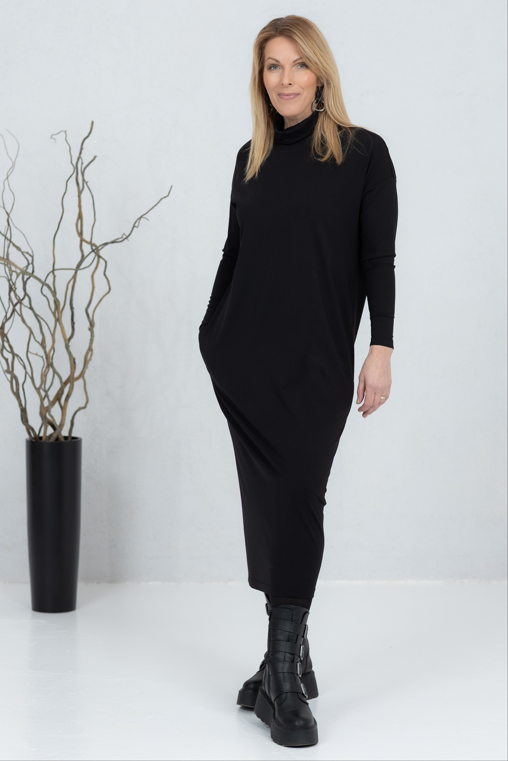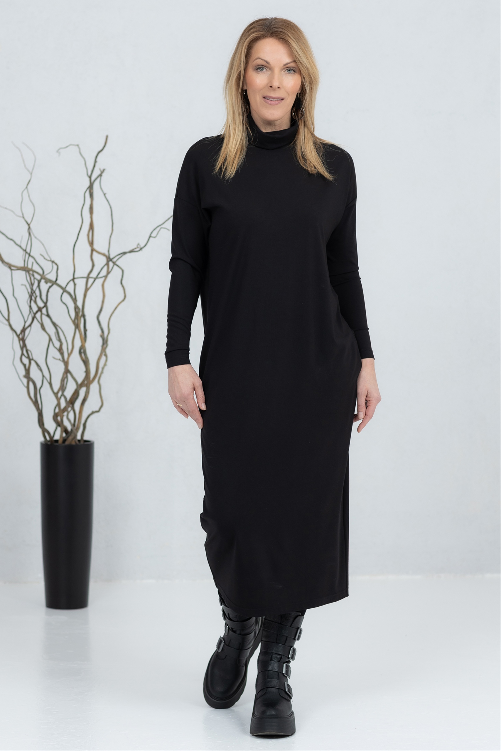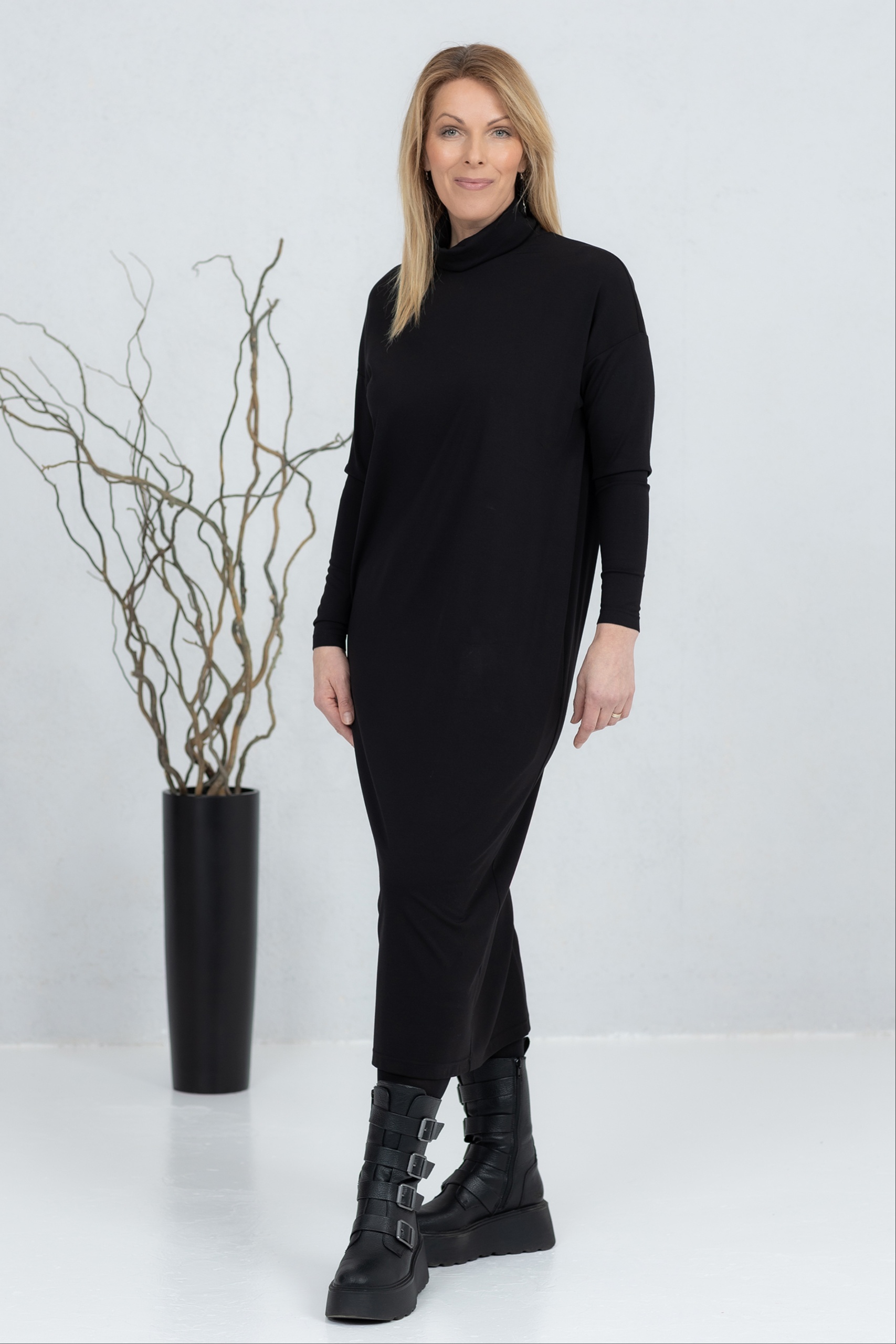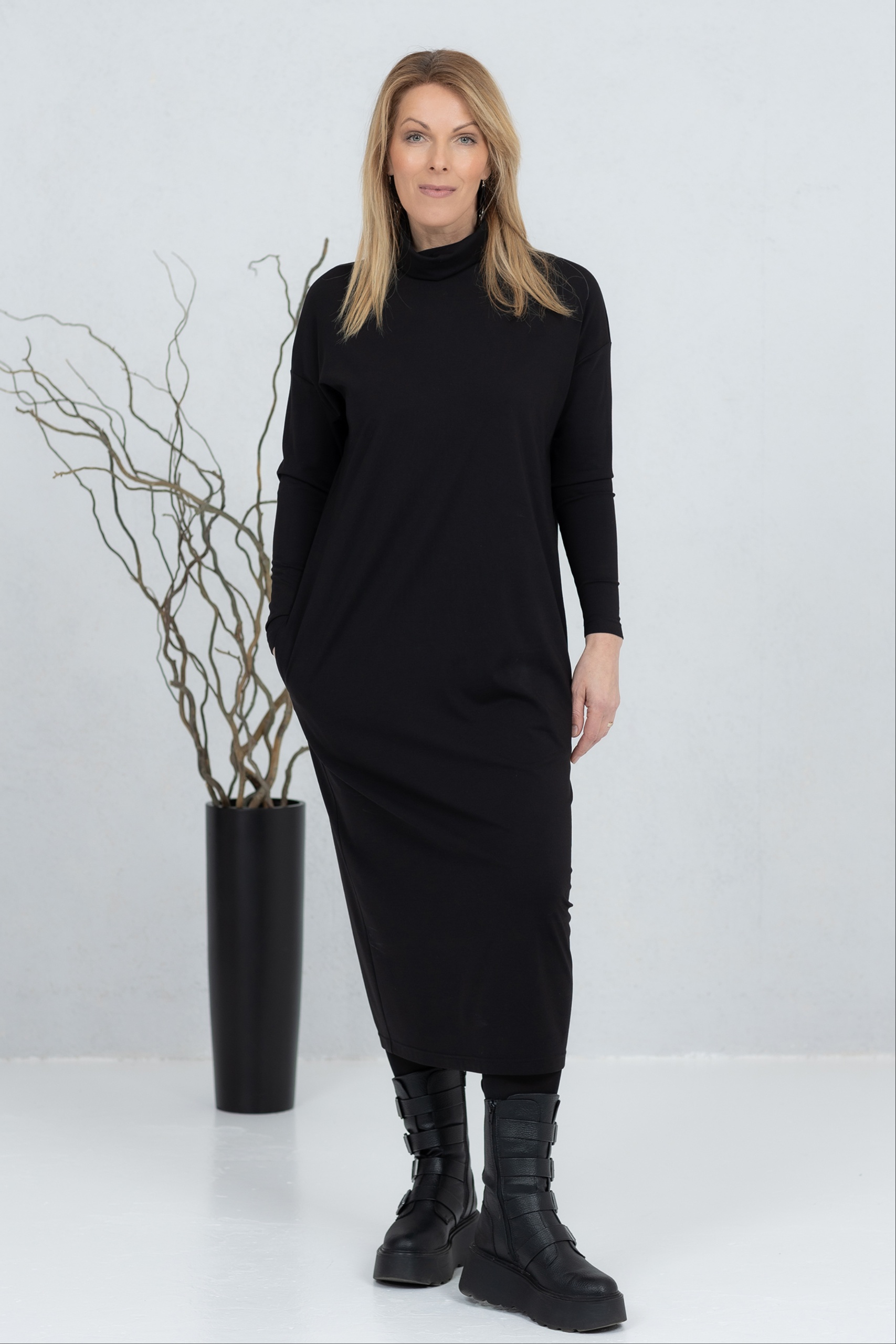 The Kishi is a high-neck midi dress that combines minimalist style with everyday comfort. The soft and stretchy fabric drapes beautifully and ensures a comfortable feel all day long. The straight and slightly flared cut creates a clean silhouette, complemented by practical side pockets. The midi length and simple design make this dress a versatile choice for work, a day on the town or a more casual moment. The Kishi is a timeless wardrobe companion that is easy to combine with boots, sneakers or more elegant accessories.