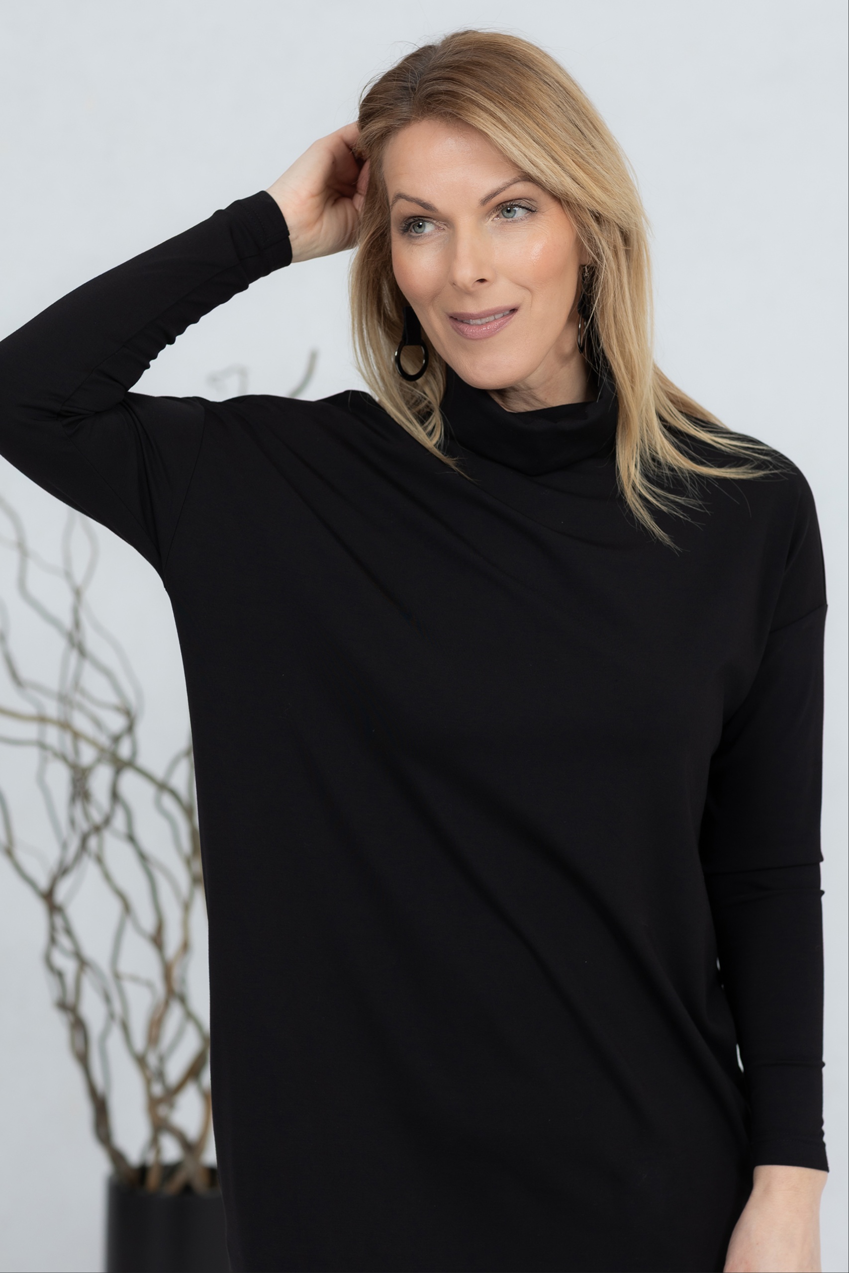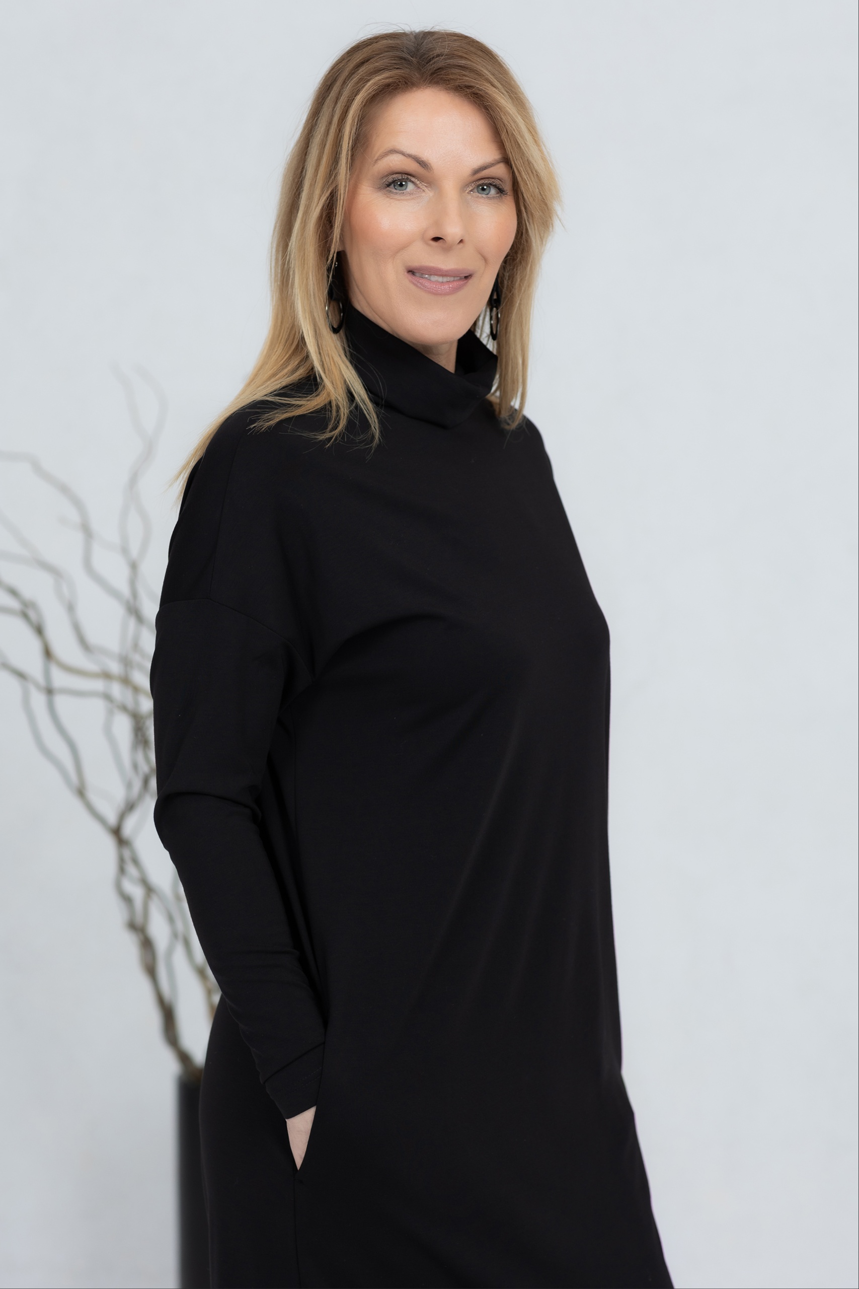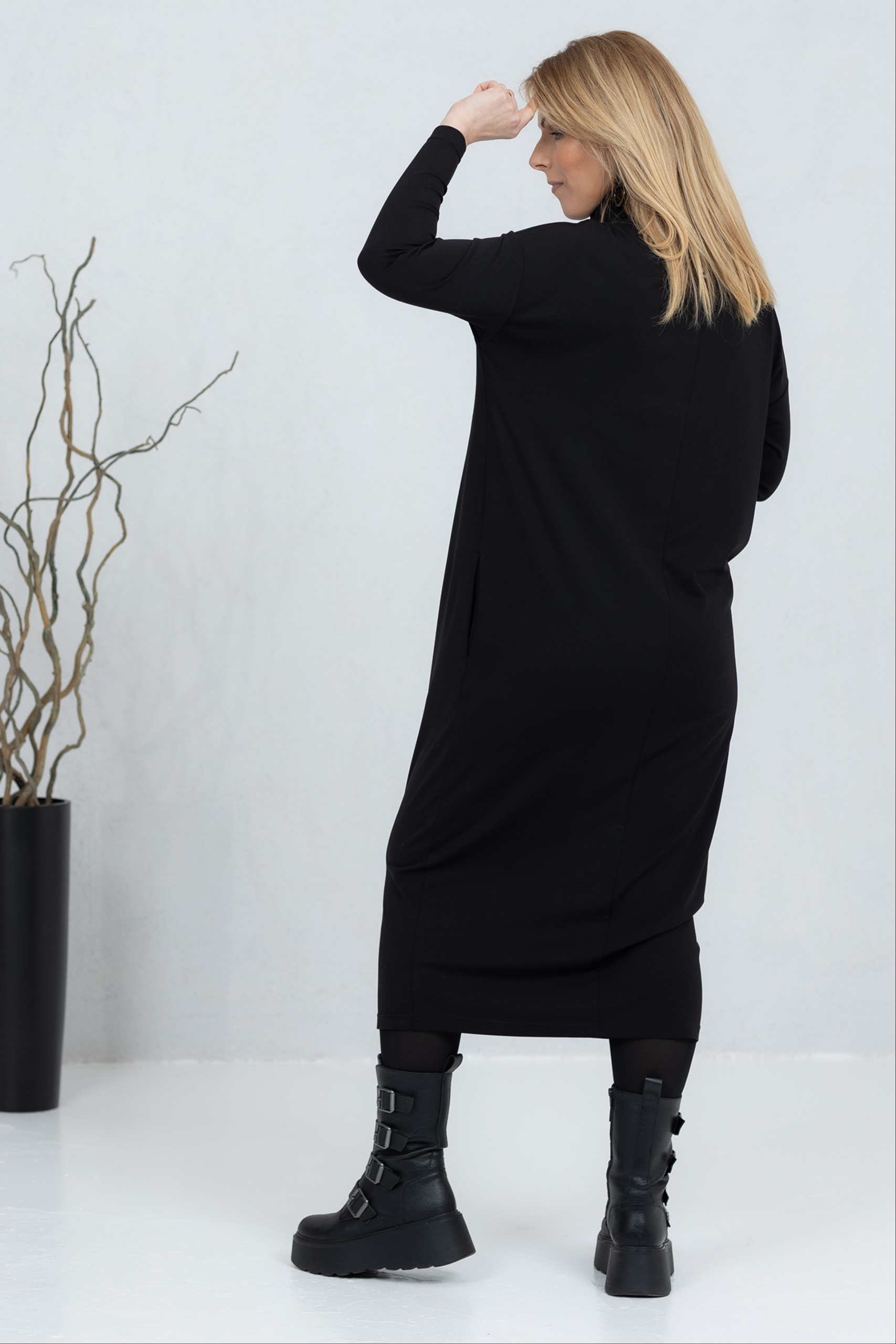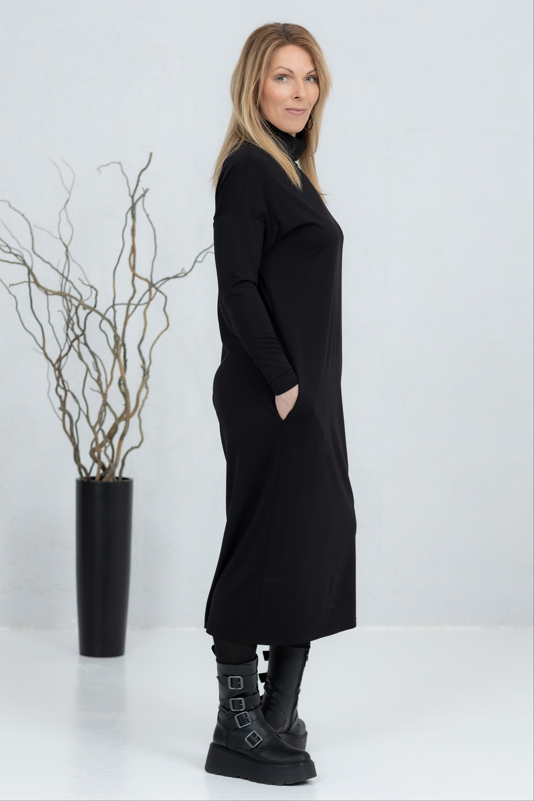 The Kishi is a high-neck midi dress that combines minimalist style with everyday comfort. The soft and stretchy fabric drapes beautifully and ensures a comfortable feel all day long. The straight and slightly flared cut creates a clean silhouette, complemented by practical side pockets. The midi length and simple design make this dress a versatile choice for work, a day on the town or a more casual moment. The Kishi is a timeless wardrobe companion that is easy to combine with boots, sneakers or more elegant accessories.