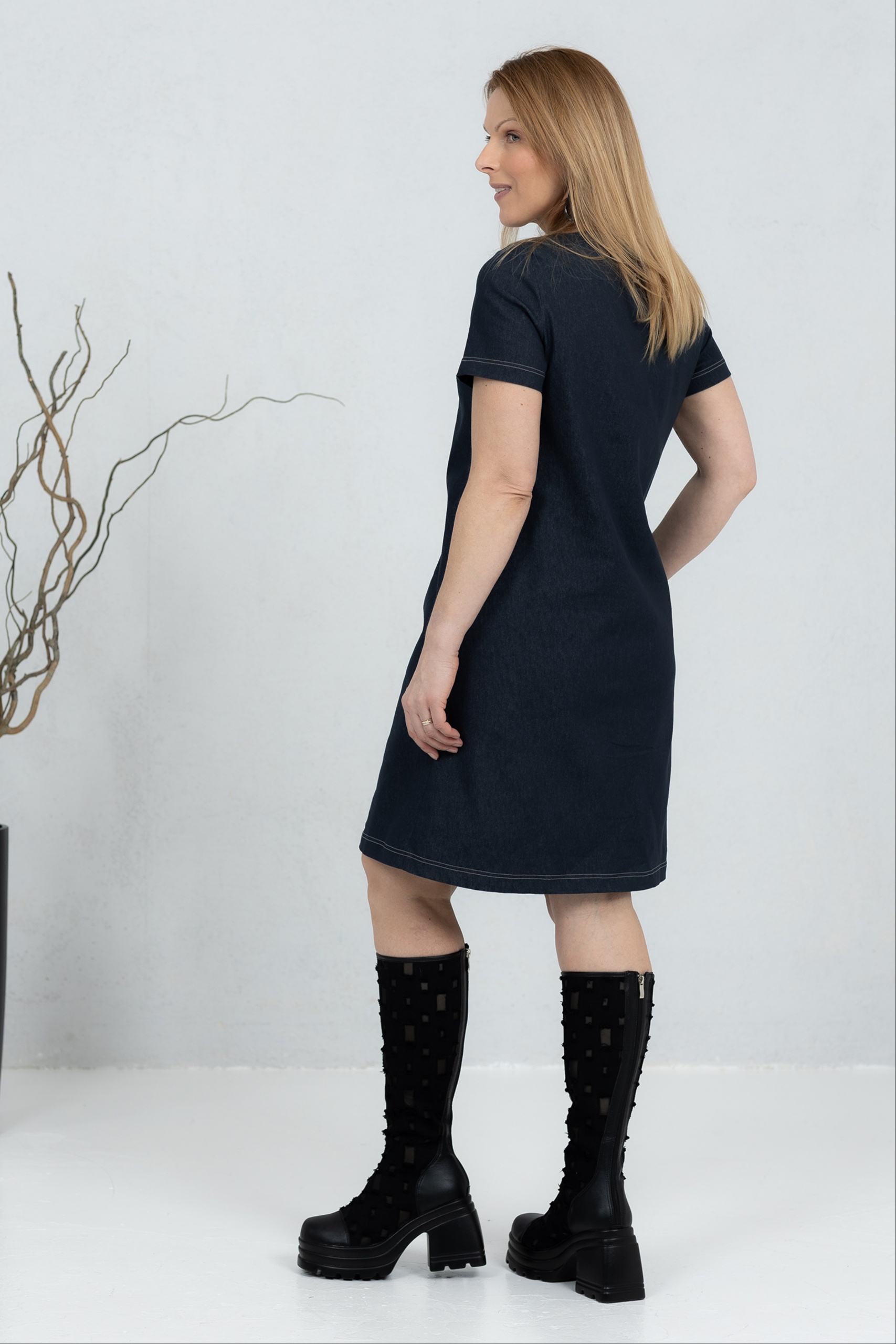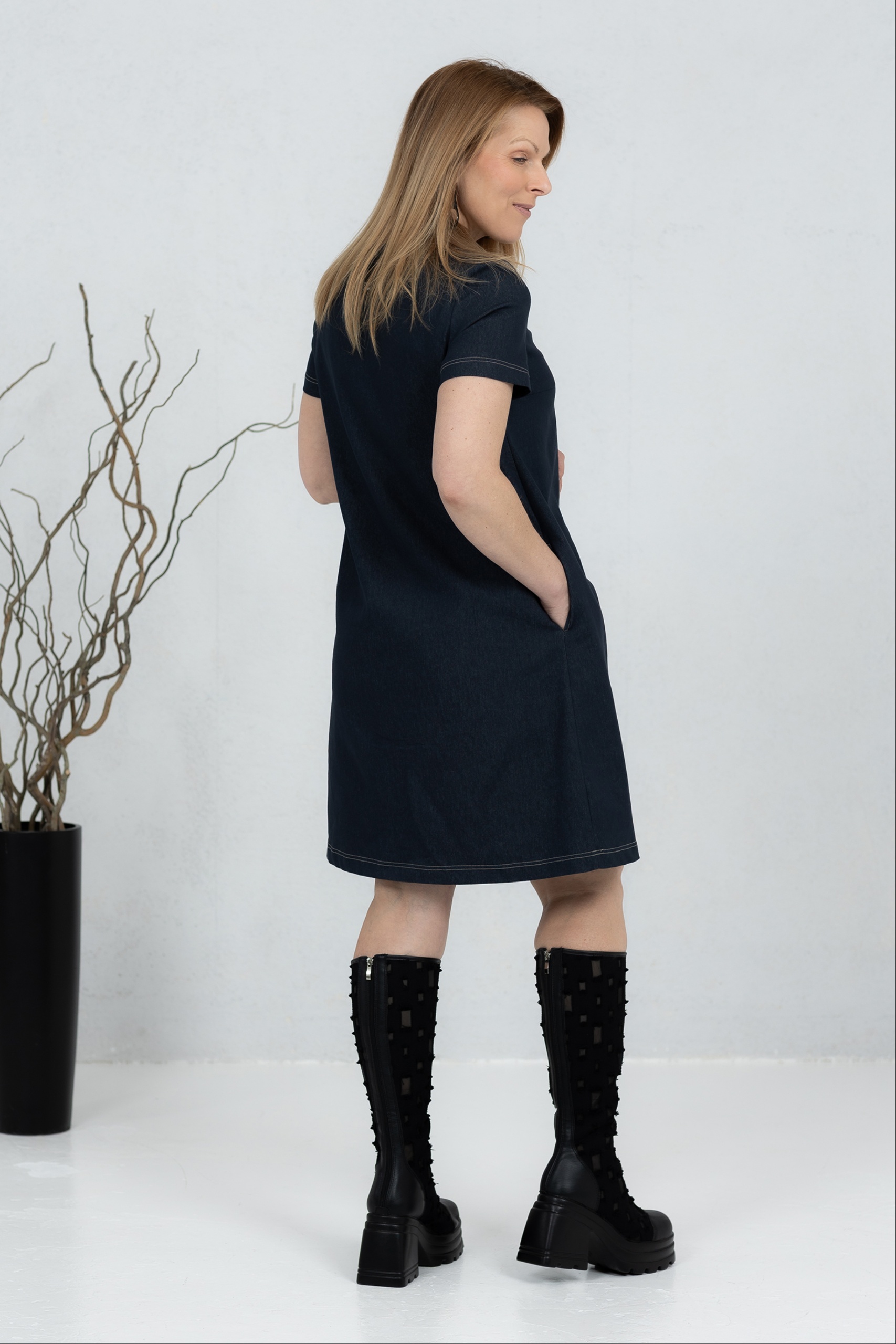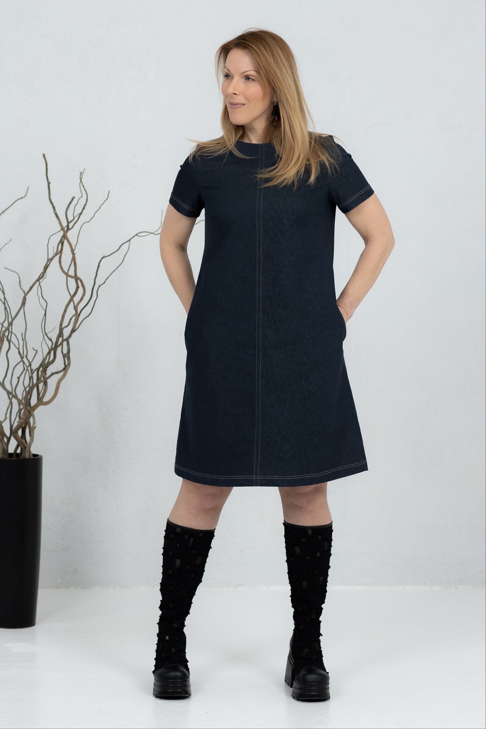Misaki is a short denim dress with a modern and clean line, combining classic denim with minimalist design. The straight, slightly A-cut silhouette offers comfortable freedom of movement. Contrast quilted details add character and highlight the structure of the dress. Practical side pockets make it a comfortable everyday choice. Wear it with boots or sneakers – Misaki is perfect for both work and leisure when you want a simple yet confident style.