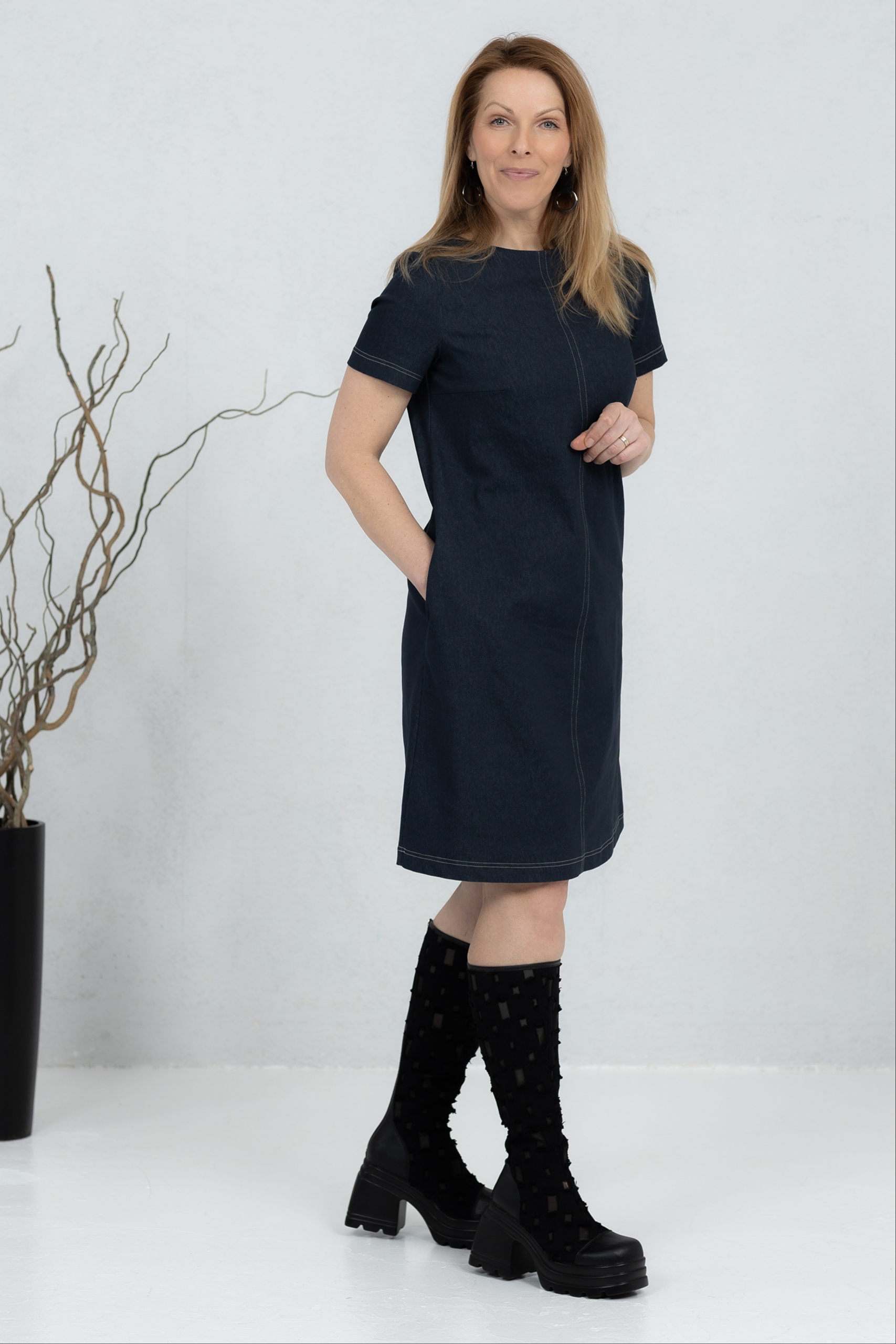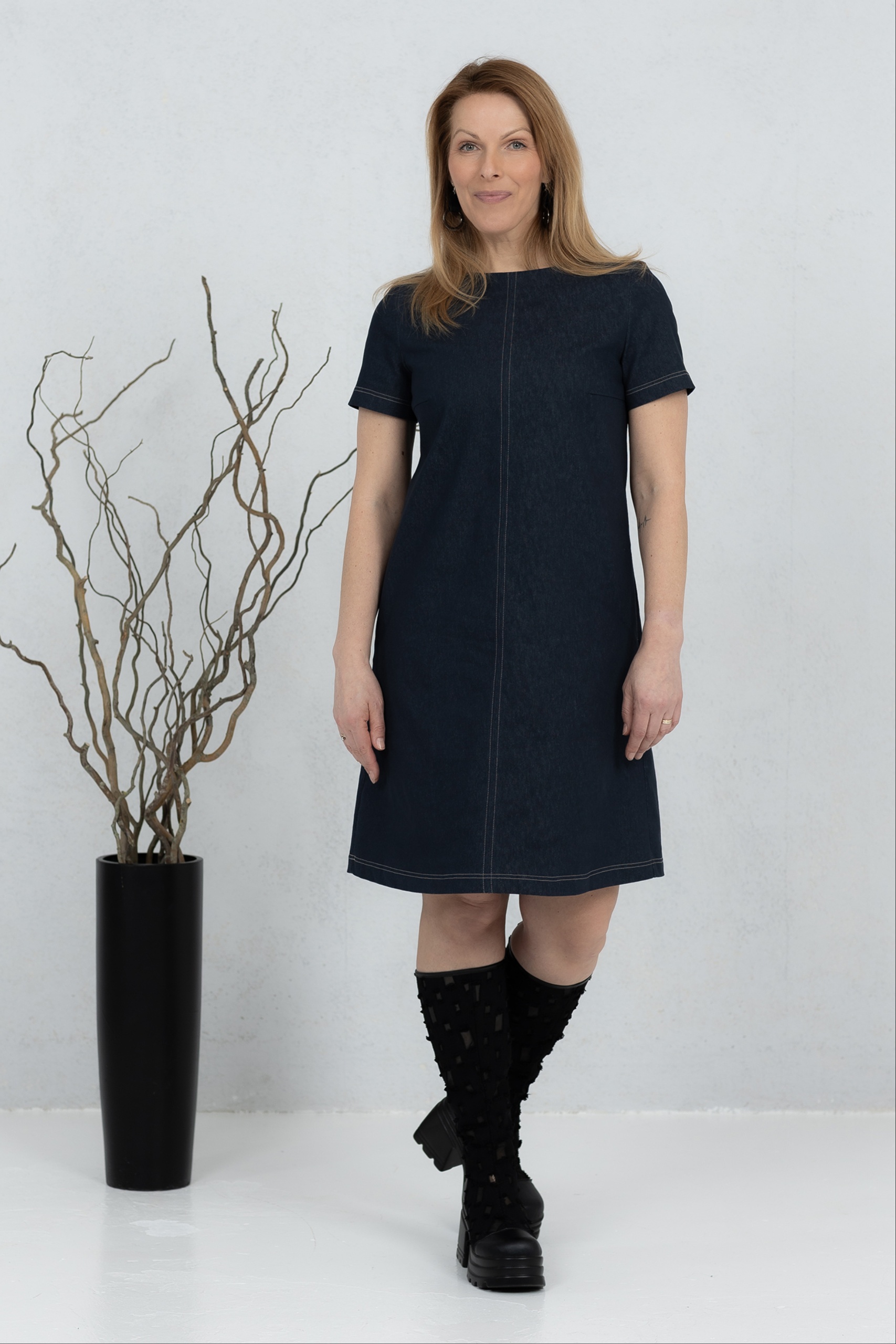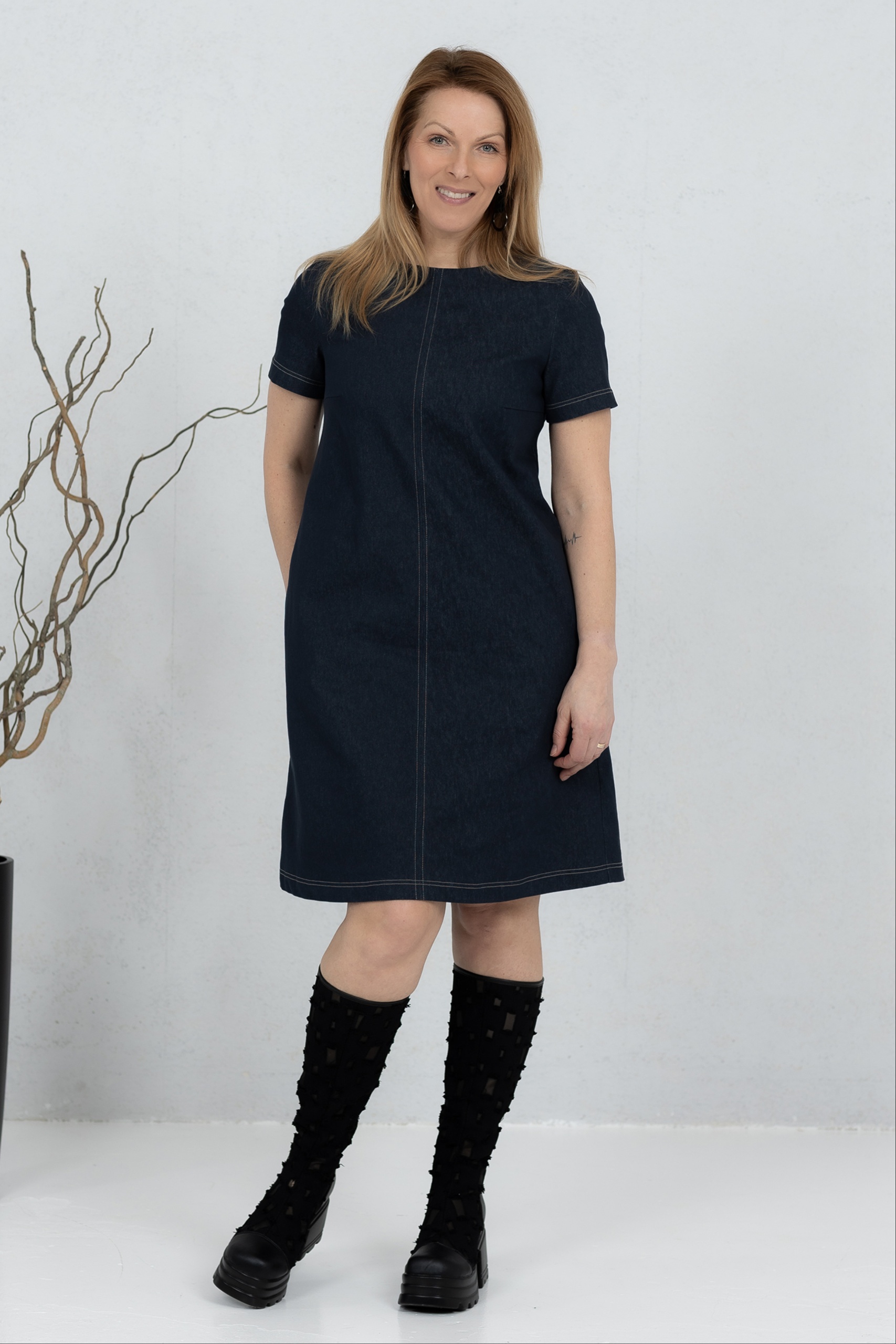 Misaki is a short denim dress with a modern and clean line, combining classic denim with minimalist design. The straight, slightly A-cut silhouette offers comfortable freedom of movement. Contrast quilted details add character and highlight the structure of the dress. Practical side pockets make it a comfortable everyday choice. Wear it with boots or sneakers – Misaki is perfect for both work and leisure when you want a simple yet confident style.
