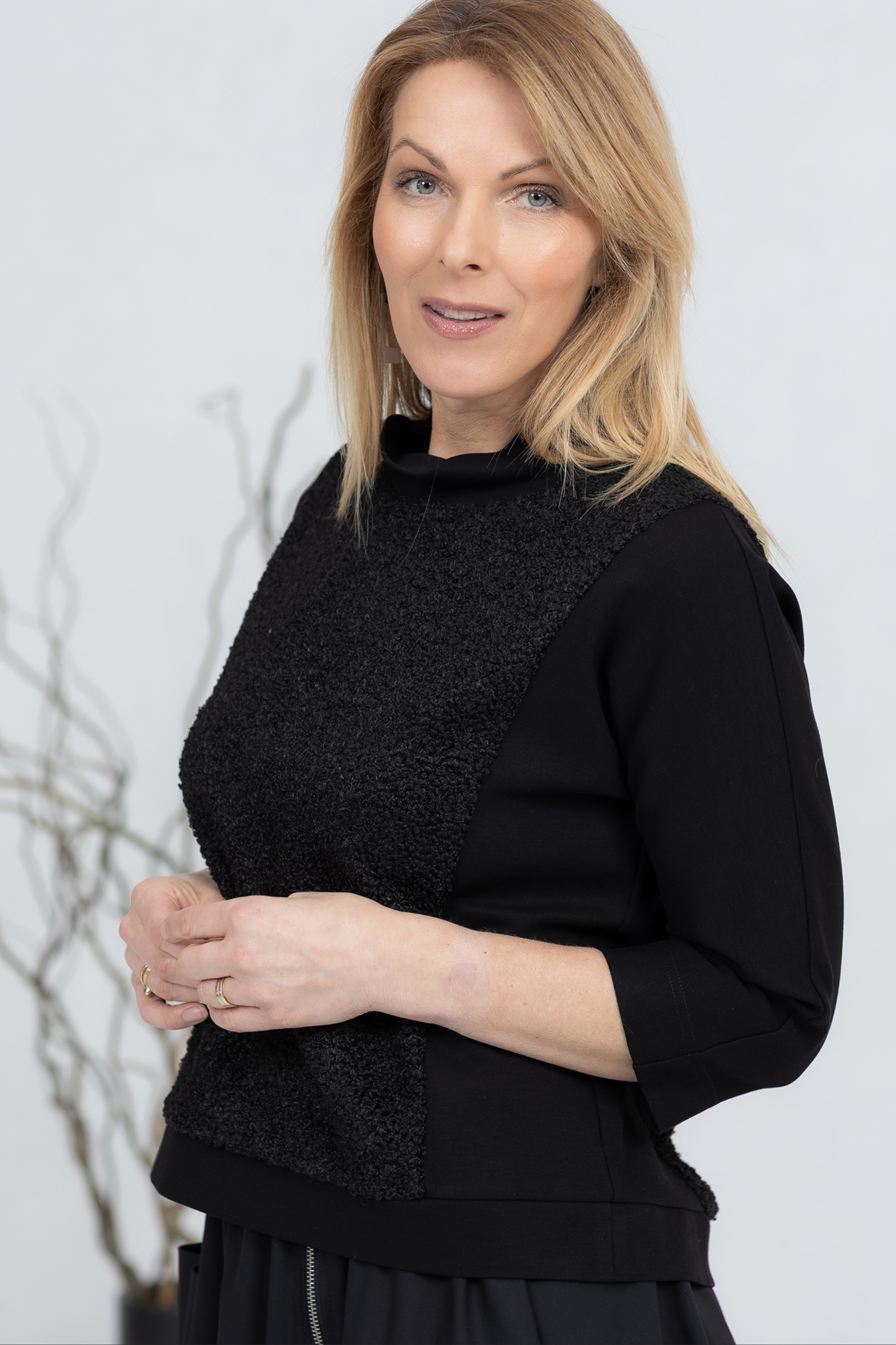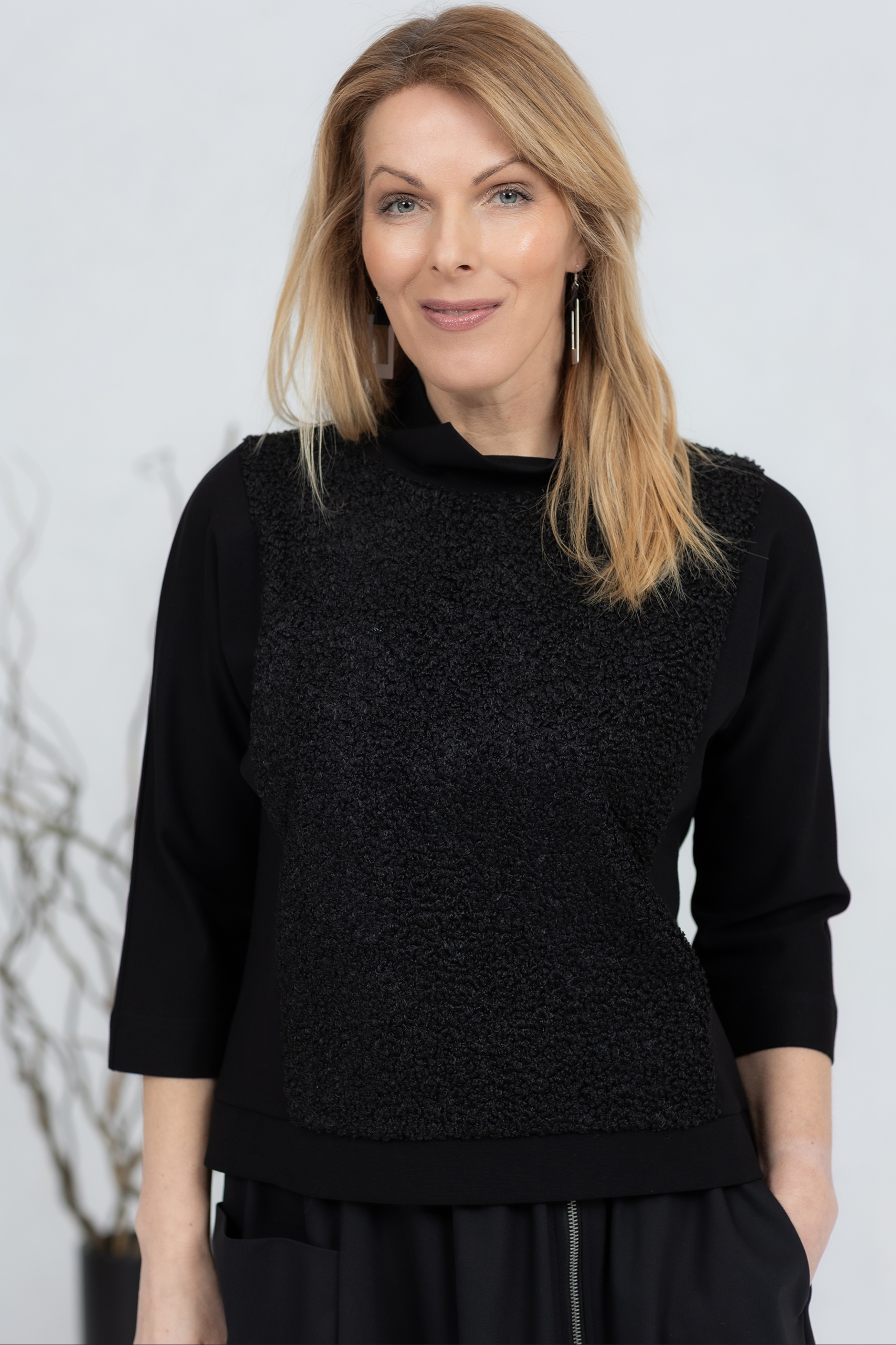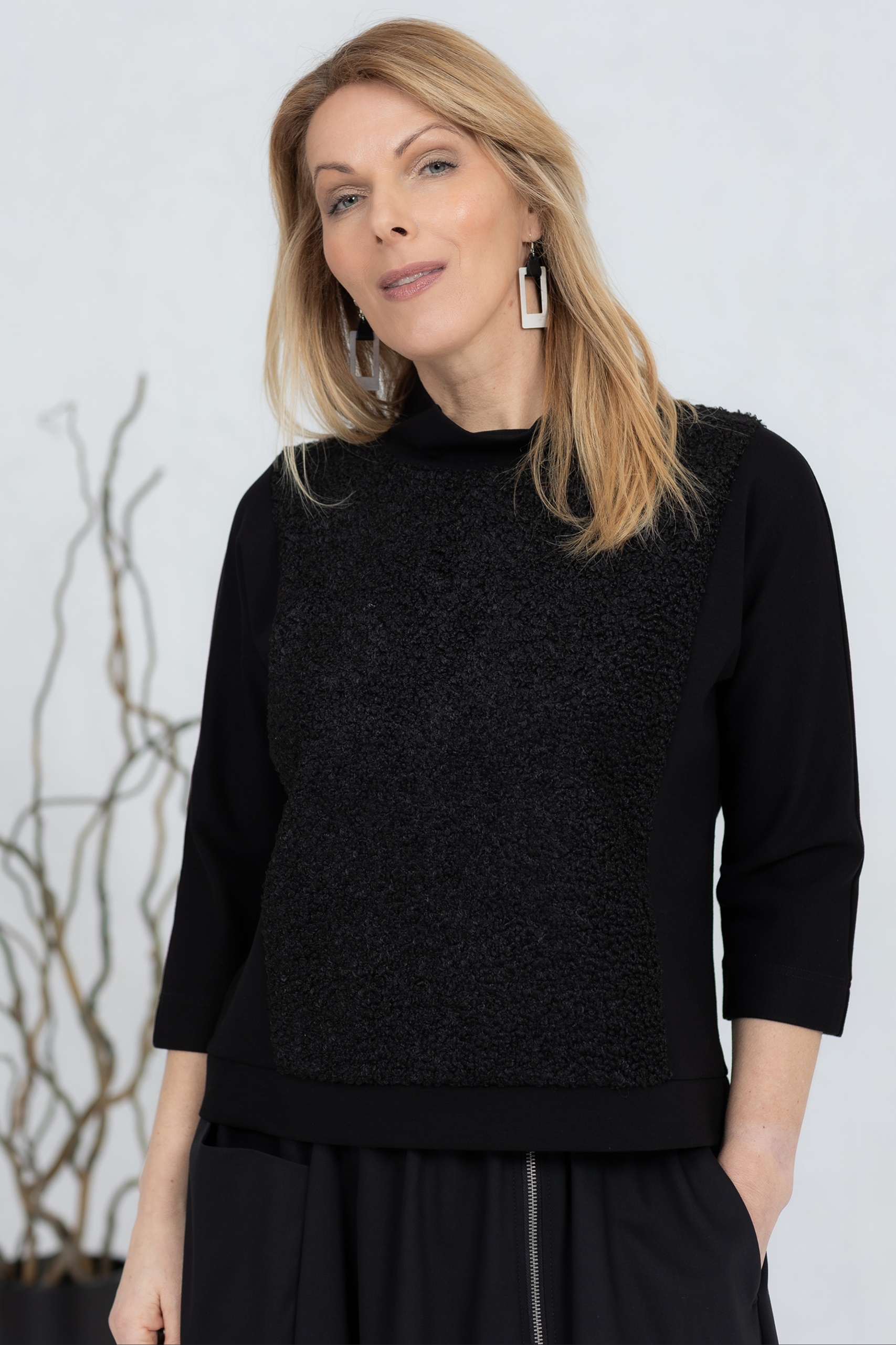 Black, three-quarter sleeve blouse with soft teddy fabric on the front and back. The classic cut ensures a comfortable fit at all times and can be worn alone or layered. The wide neckline adds character and options for different styles. The sleeves and sides are made from a stretchy, thicker viscose fabric for good freedom of movement.