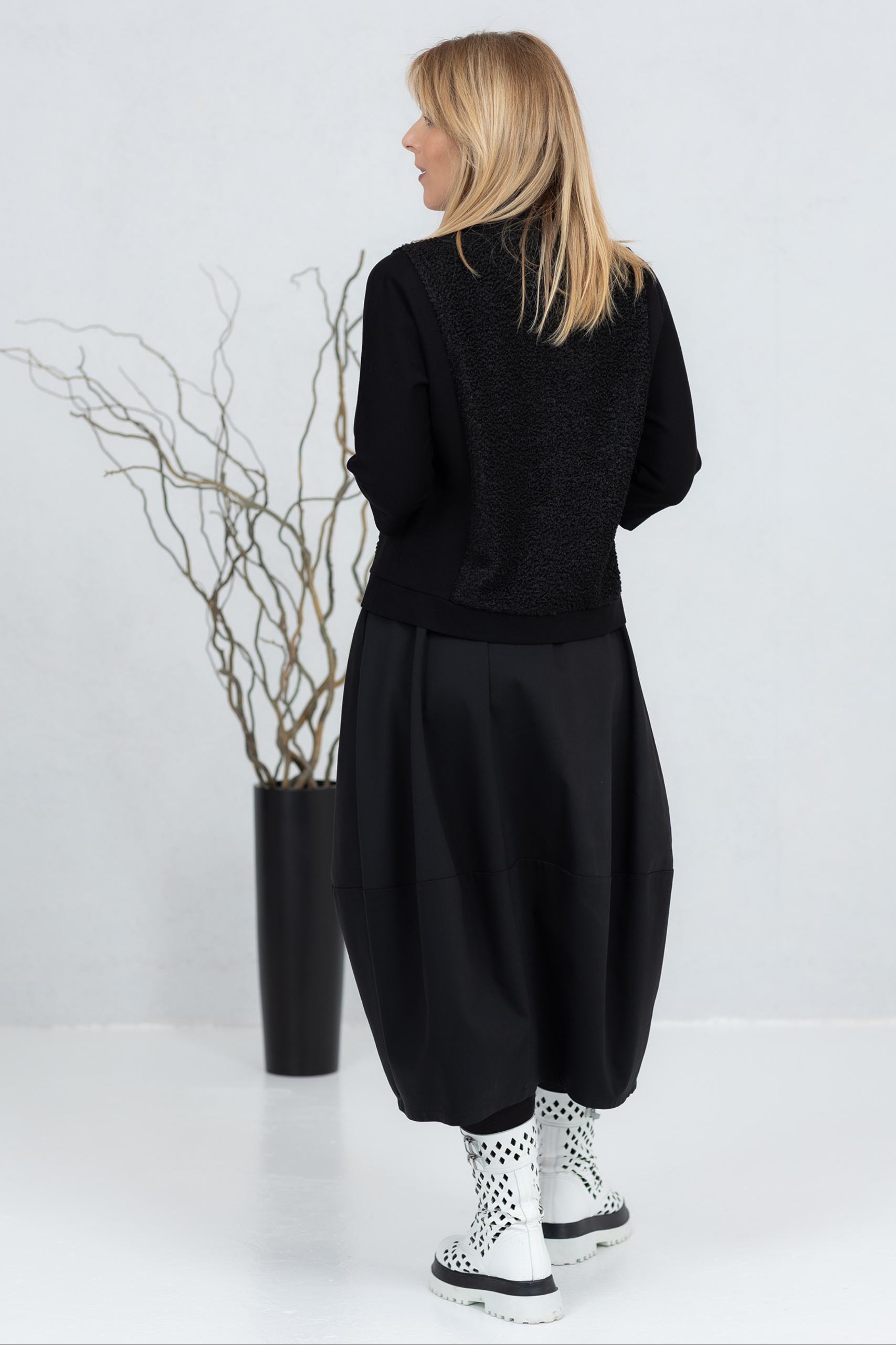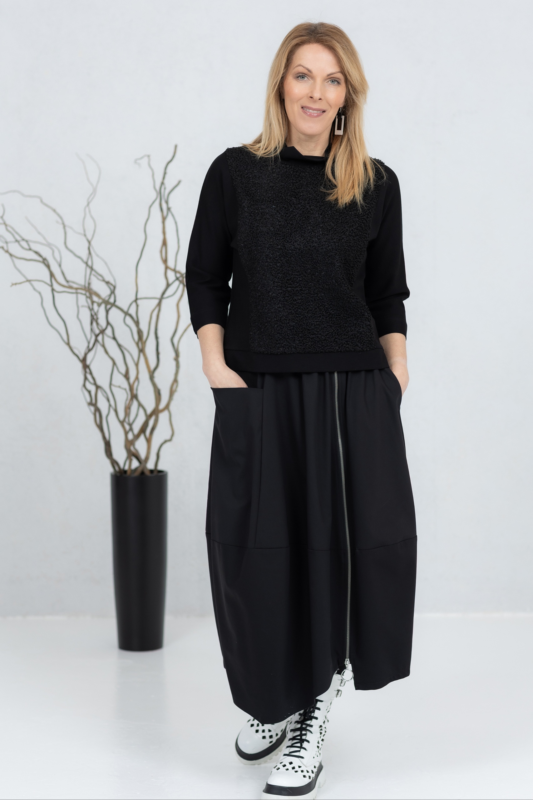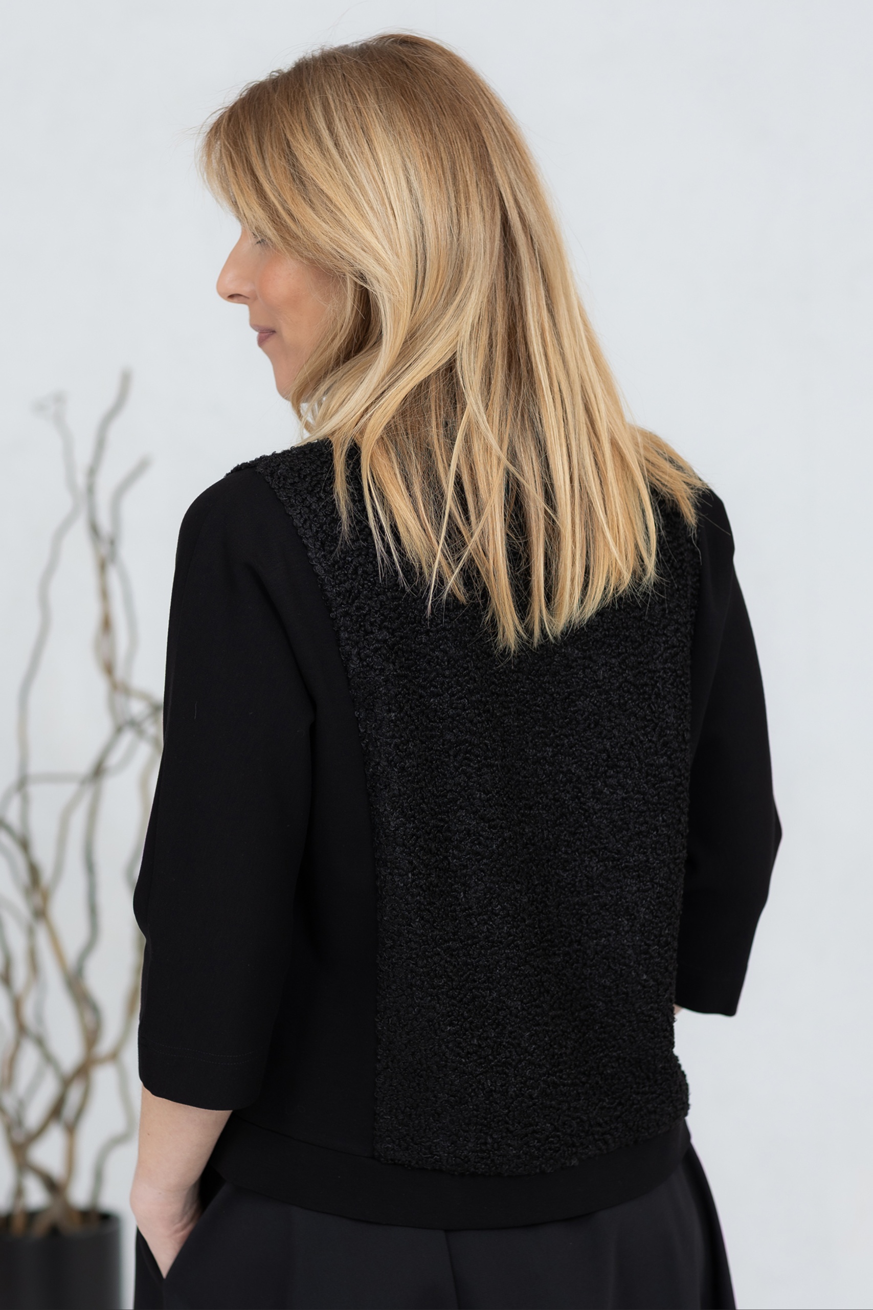 Black, three-quarter sleeve blouse with soft teddy fabric on the front and back. The classic cut ensures a comfortable fit at all times and can be worn alone or layered. The wide neckline adds character and options for different styles. The sleeves and sides are made from a stretchy, thicker viscose fabric for good freedom of movement.