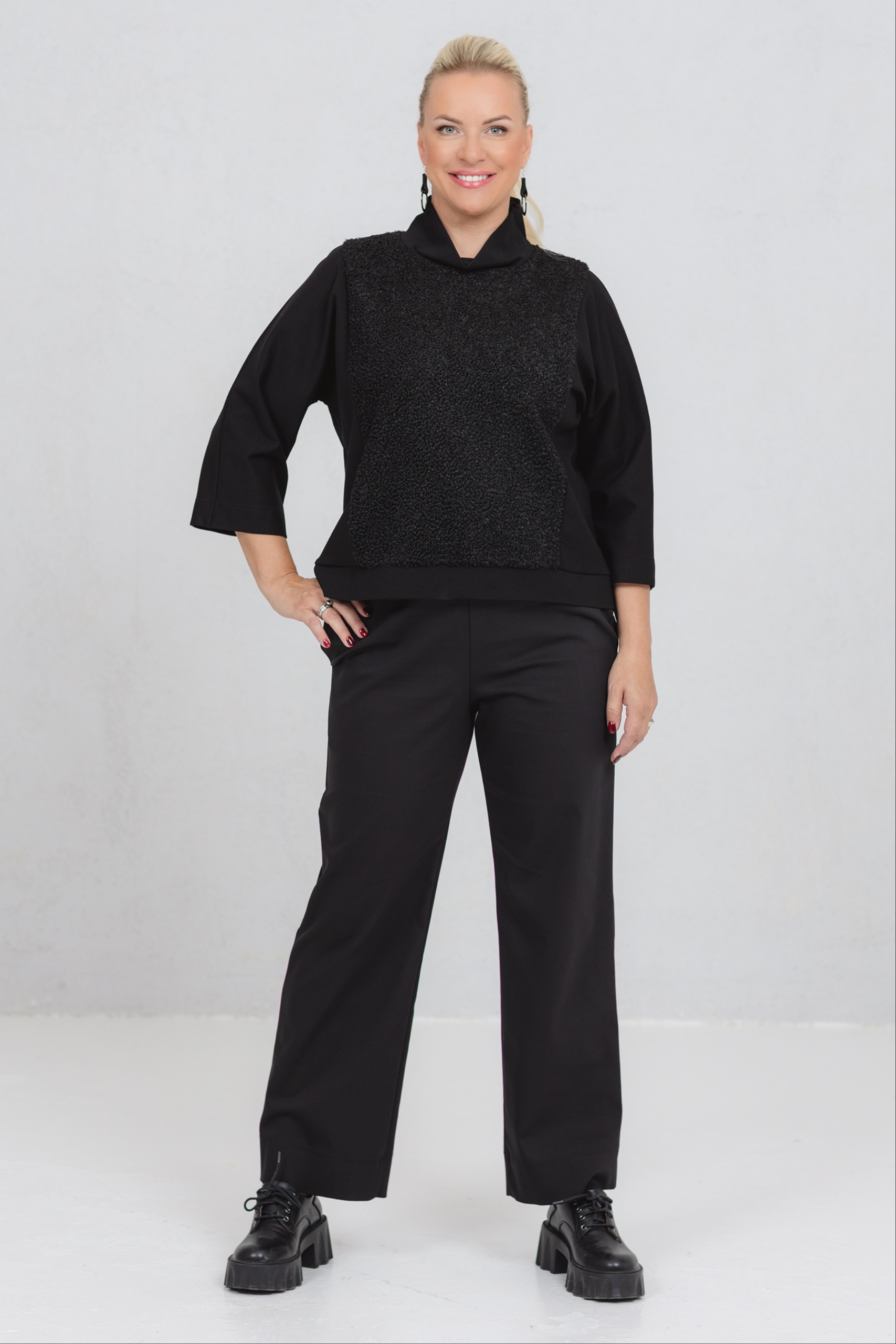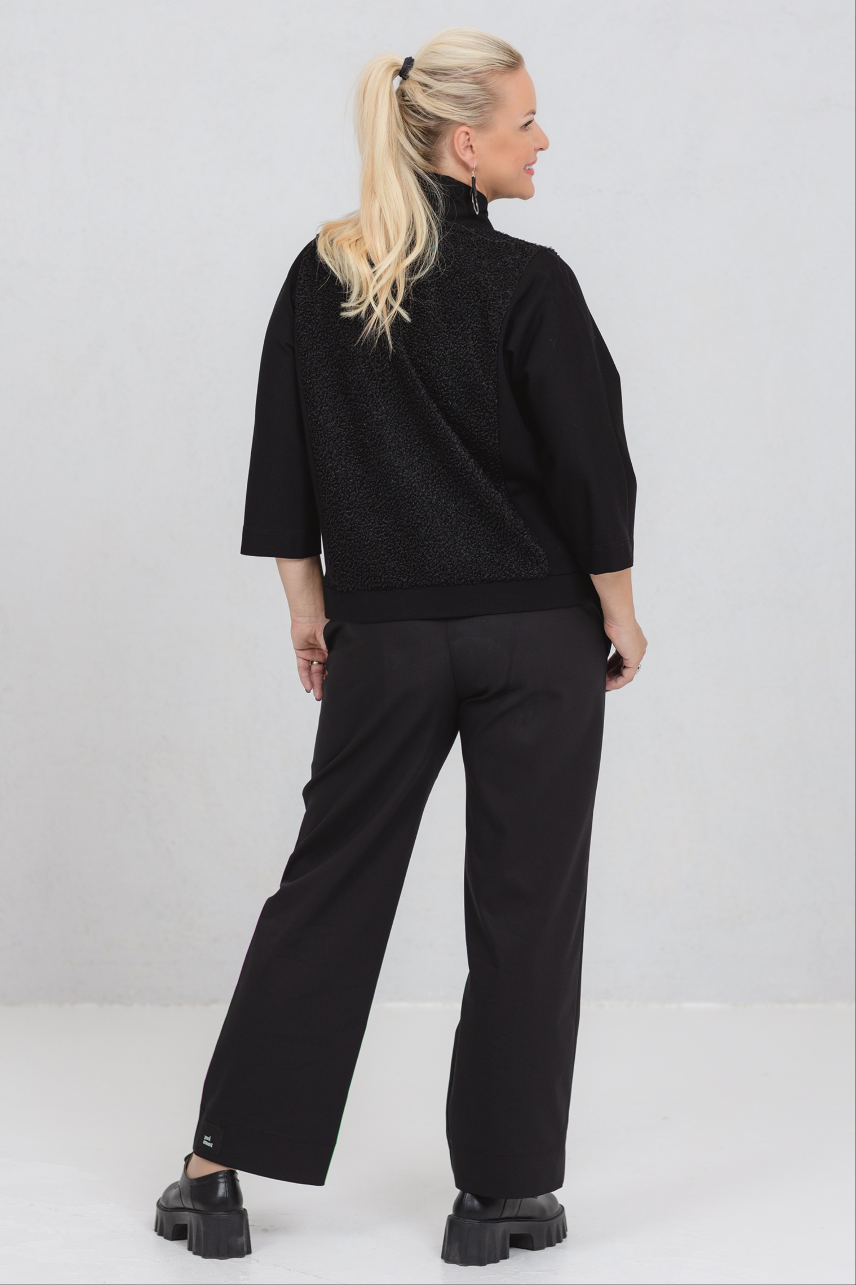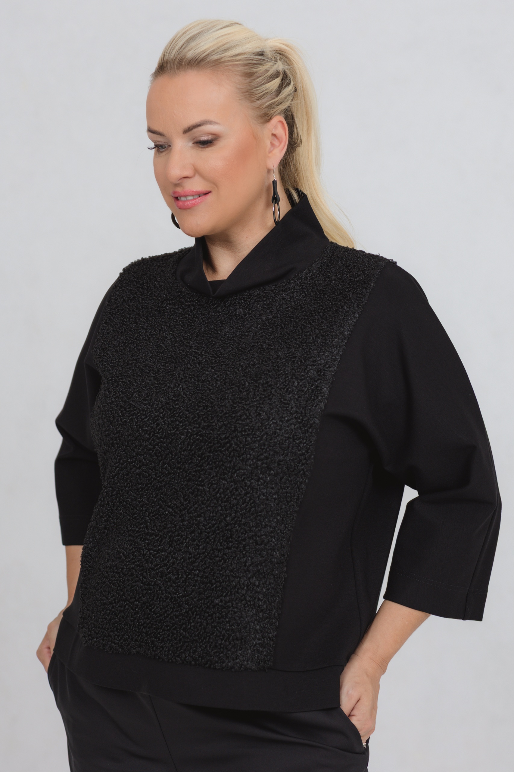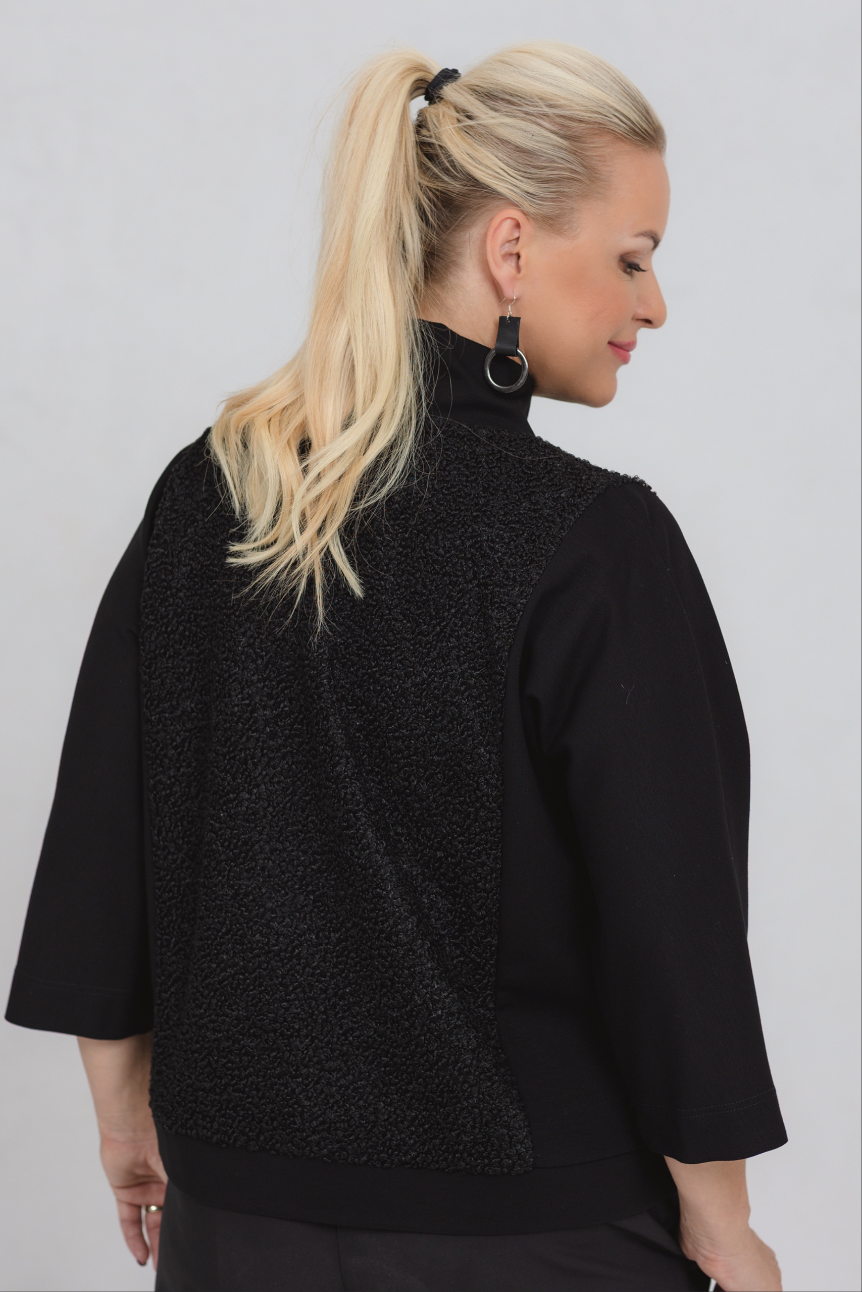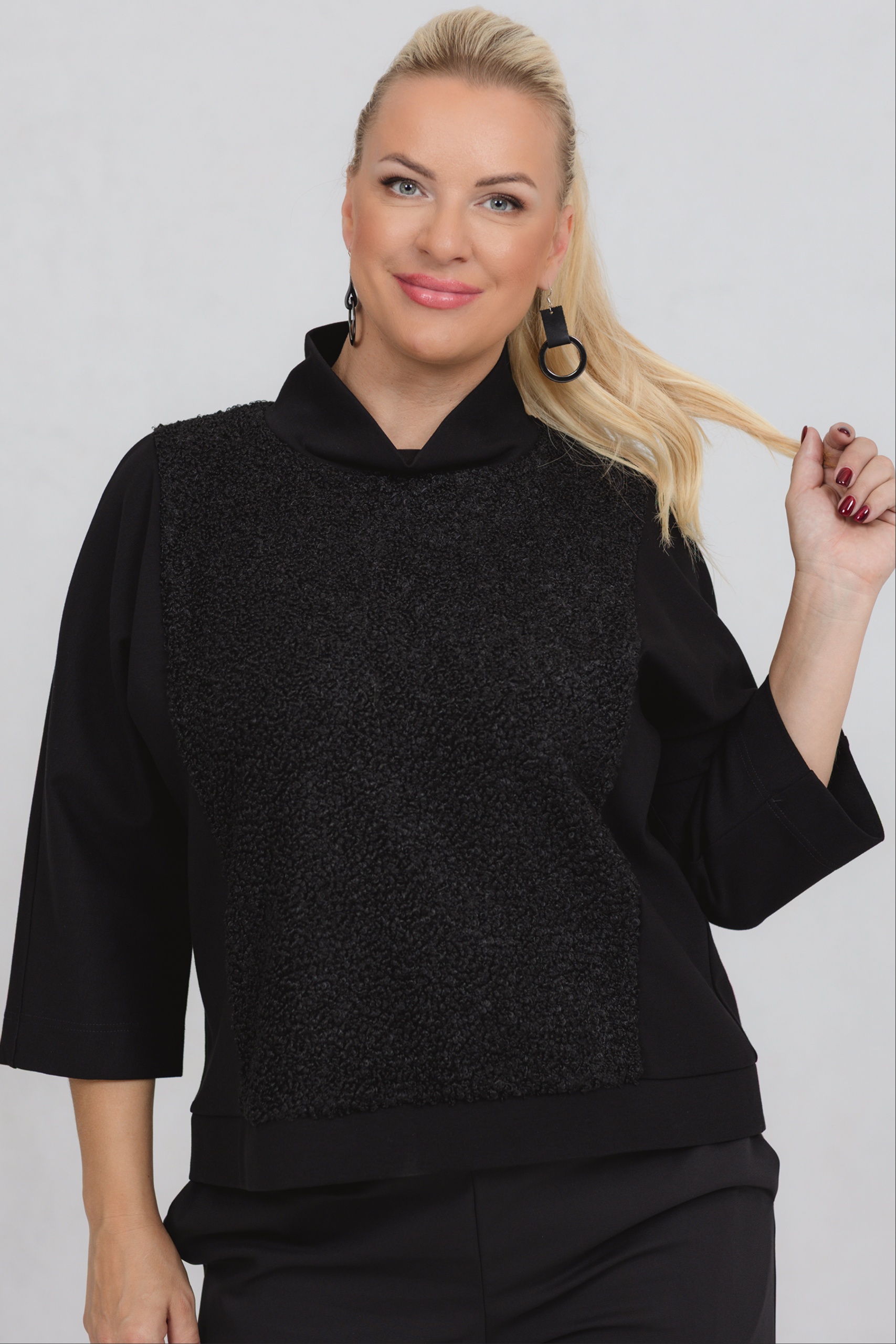 Black, three-quarter sleeve blouse with soft teddy fabric on the front and back. The classic cut ensures a comfortable fit at all times and can be worn alone or layered. The wide neckline adds character and versatility for a variety of styles. The sleeves and sides are made from a stretchy, thicker viscose fabric for good freedom of movement.