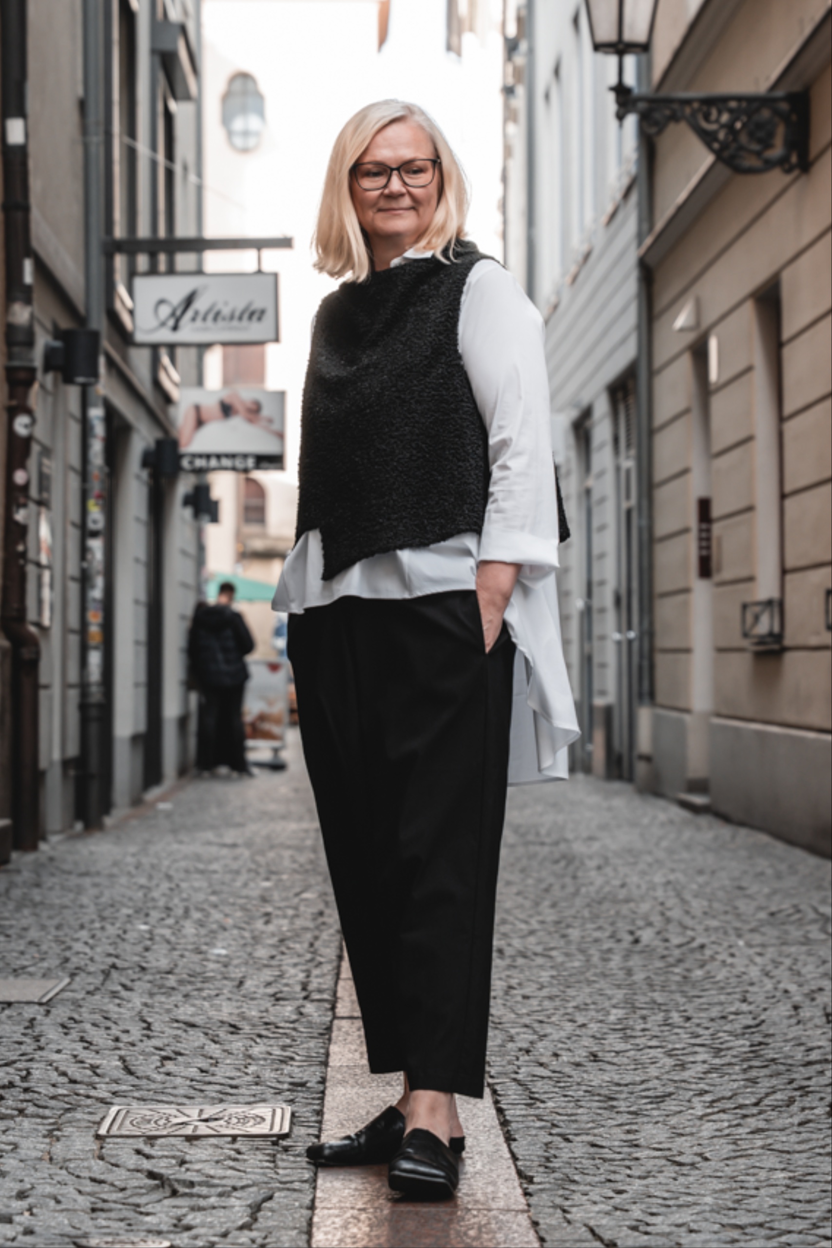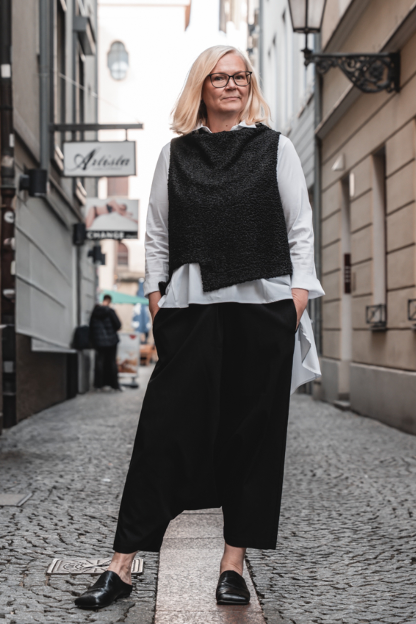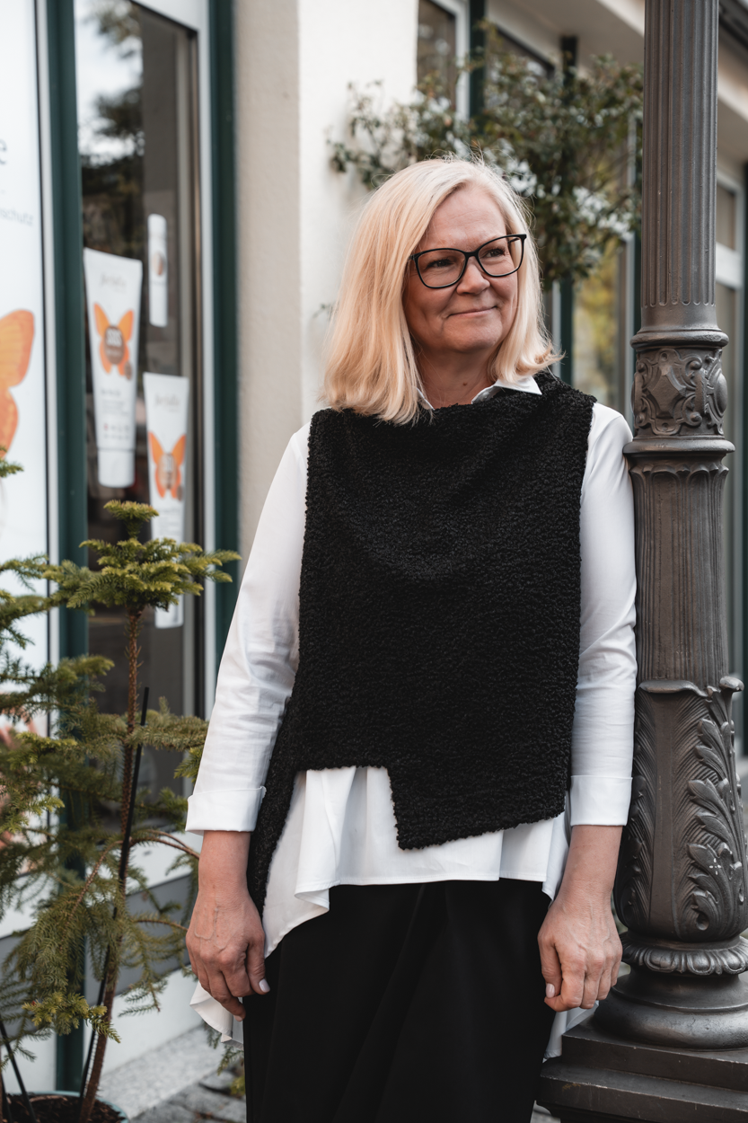 This black vest is a modern and versatile addition to your everyday wardrobe. The soft and furry teddy fabric makes it the perfect winter wardrobe staple. The higher collar and asymmetric bottom hem create a dynamic silhouette that adds character to layered clothing. The straight cut of the vest allows it to be worn with a variety of blouses, dresses or shirts, always offering a new and fresh look. The material is pleasant and durable, ensuring the garment keeps its shape. It is the perfect choice for those who appreciate the balance between style and comfort.
