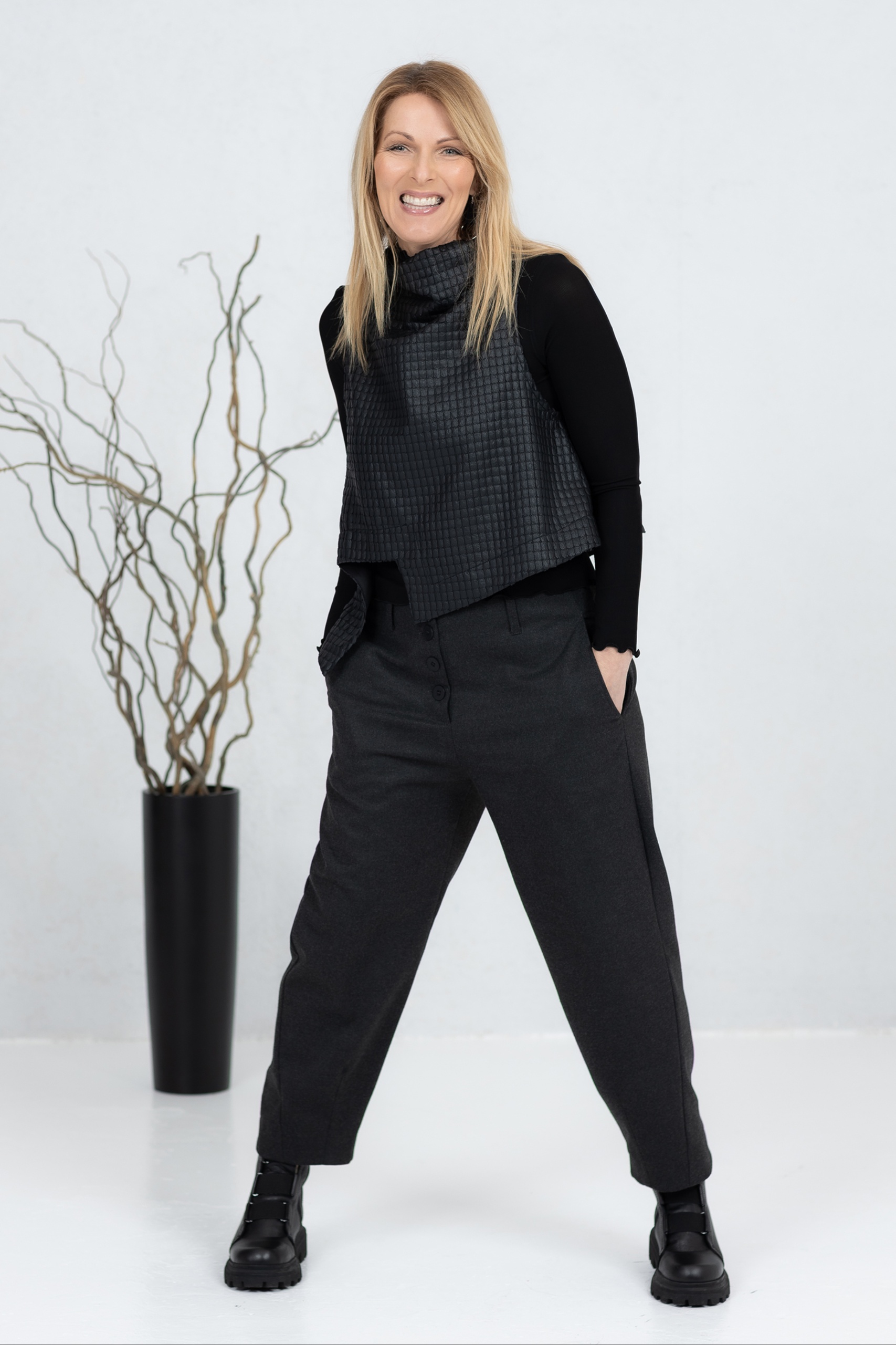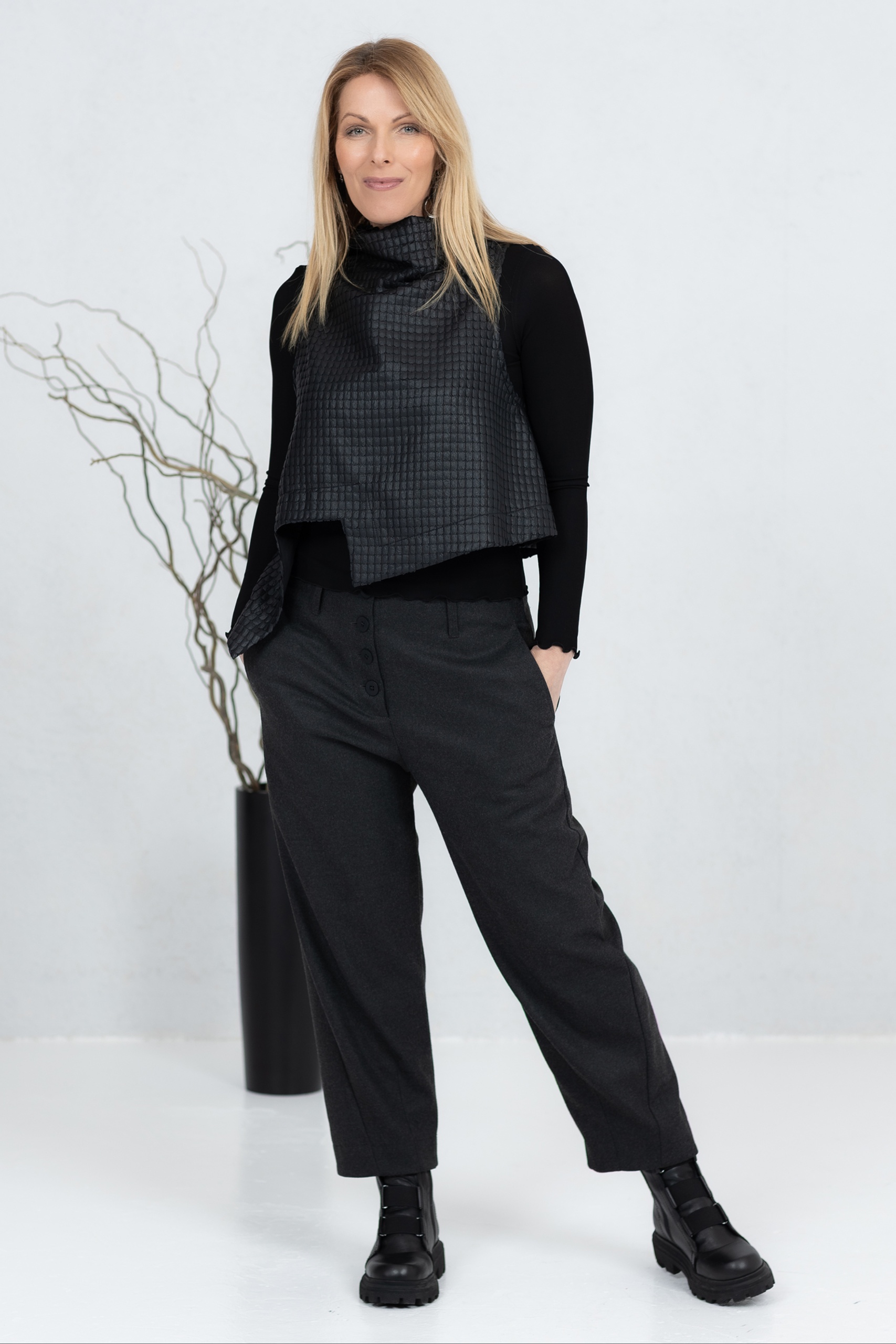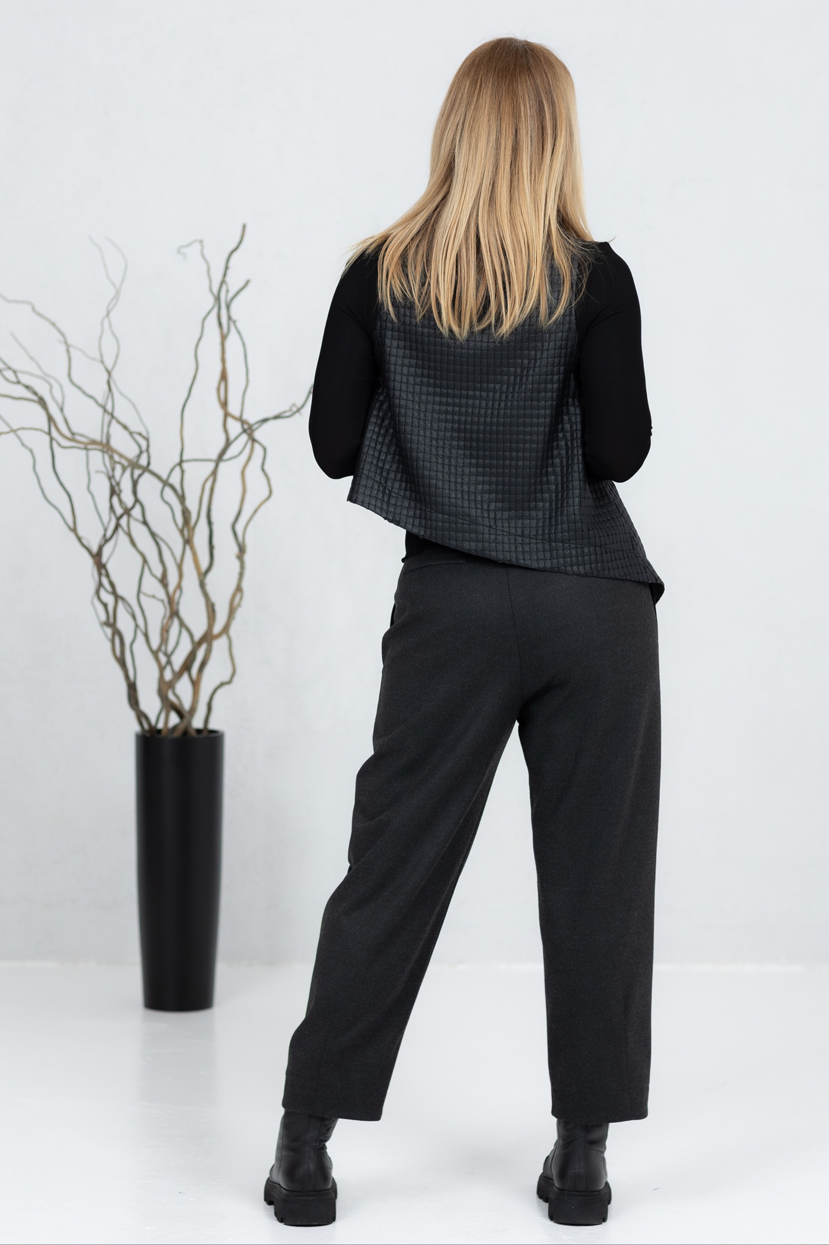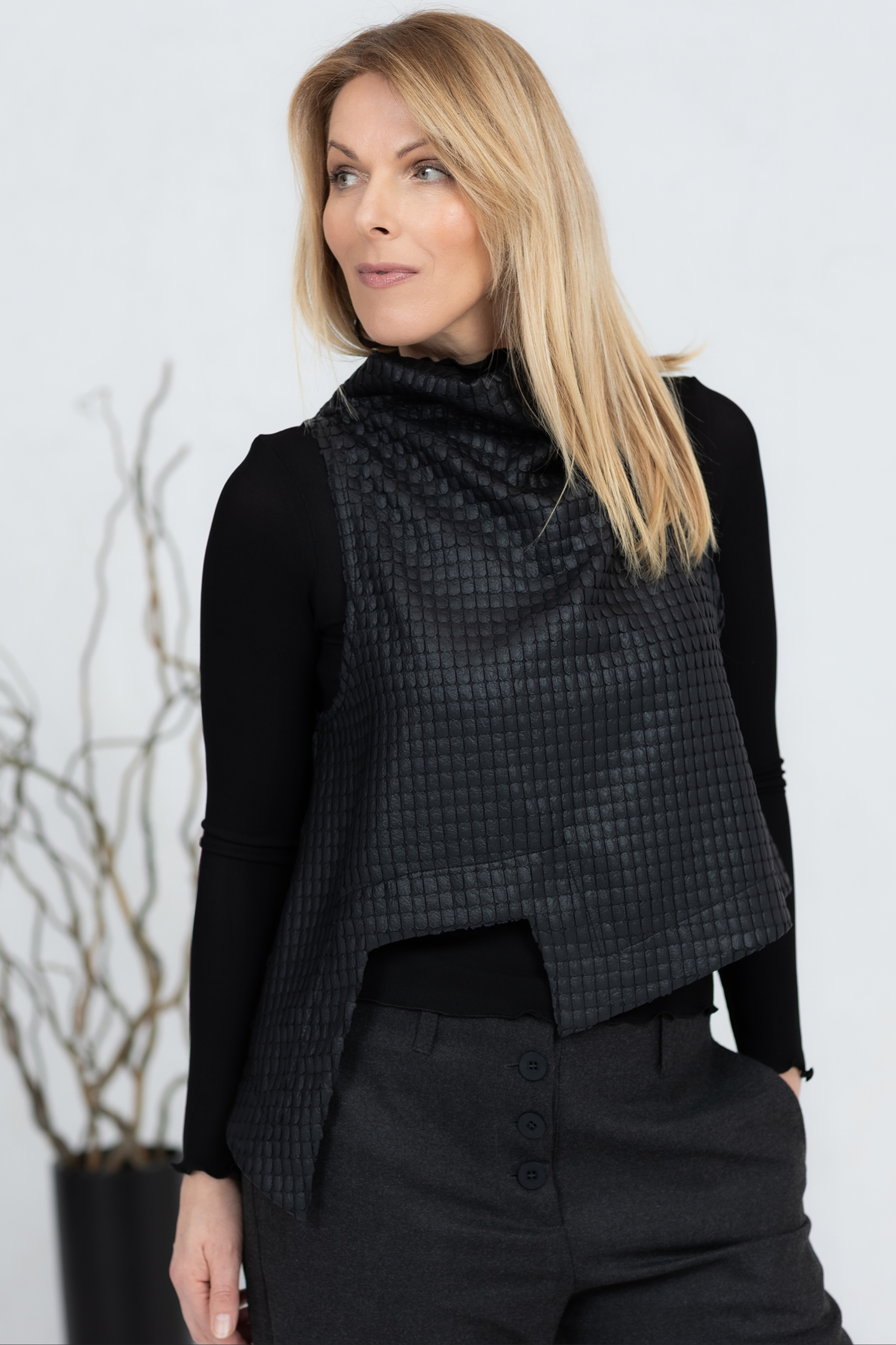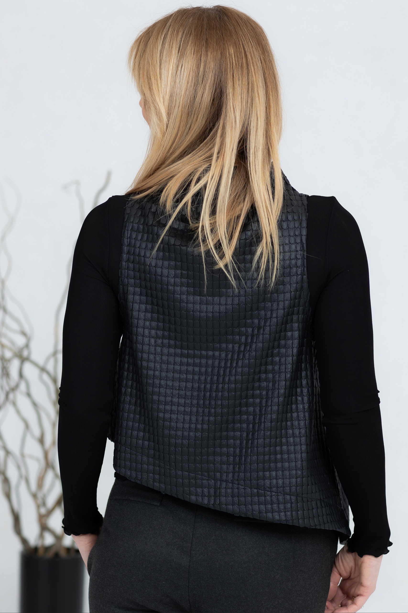 This leather-textured vest is a modern and versatile addition to your everyday wardrobe. The higher collar and asymmetric bottom hem create a dynamic silhouette that adds character to layered clothing. The straight cut of the vest allows it to be worn with a variety of blouses, dresses or shirts, always offering a new and fresh look. The material is pleasant and durable, ensuring the garment keeps its shape. It is the perfect choice for those who appreciate the balance between style and comfort.