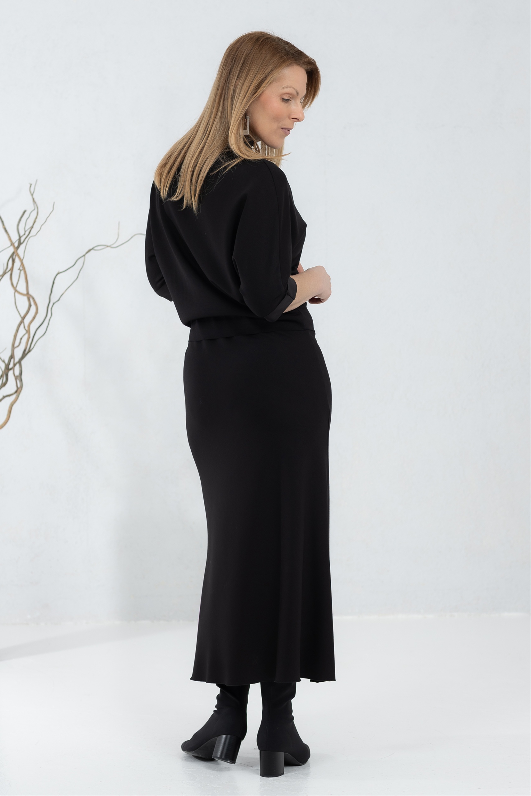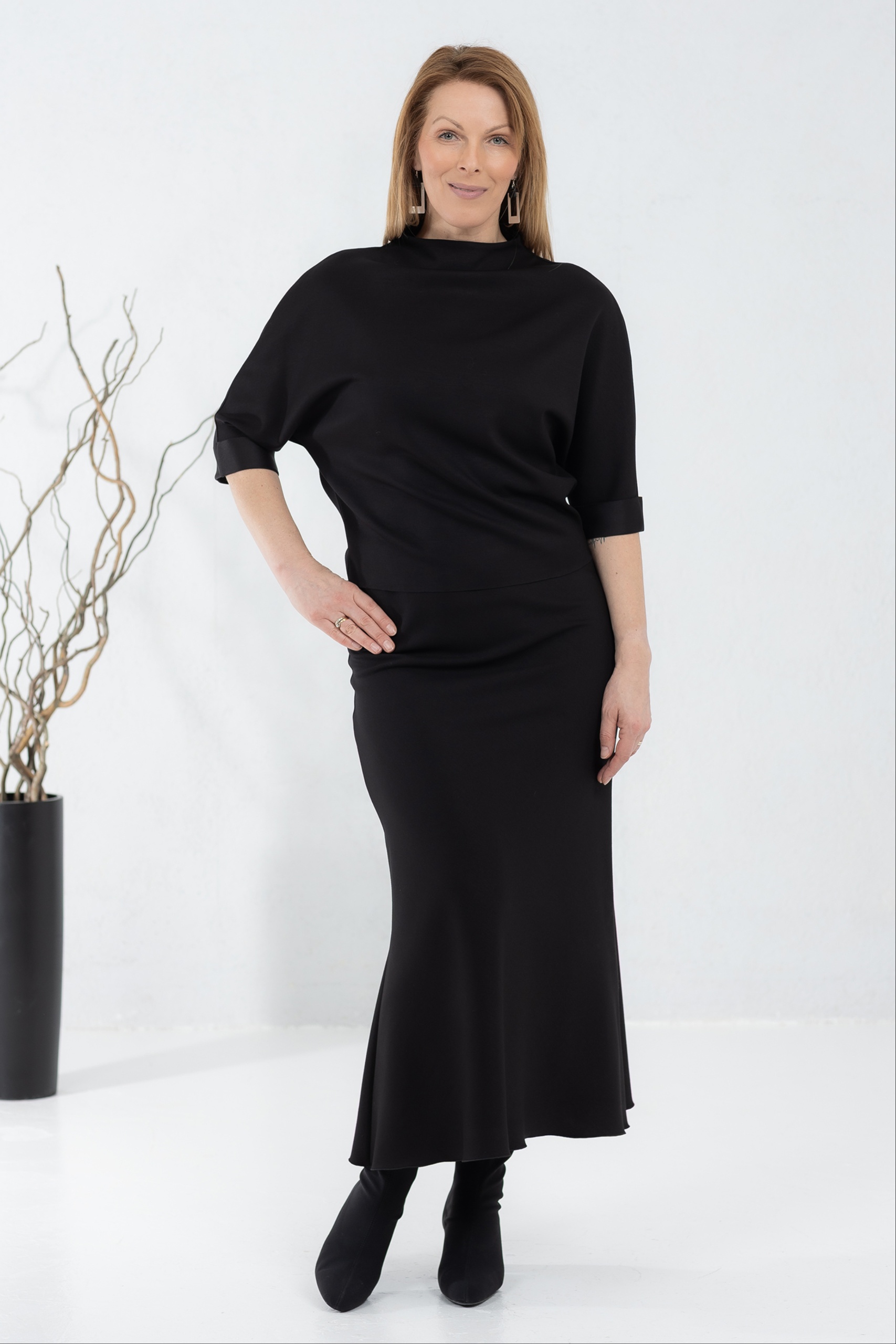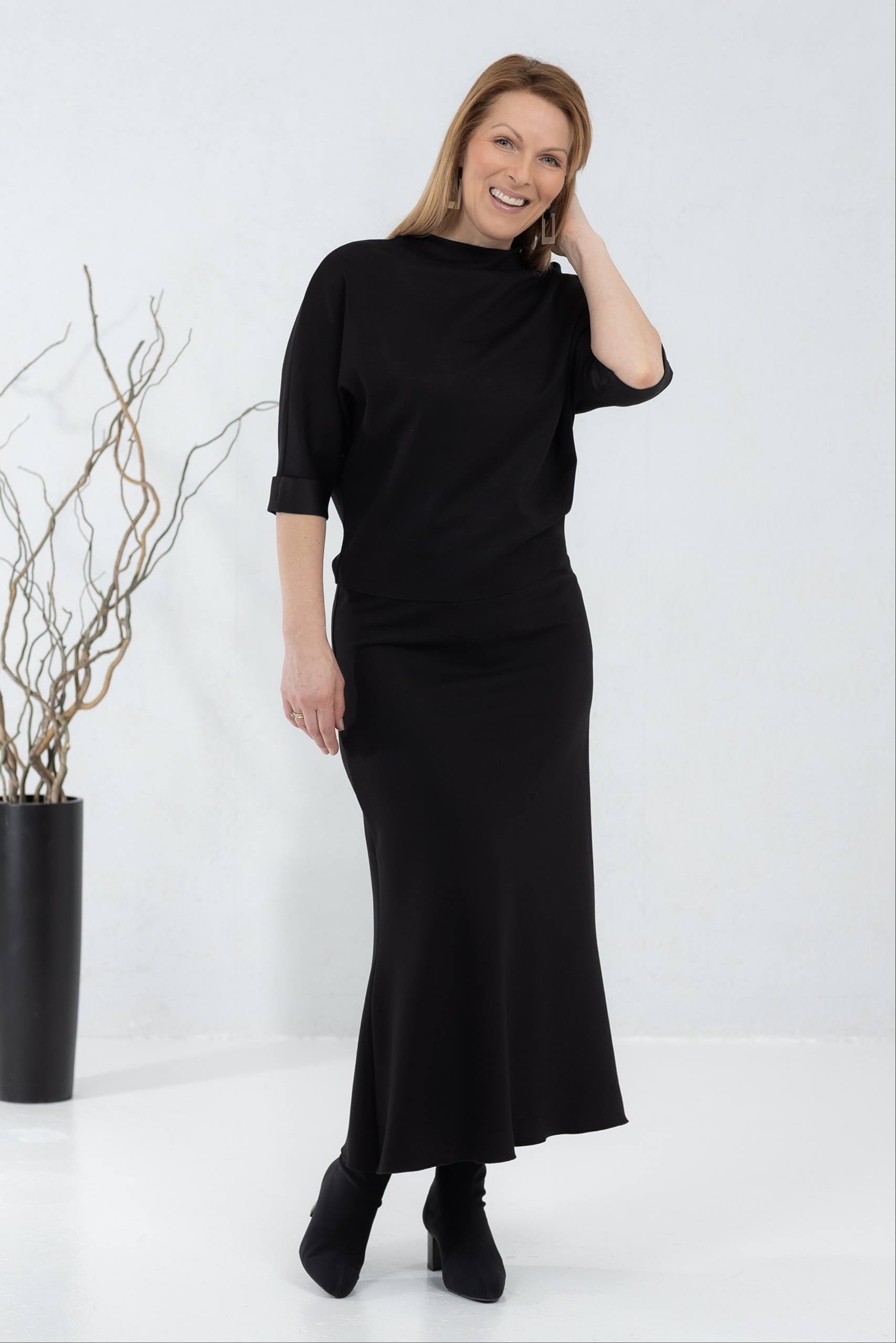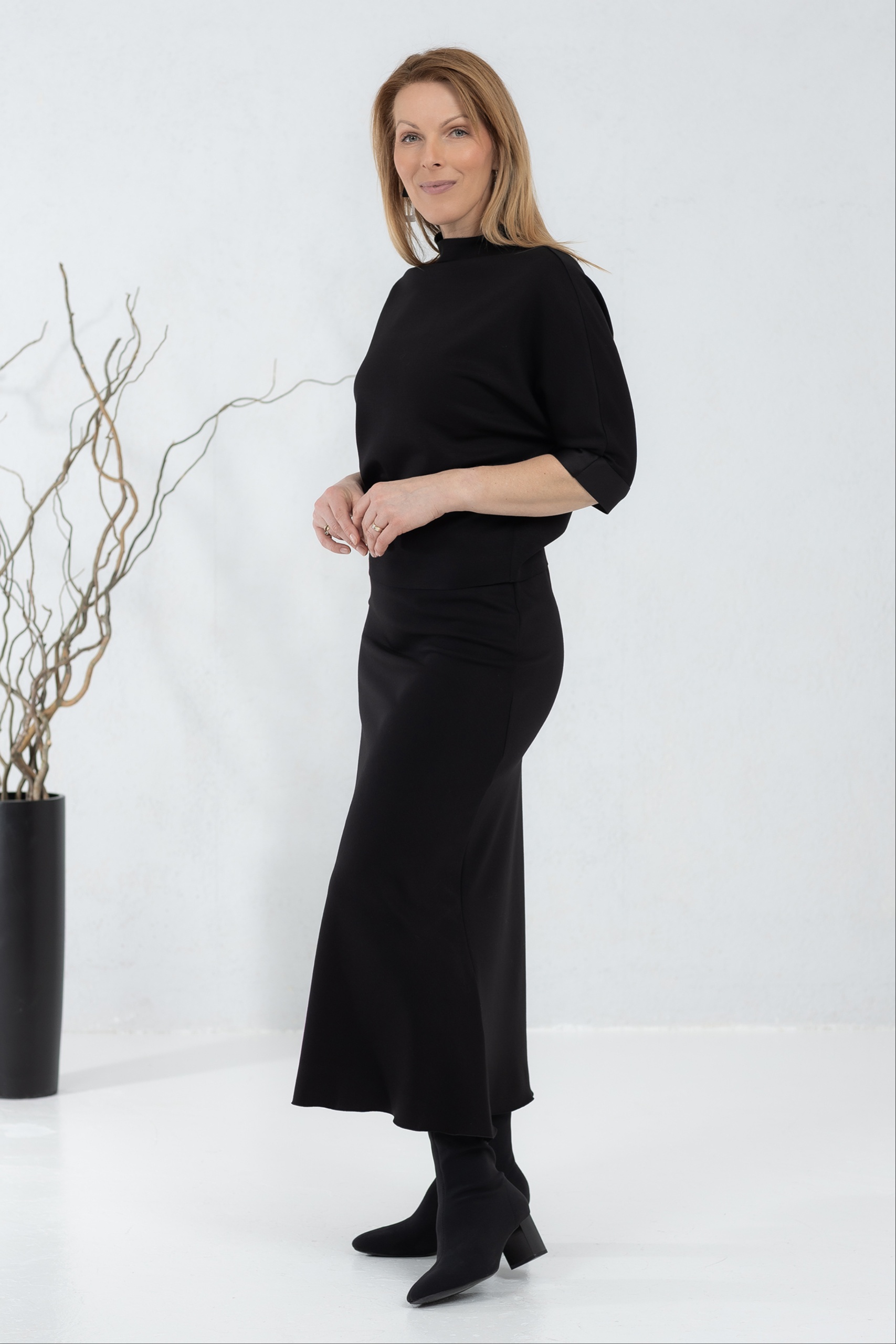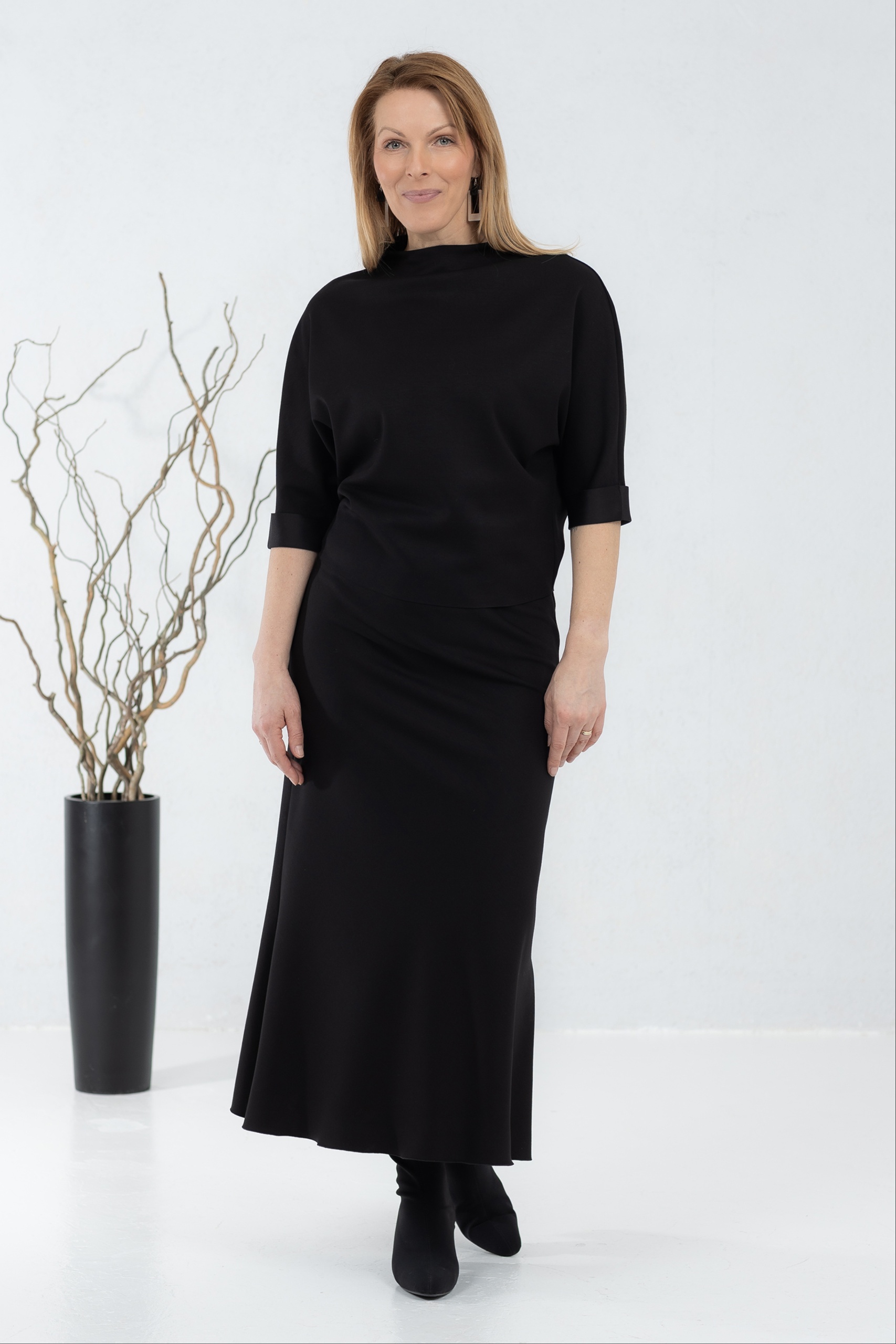 Tomi is an elegant and timeless skirt made from ultra-soft scuba viscose fabric that holds its shape beautifully and falls smoothly on the back. The slightly flared cut creates a feminine silhouette and adds a beautiful fluidity to movement. The thicker but stretchy material follows the figure while remaining exceptionally comfortable. The skirt does not wrinkle and maintains its correct appearance throughout the day. Pair it with a blouse or knit to create an impeccably chic ensemble for work or a more formal occasion.