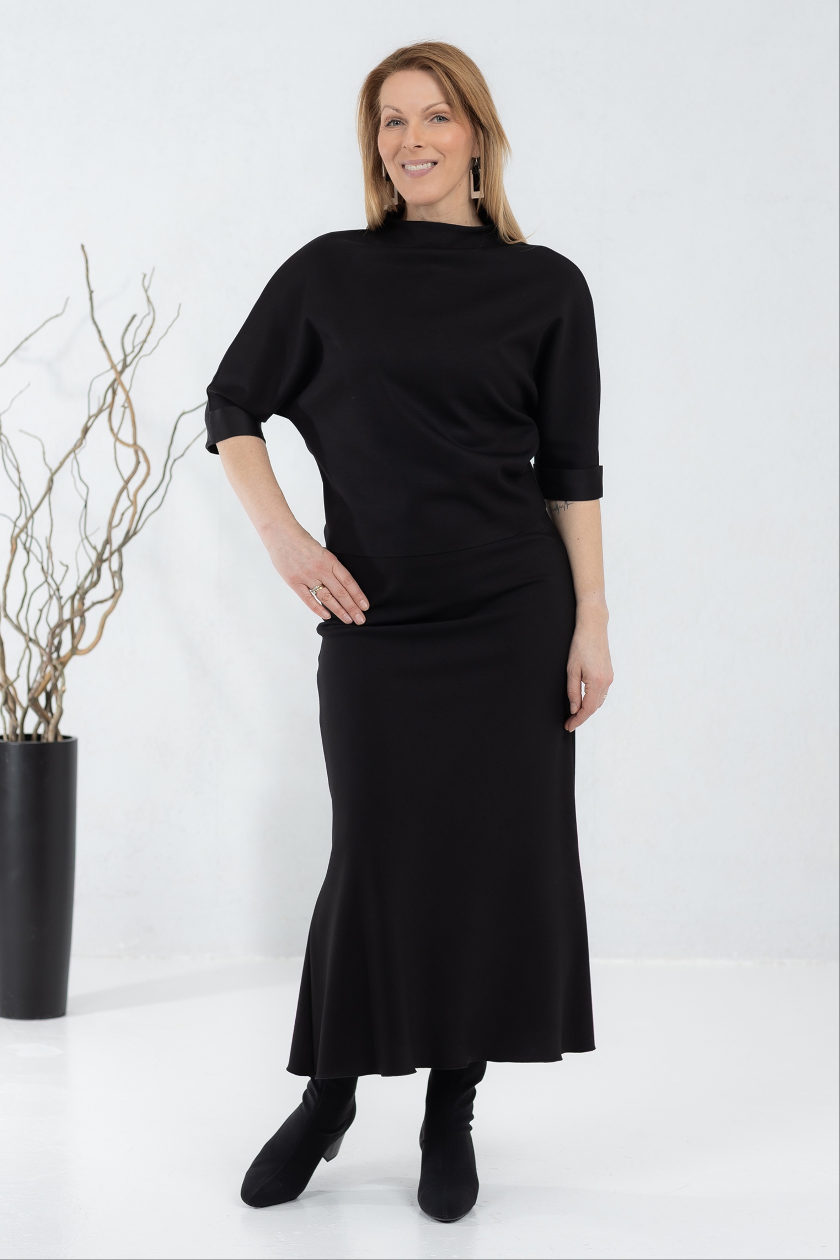This dress is made from a soft and cosy scuba fabric that is thicker, smooth and beautifully form-fitting. It is a stretchy jersey fabric that feels surprisingly soft and warm against the skin. The viscose adds breathability and silky softness, the polyester helps to maintain shape and the elastane provides comfortable freedom of movement. The fabric does not wrinkle easily and keeps its beautiful shape even after prolonged wear. The result is a luxuriously soft yet confidently form-fitting material that keeps you feeling good all day long.