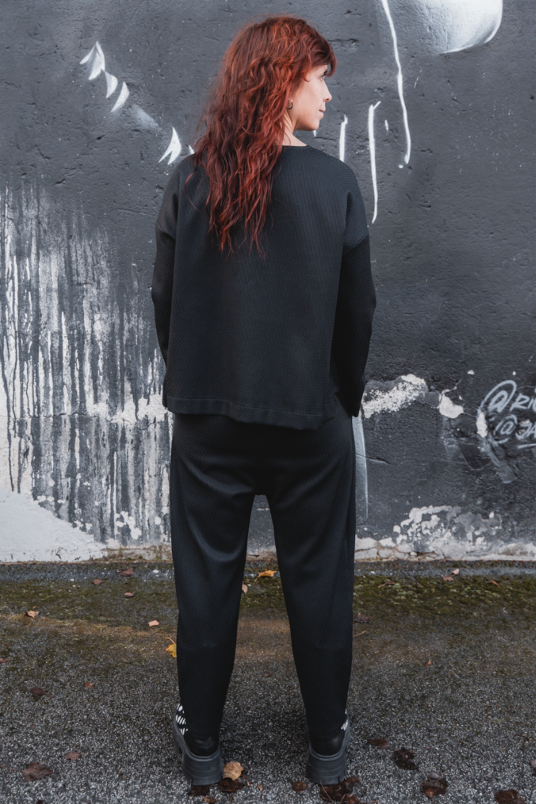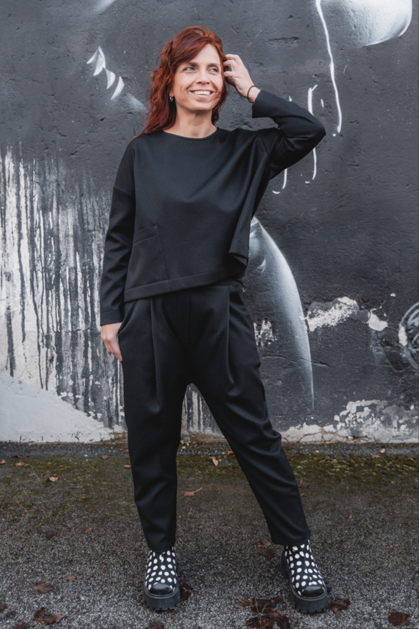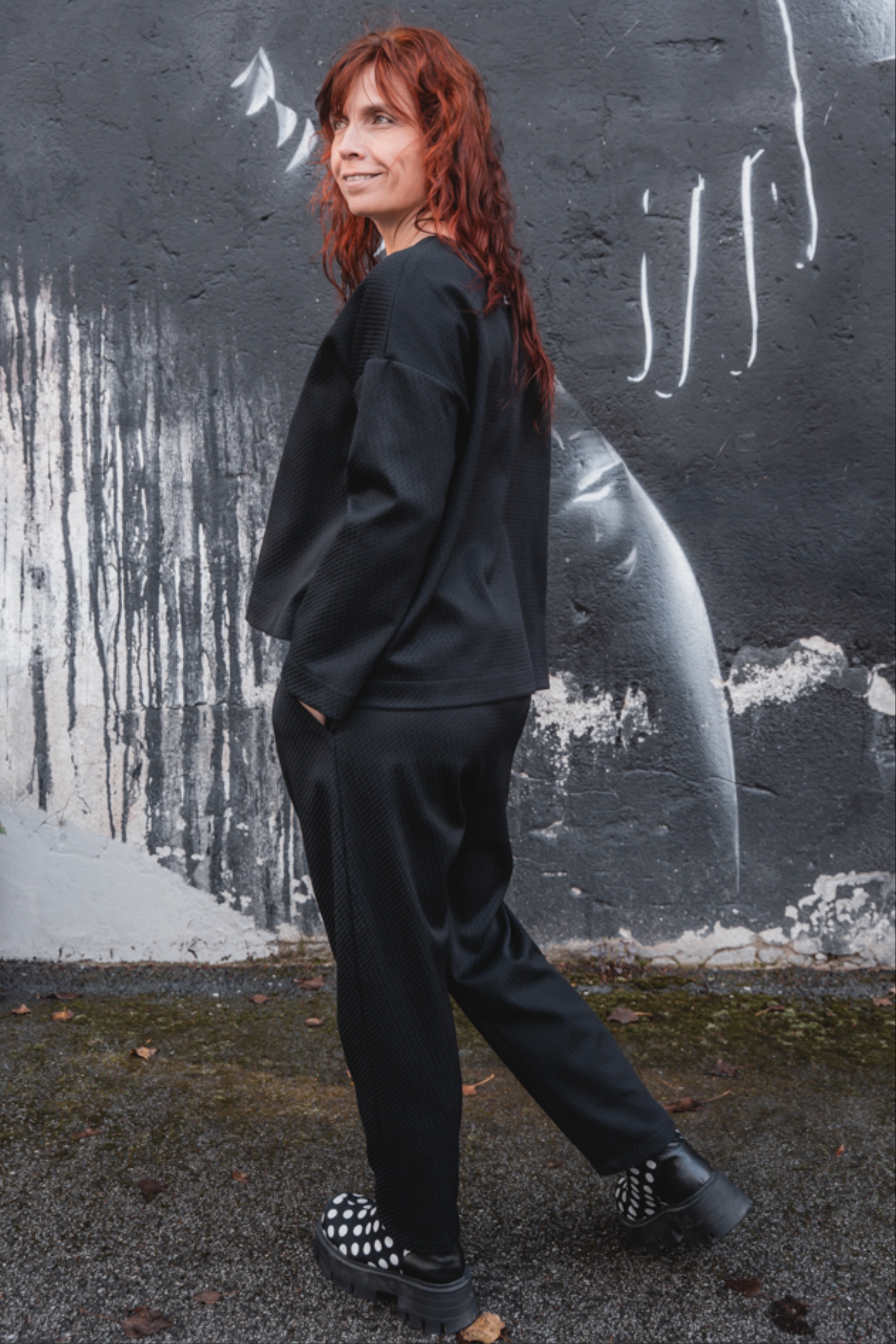 These minimalist trousers are comfortable and eye-catching. The open-cut urban design is perfect for work or weekend wear. The textured fabric adds a subtle touch to the classic black hue. Rubber hidden within the colour provides extra comfort and freedom of movement for all day wear. Practical pockets bring essential functionality without sacrificing elegance. Wear with a blouse in the same fabric or why not combine with your favourite top blouse.