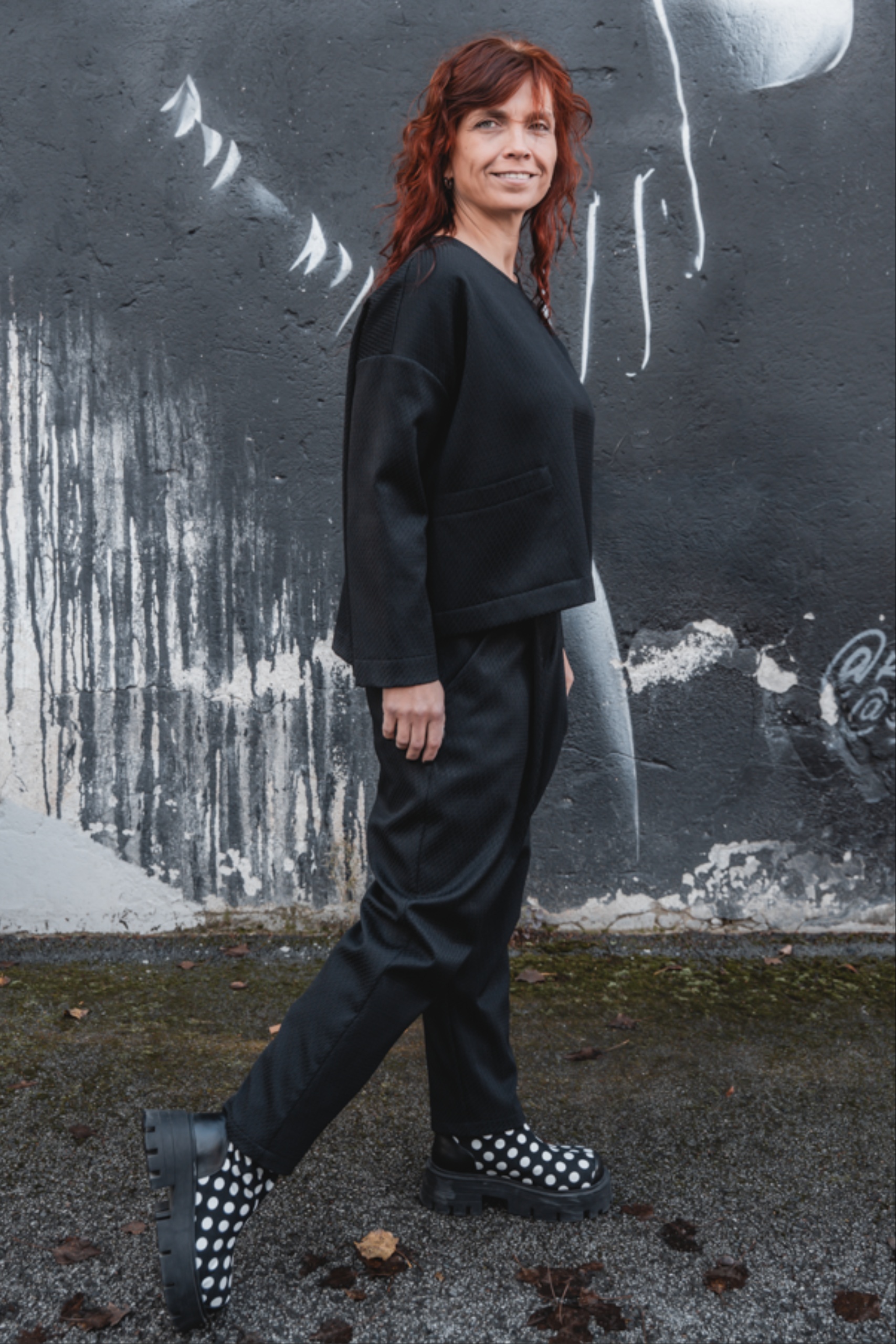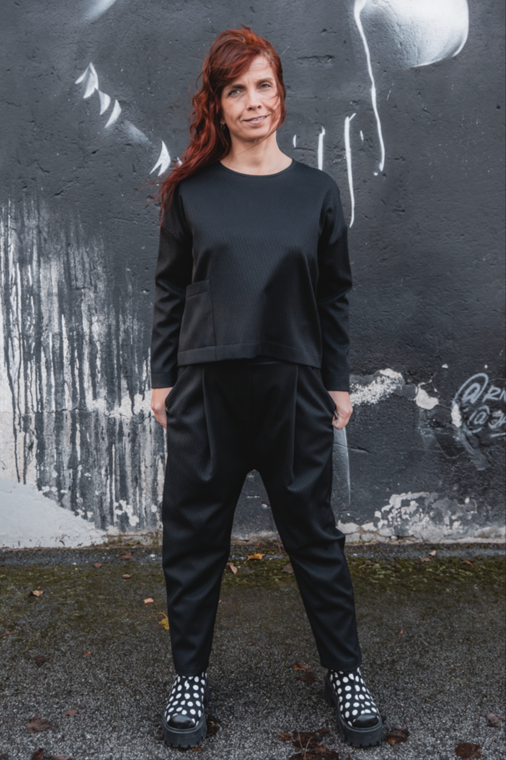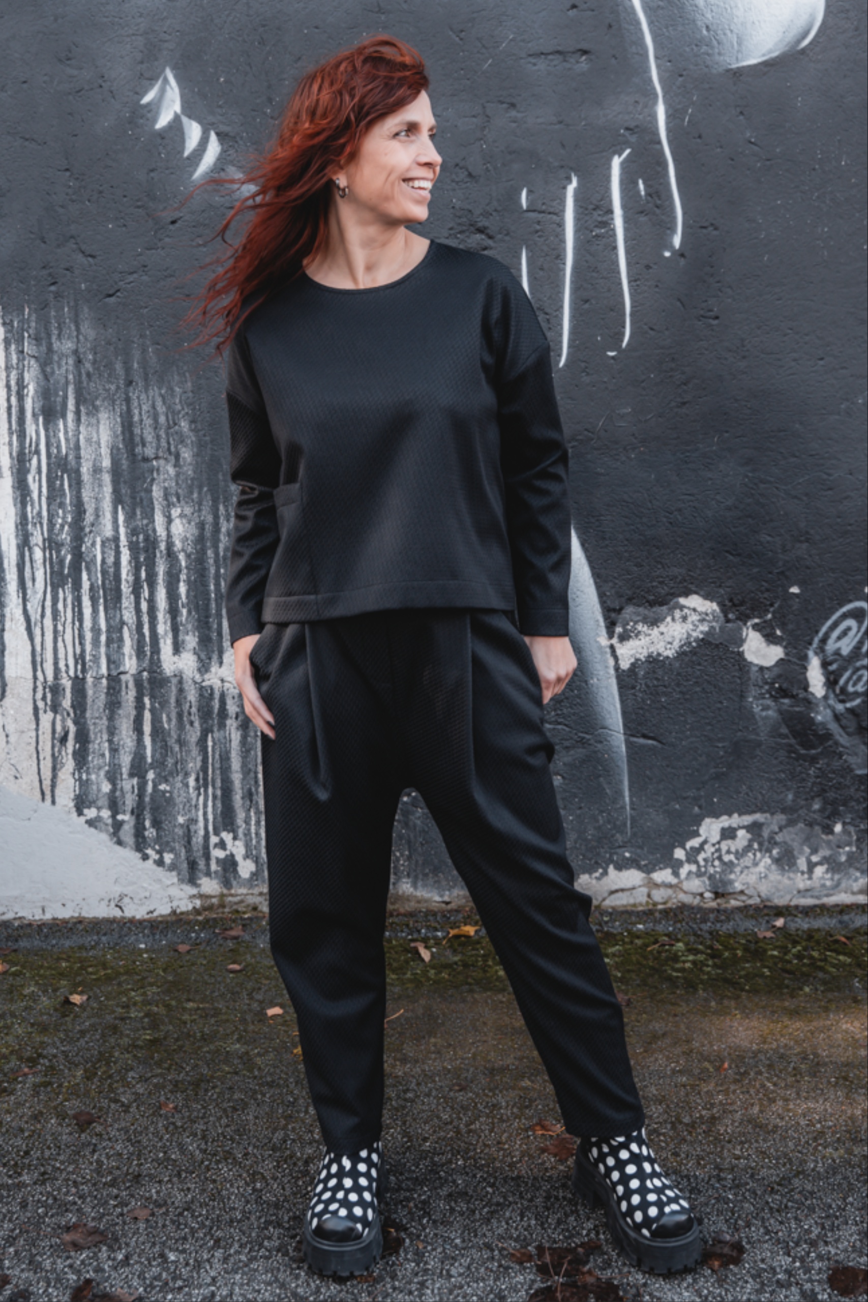 These minimalist trousers are comfortable and eye-catching. The open-cut urban design is perfect for work or weekend wear. The textured fabric adds a subtle touch to the classic black hue. Rubber hidden within the colour provides extra comfort and freedom of movement for all day wear. Practical pockets bring essential functionality without sacrificing elegance. Wear with a blouse in the same fabric or why not combine with your favourite top blouse.