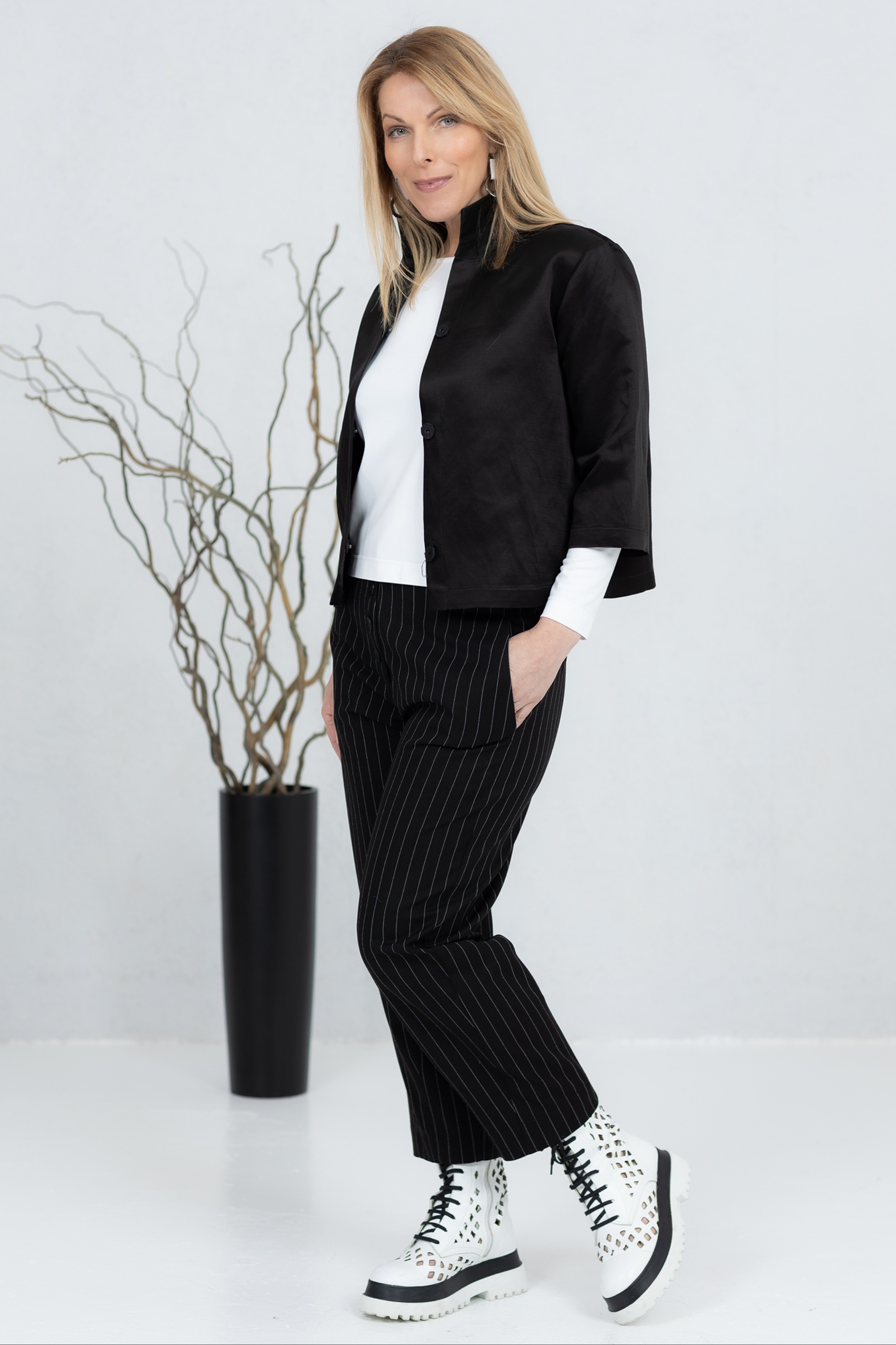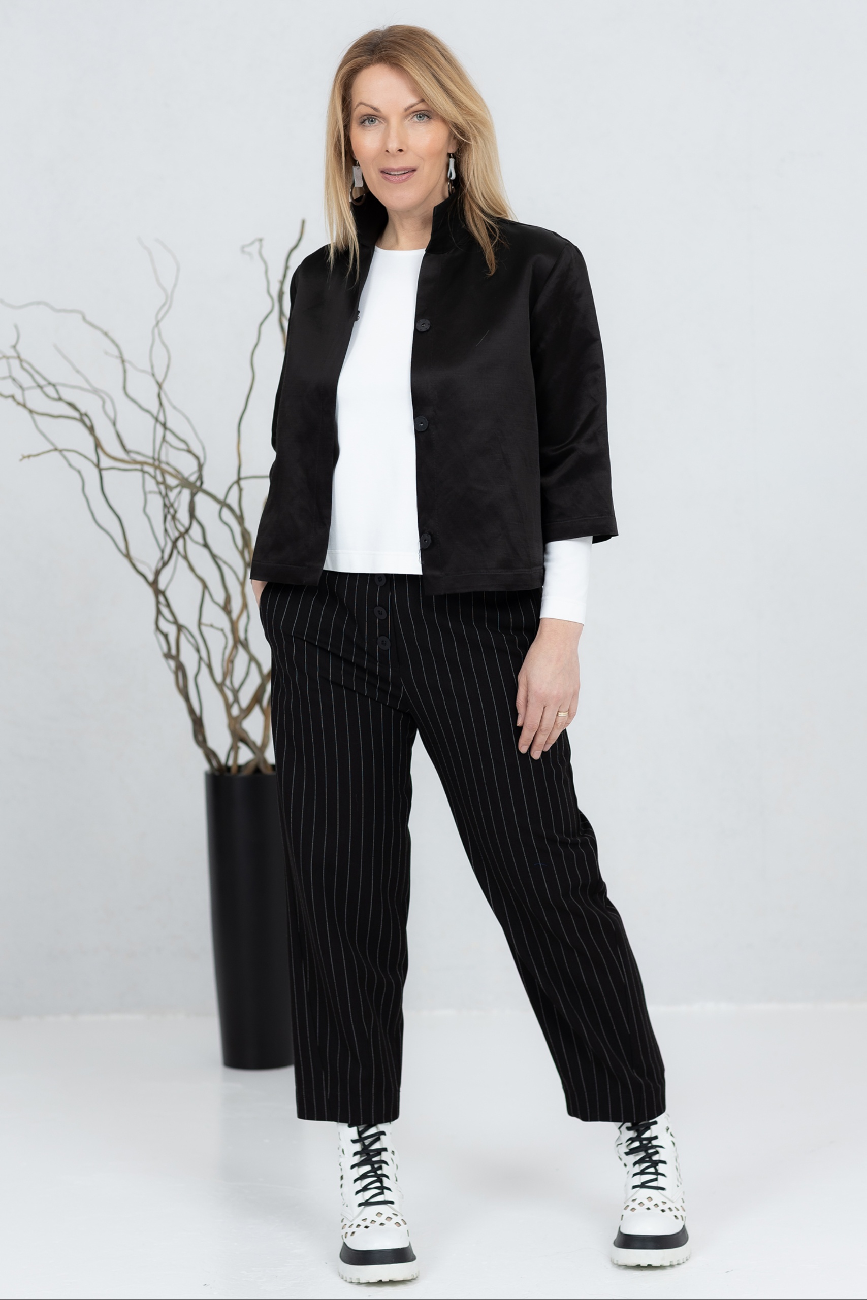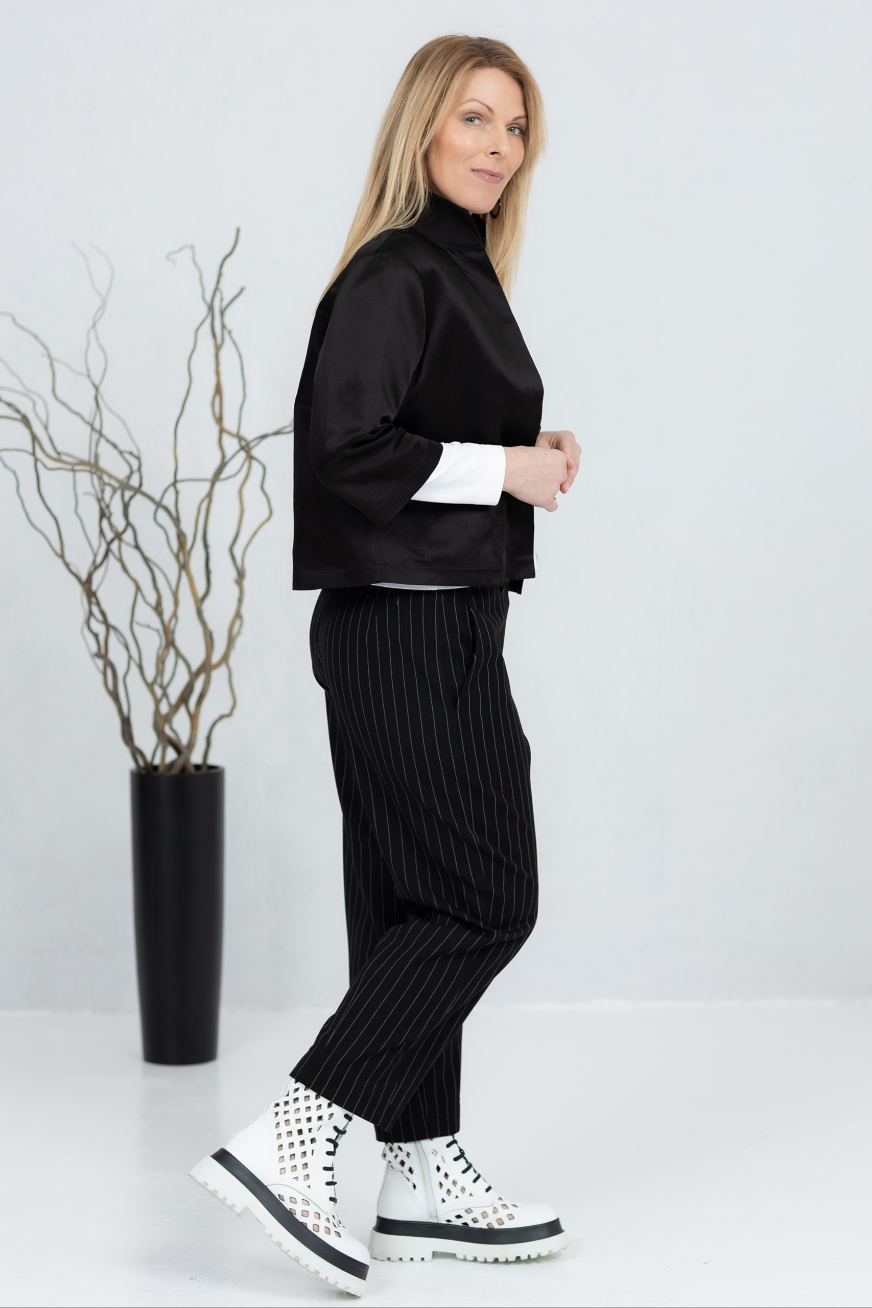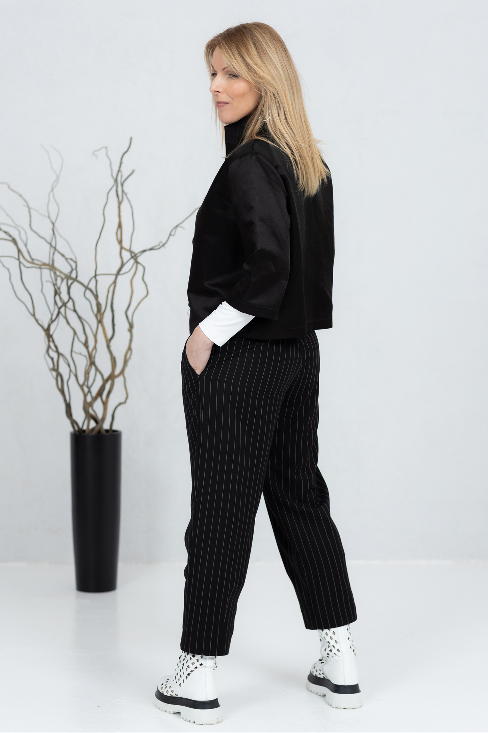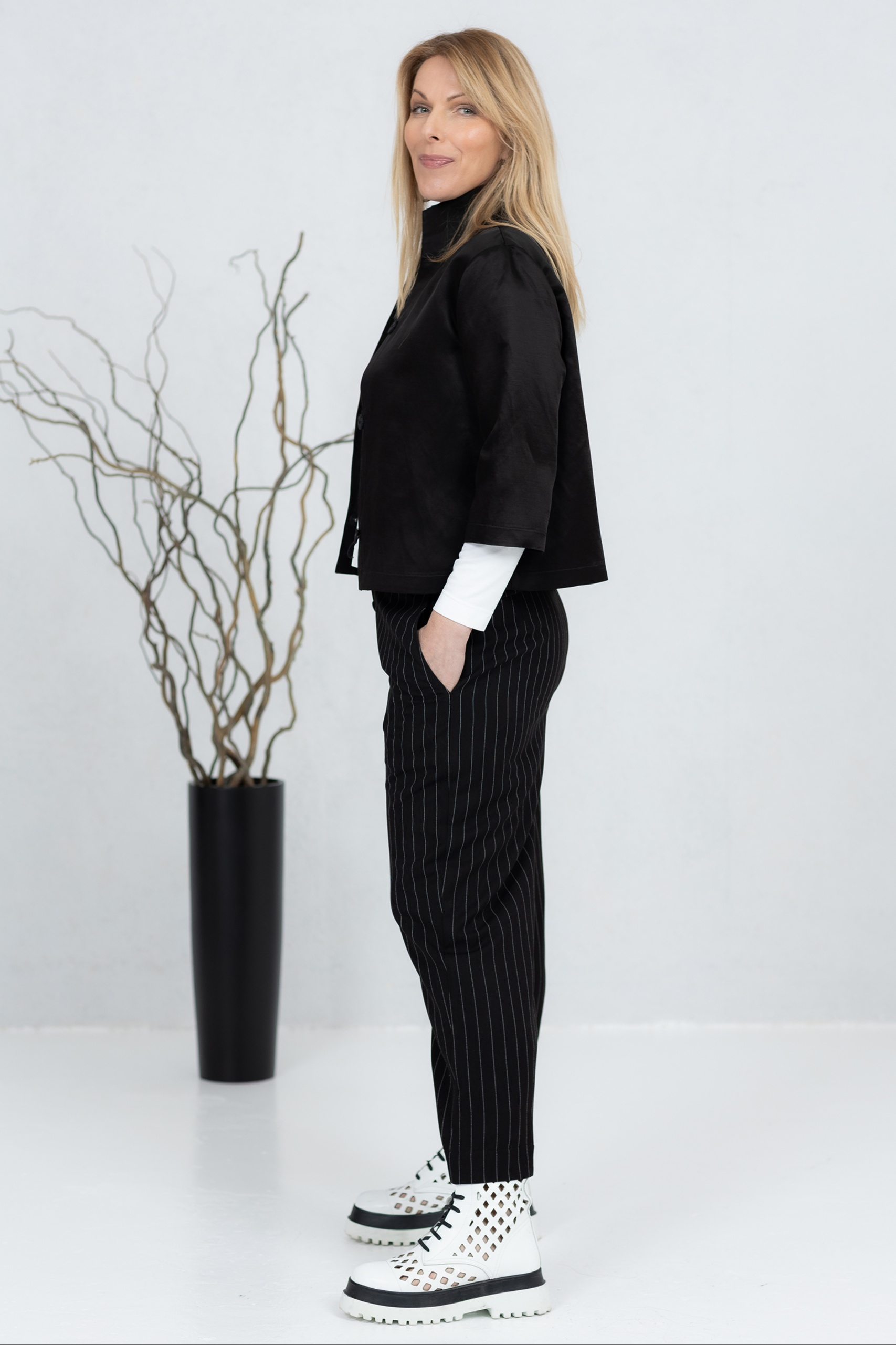These black trousers with a fine stripe combine classic style and modern comfort. The slightly loose fit ensures freedom of movement and is perfect for a variety of situations, whether in the office or at leisure. The front button fly adds elegance and practicality, creating a unique detail. Pair with your favourite blouse or jacket for a timeless and stylish look. Crafted from high quality materials for durability and easy care.