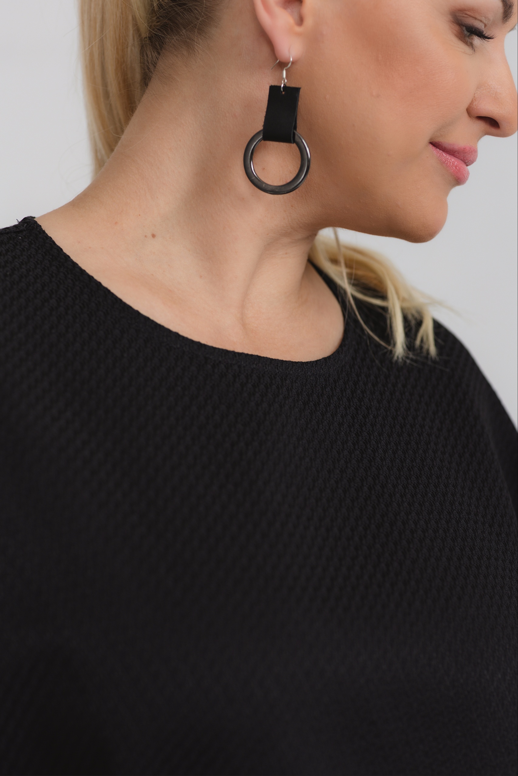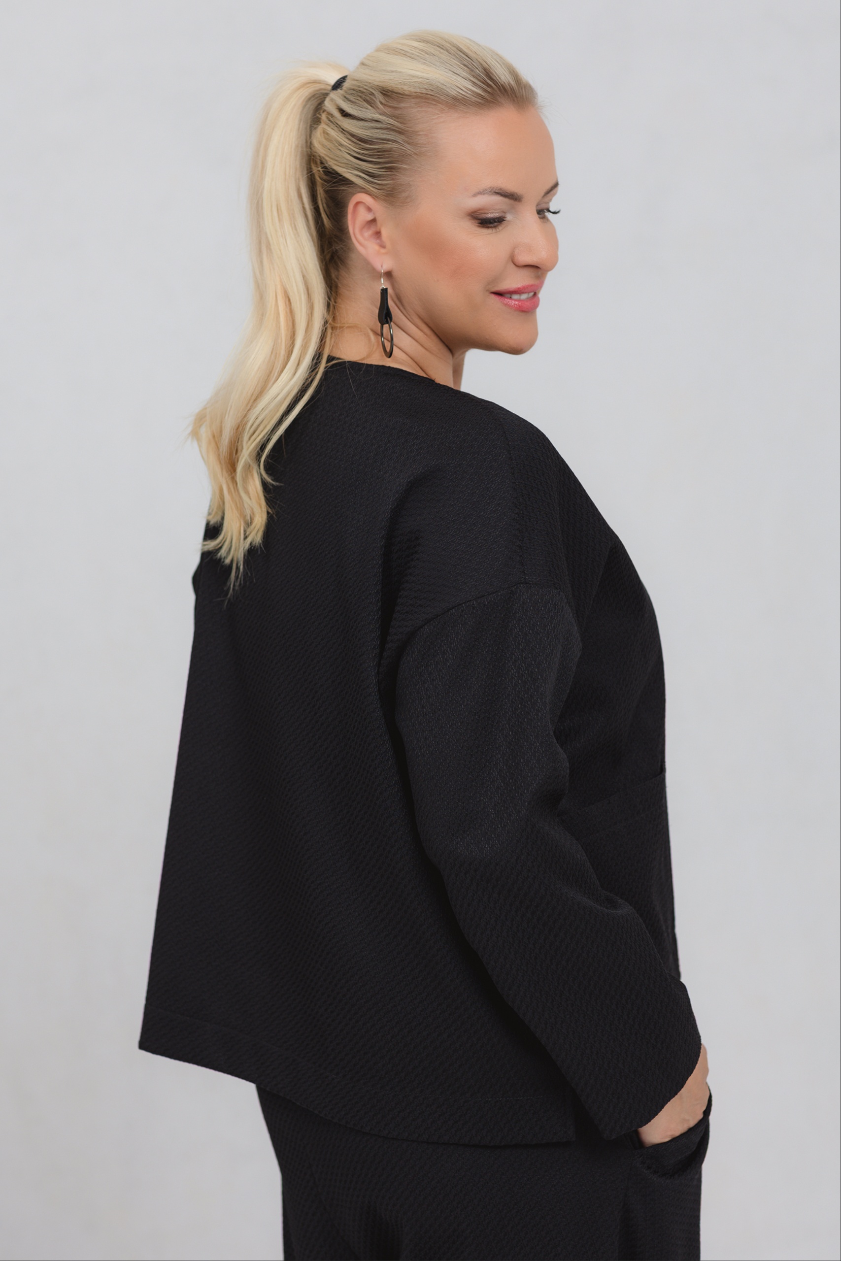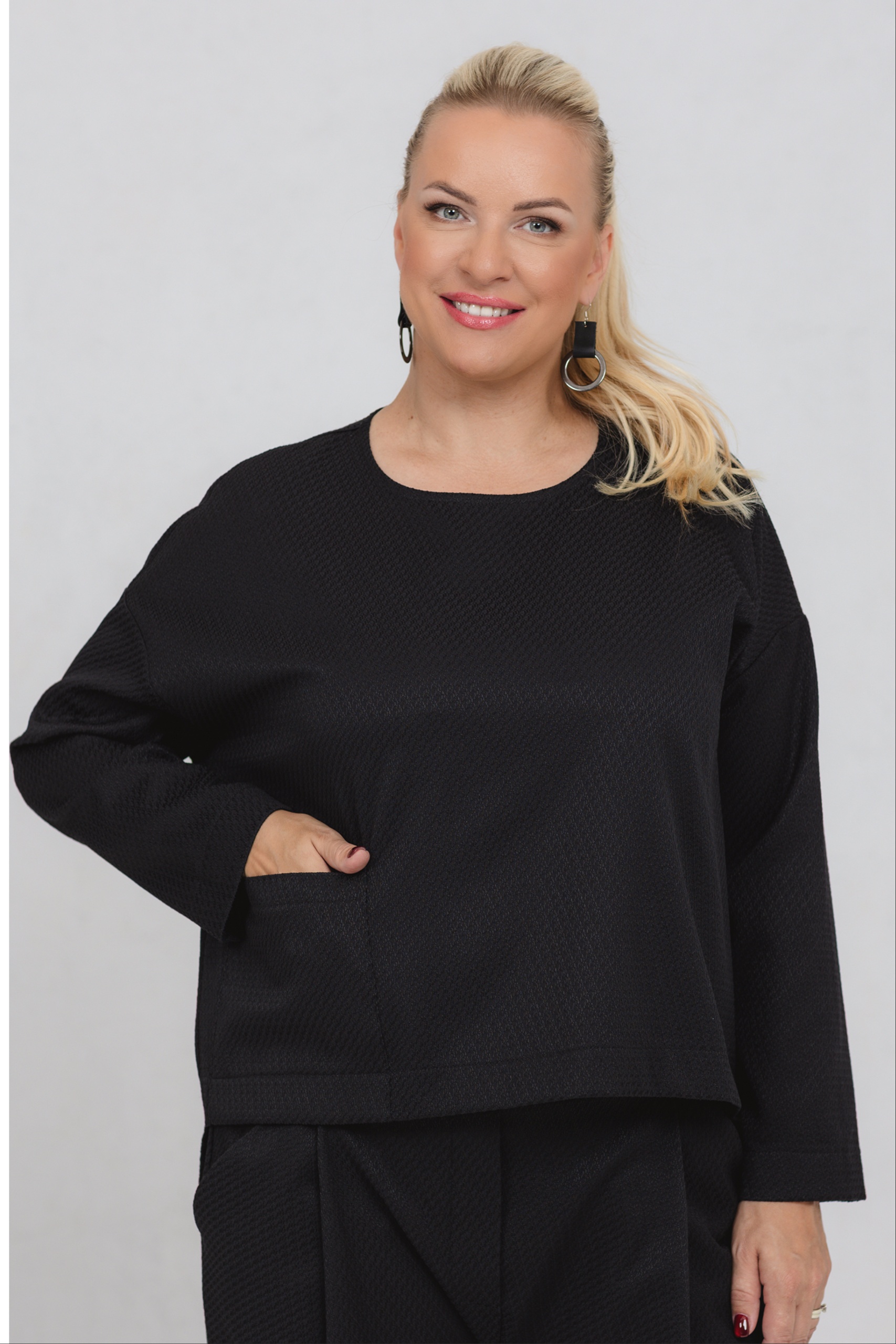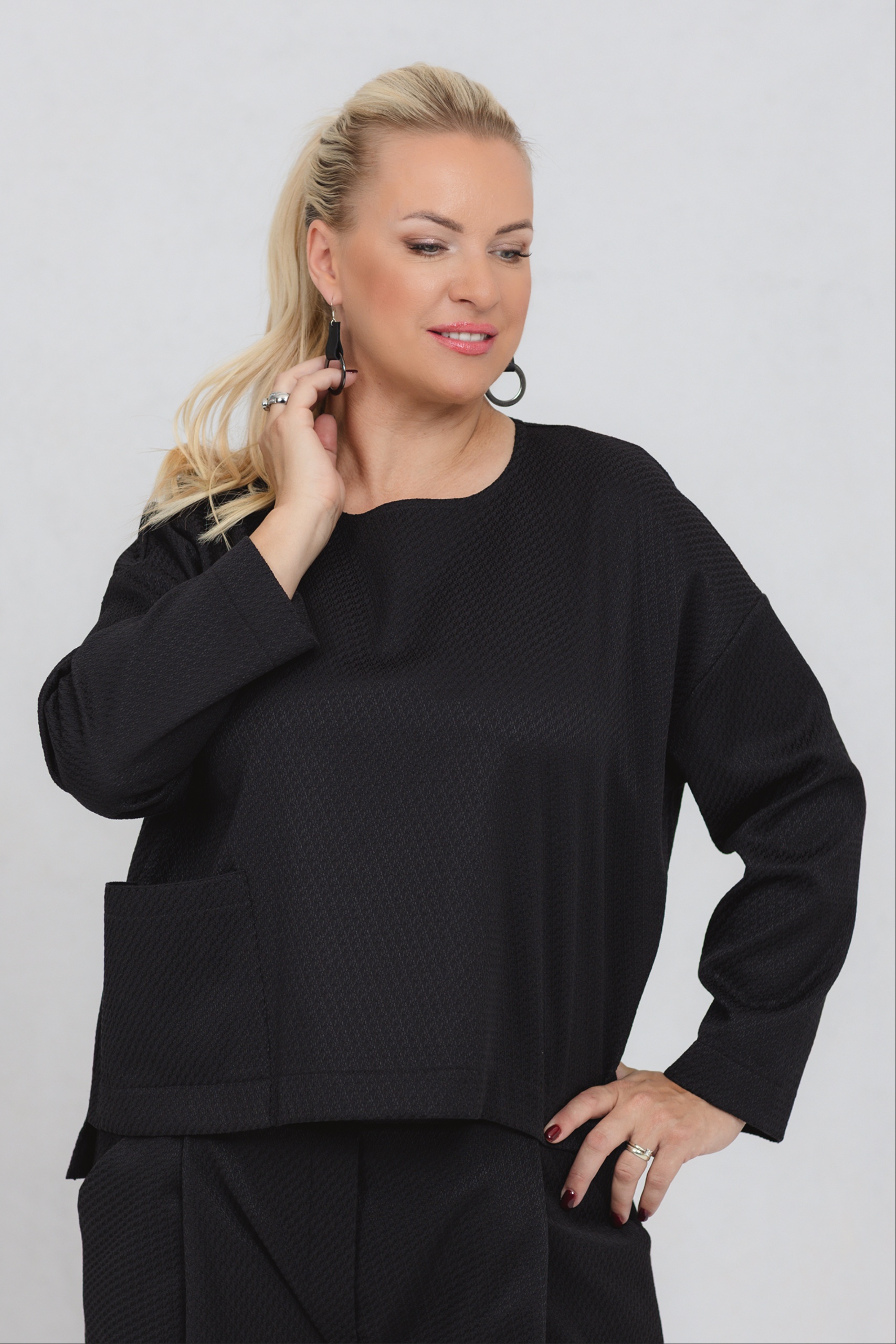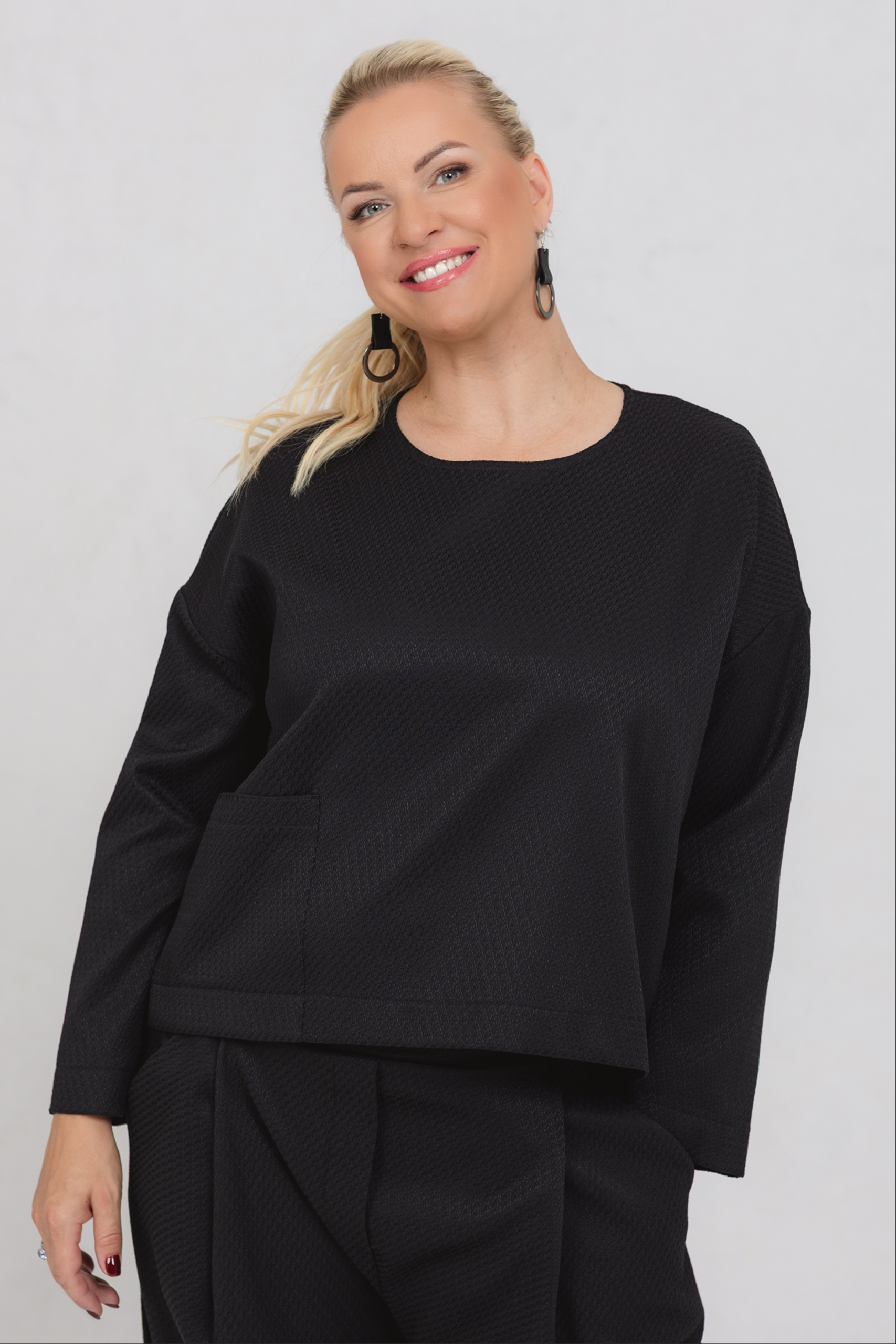 A blouse with minimalist lines, made special by a richly textured fabric. The loose fit offers freedom of movement and comfort for every day. The extended shoulder line and the exciting textured fabric add zest to classic black. This blouse can be worn with trousers from the same range or as a standalone favourite, easily matching any wardrobe.