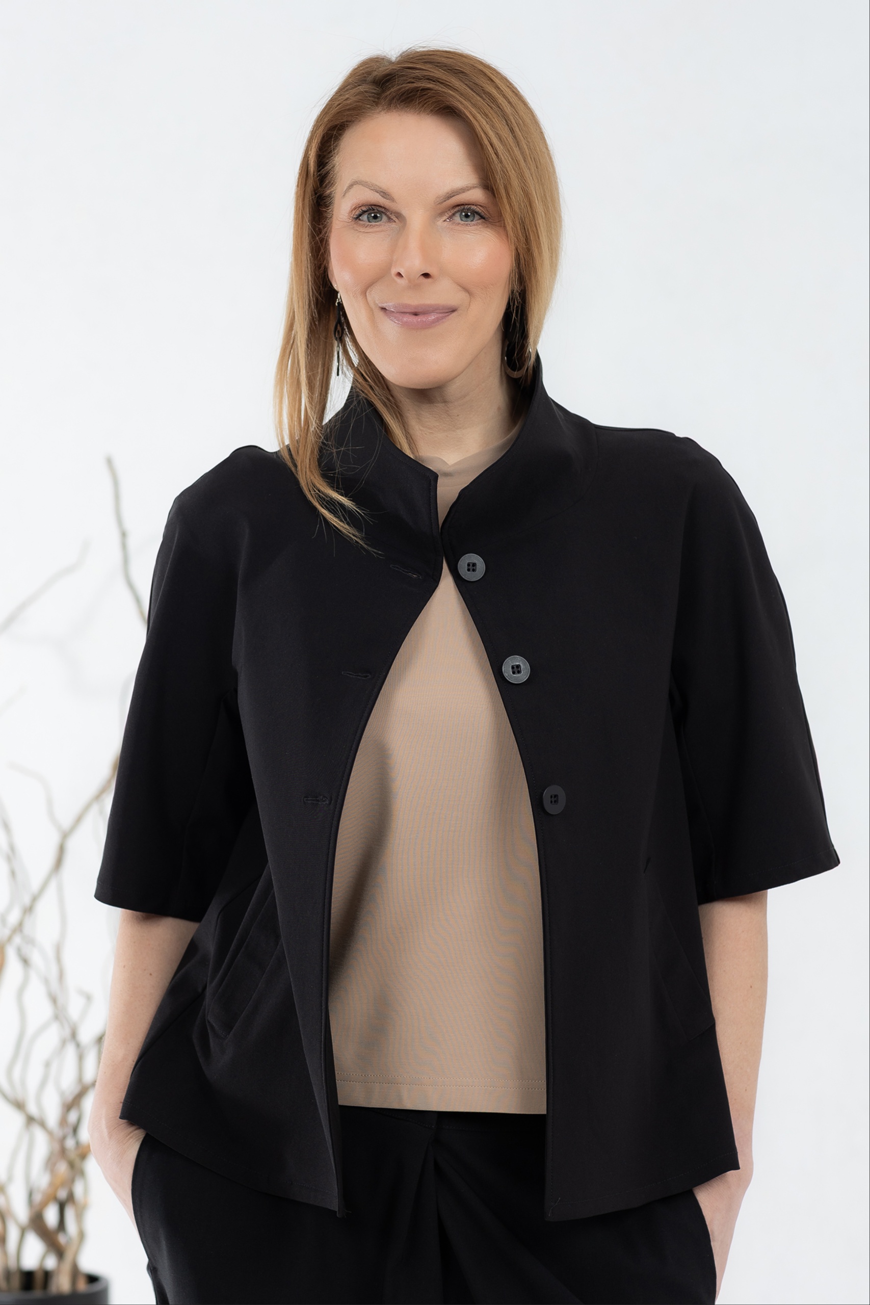 The Yotaka jacket is a comfortable and eye-catching extra layer that brings character to your outfit. The classic black colour and slightly flared cut create a beautiful and natural silhouette that is easy to match with different outfits. A higher collar and button fastening give the jacket a stylish touch, while pockets add practicality. The pleasantly form-fitting fabric makes this jacket a good companion for everyday wear as well as for special occasions.